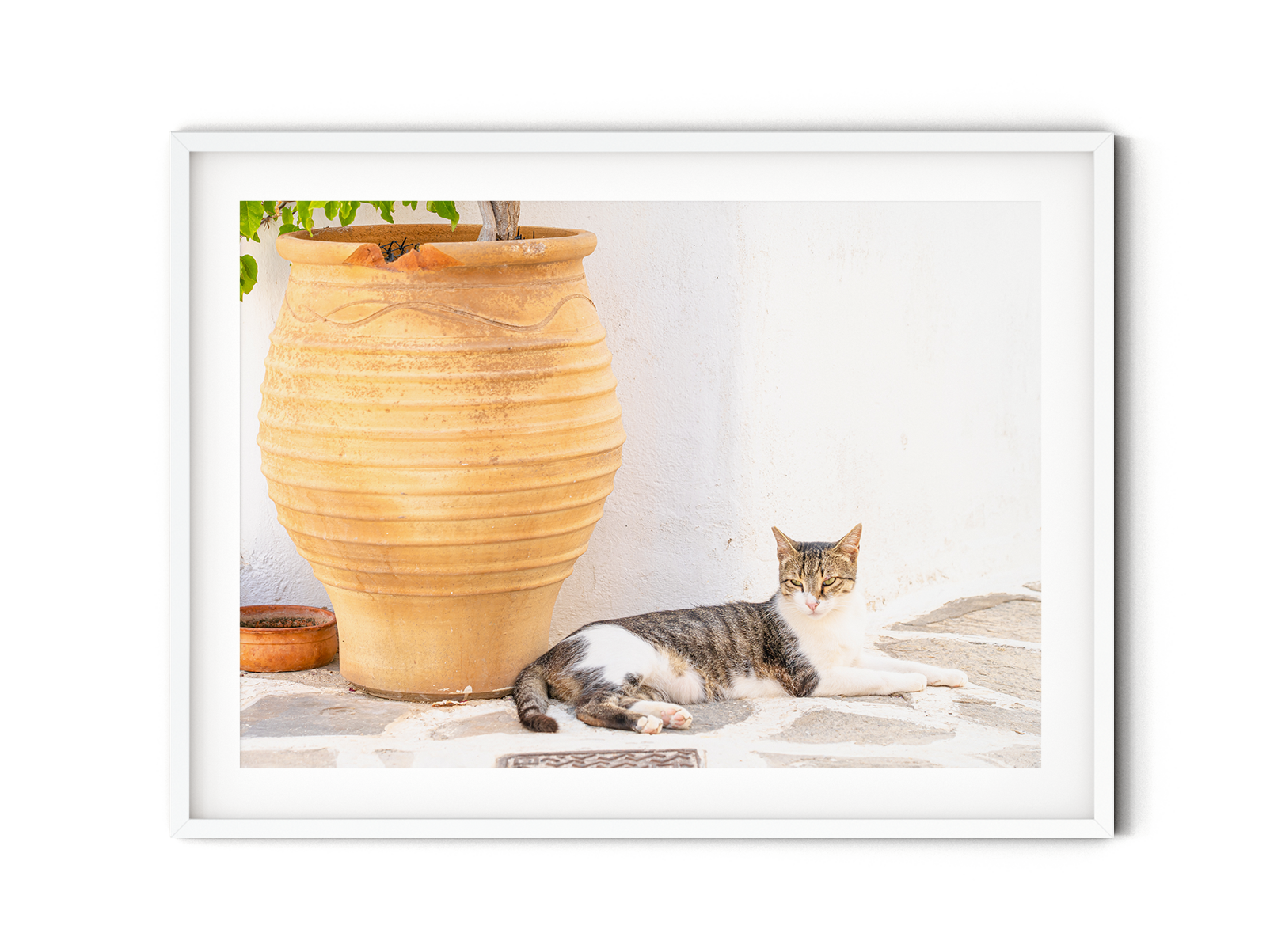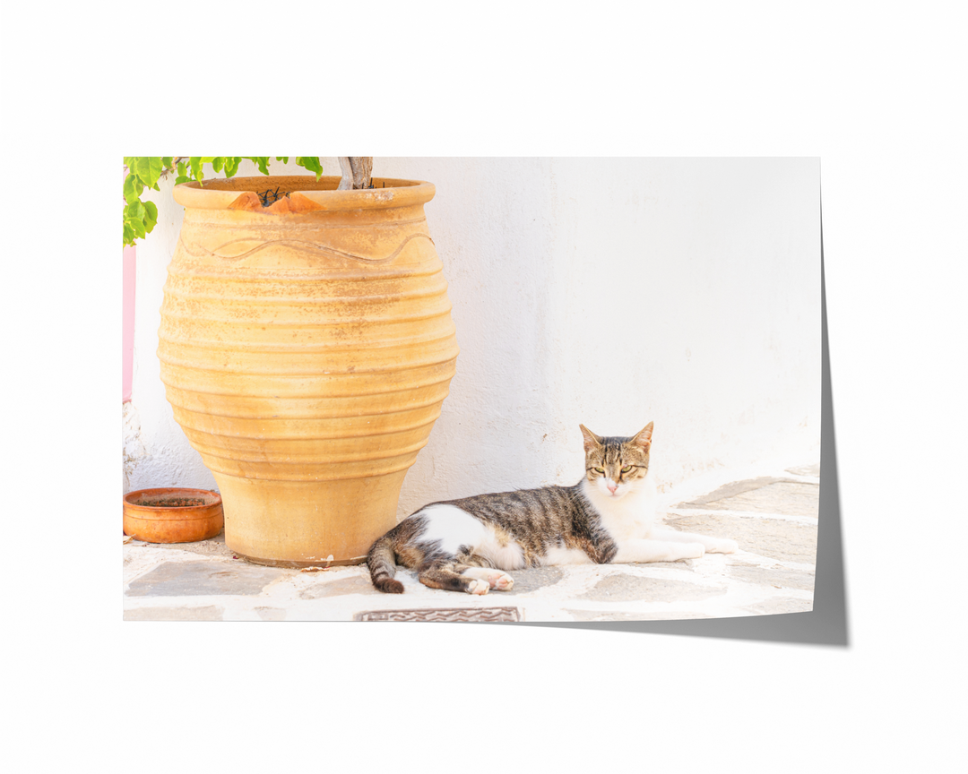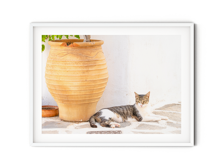 Transport yourself to the tranquil lanes of the Greek Islands with this captivating travel photography print. Featuring a charming scene of a cat leisurely resting next to a terracotta pot on the enchanting island of Paros, this print effortlessly captures the laid-back ambiance of Greece. Perfect for cat enthusiasts and those who cherish the allure of Greek culture, this travel print is a delightful addition to your collection, infusing your space with the serene charm of the Mediterranean.