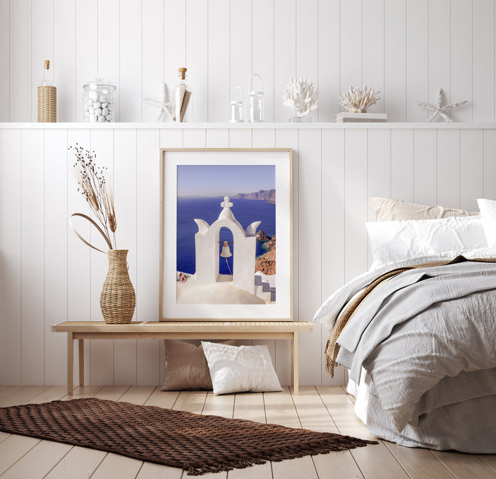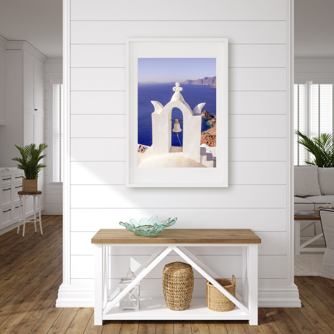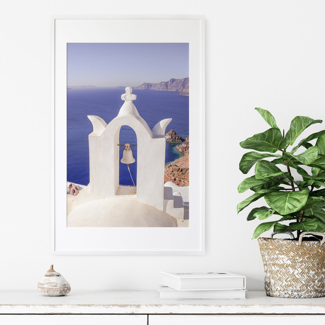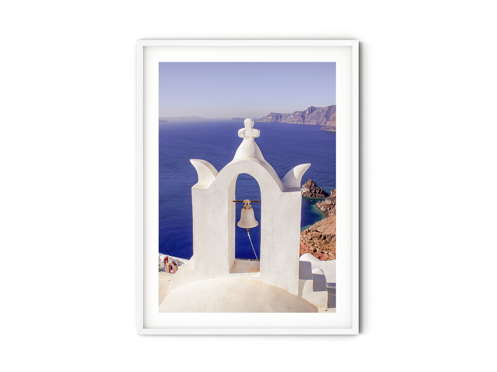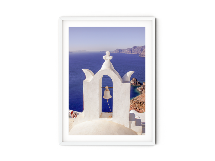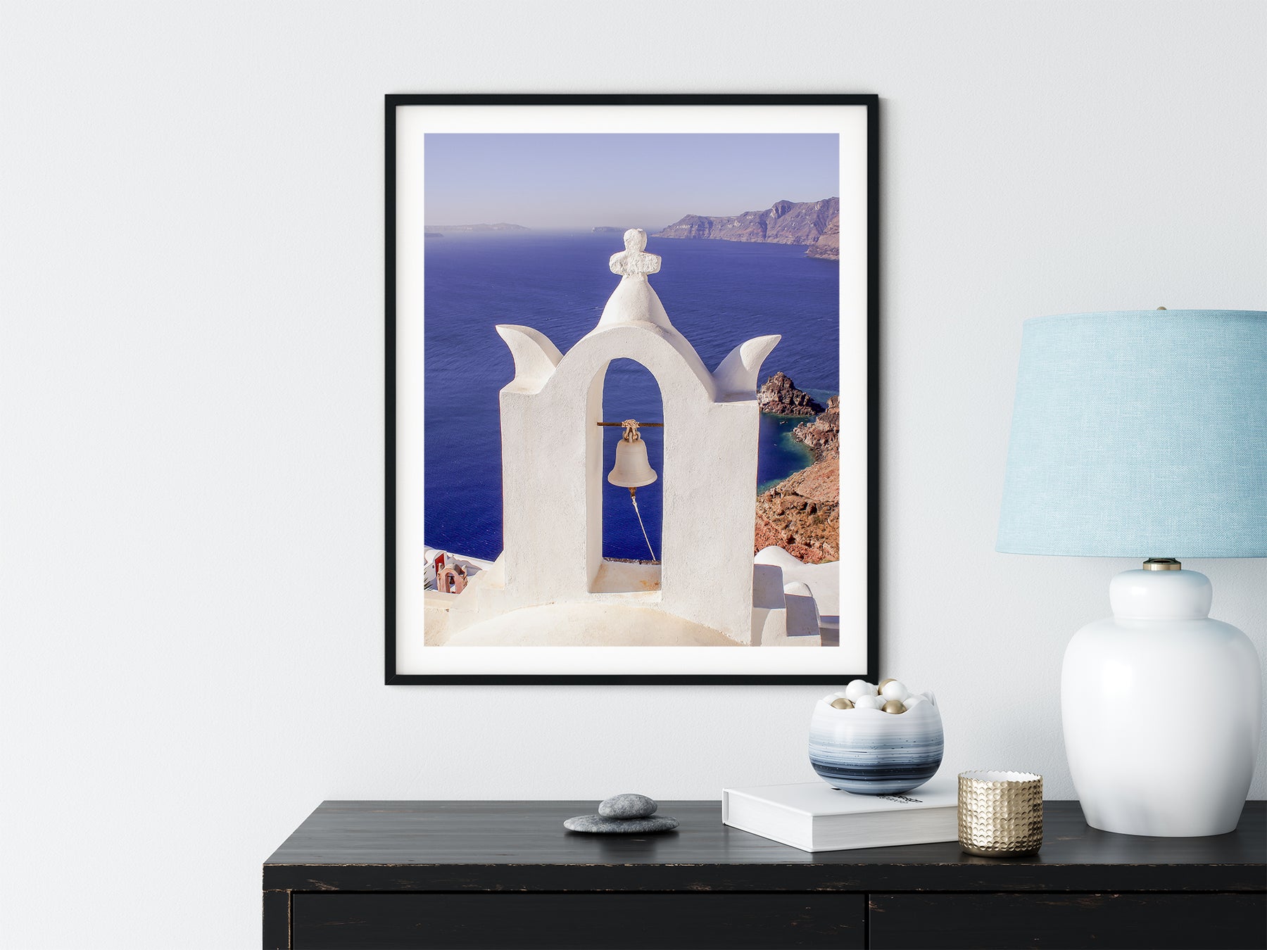 This fine art photography print captures the timeless beauty of Santorini, nestled in the heart of the Cyclades. The iconic Greek bell tower, a symbol of tradition and grace, rises against the backdrop of the Mediterranean Sea. With its white-washed walls and azure domes, this Greek Orthodox church embodies the essence of the Greek islands. Transport yourself to this idyllic paradise, where history meets tranquility. Whether you've strolled Santorini's streets or long to explore its charms, this print brings the island's magic to your home. It's a captivating addition to any decor, infusing your space with the serenity and allure of the Greek islands.