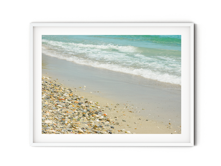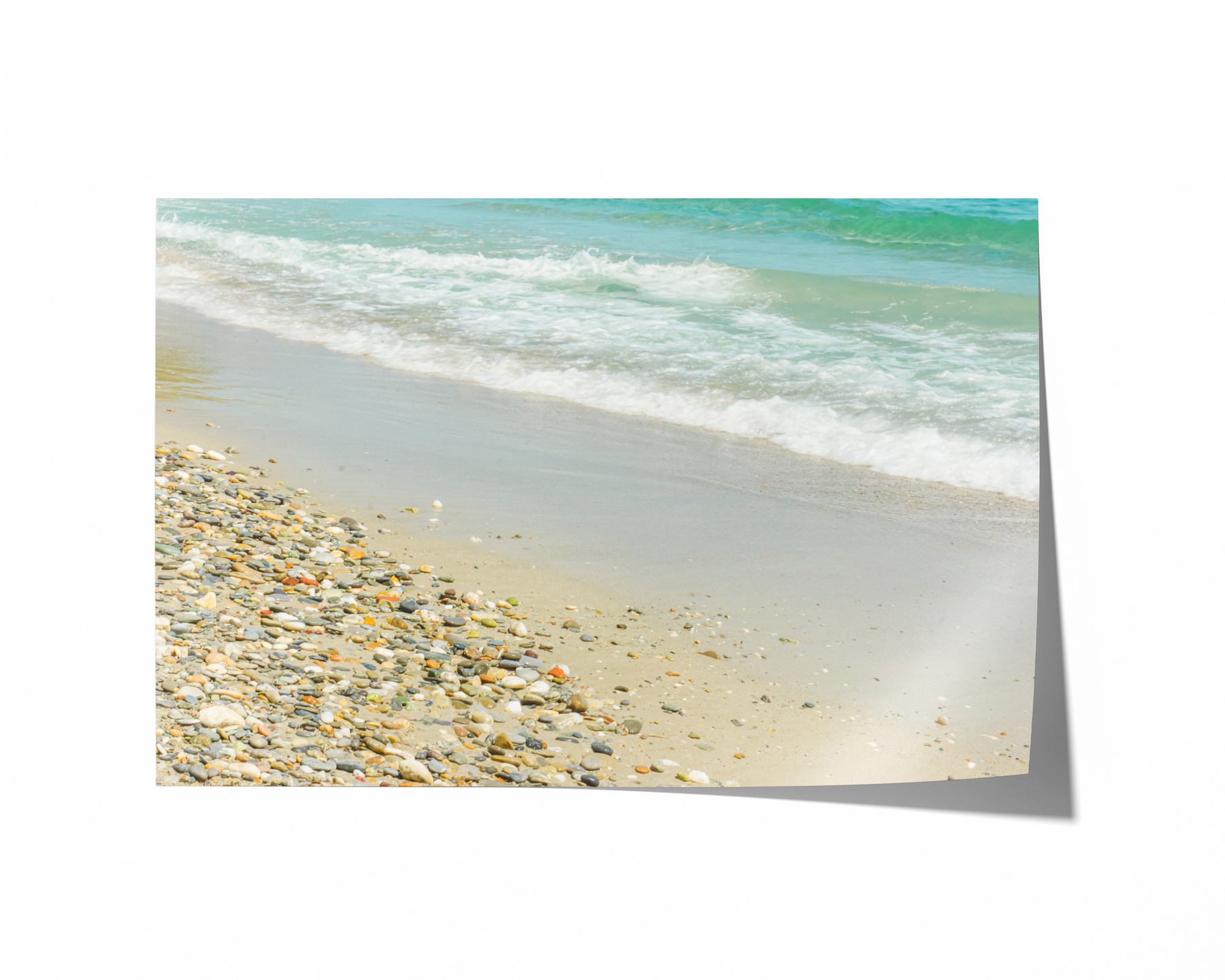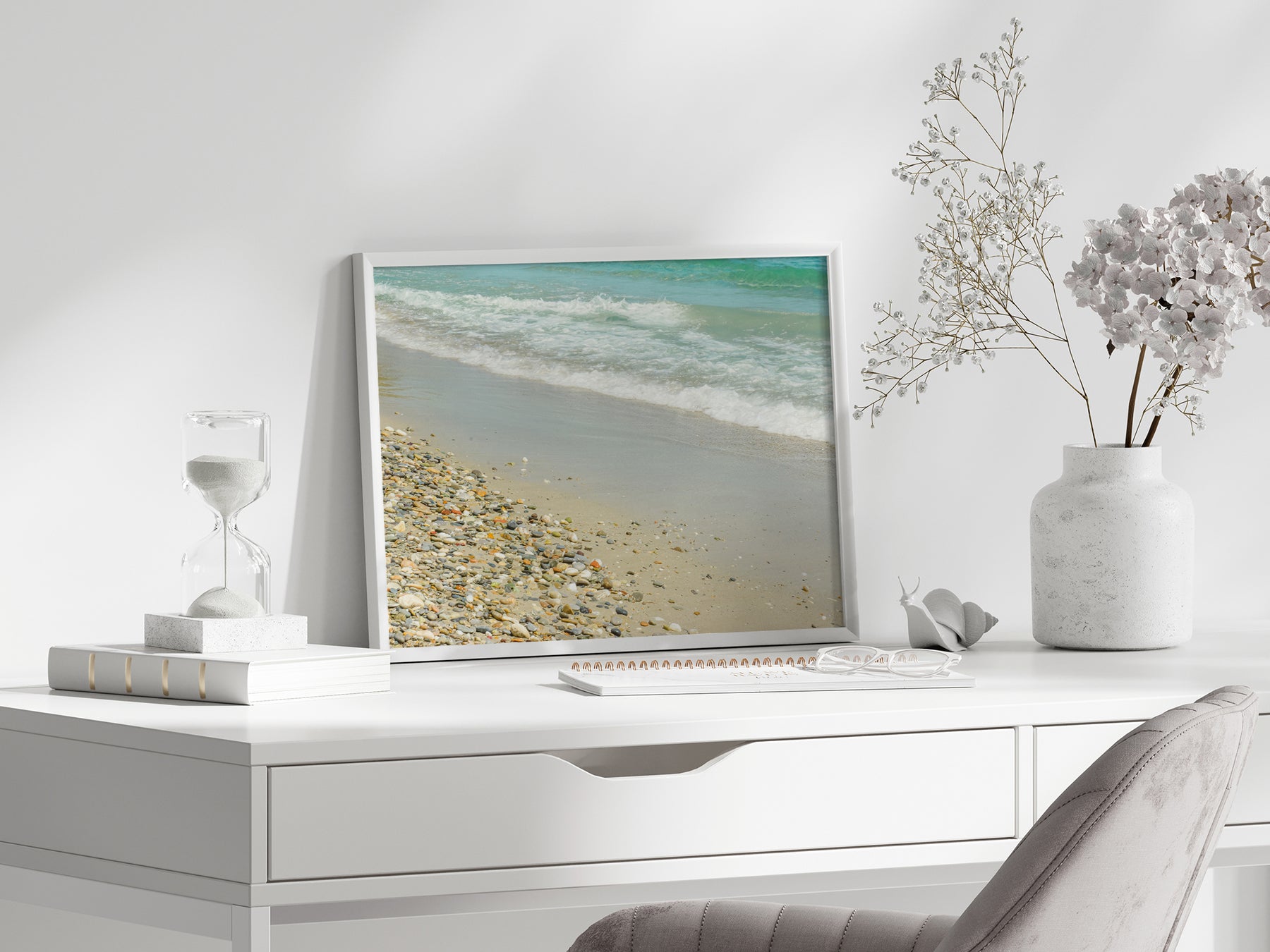 Genieße die Magie des Meers mit dieser atemberaubenden Strandfotografie von ruhigen Wellen, die auf einen Kiesstrand zurollen, präsentiert in einem minimalistischen Stil. Ideal, um jedem Raum ein Gefühl der Gelassenheit zu verleihen, ist diese moderne Wanddeko im Strandstil eine ausgezeichnete Wahl für dein Zuhause oder Büro. Die ruhige Meereslandschaft mit sanften Blau- und Weißtönen schafft mühelos eine beruhigende Atmosphäre in deinem Zuhause. Egal, ob du nach einem auffälligen Stück zum Aufhängen in deinem Wohnzimmer oder nach einem ruhigen Bild für dein Schlafzimmer suchst, dieses minimalistische Strandposter ist eine schöne Option, die deine Einrichtung aufwerten wird.