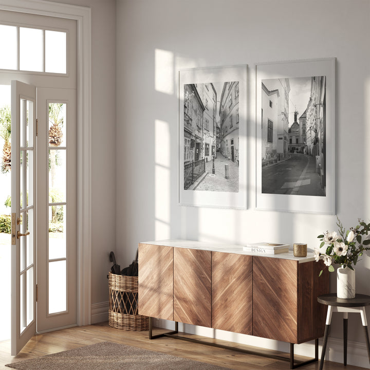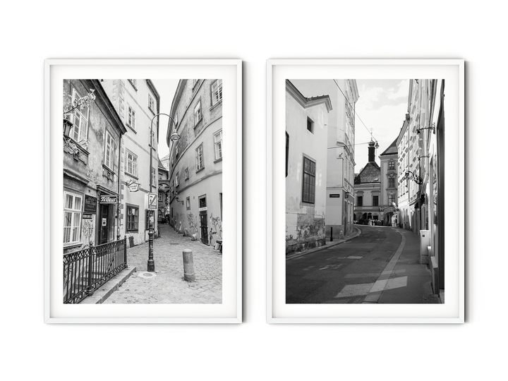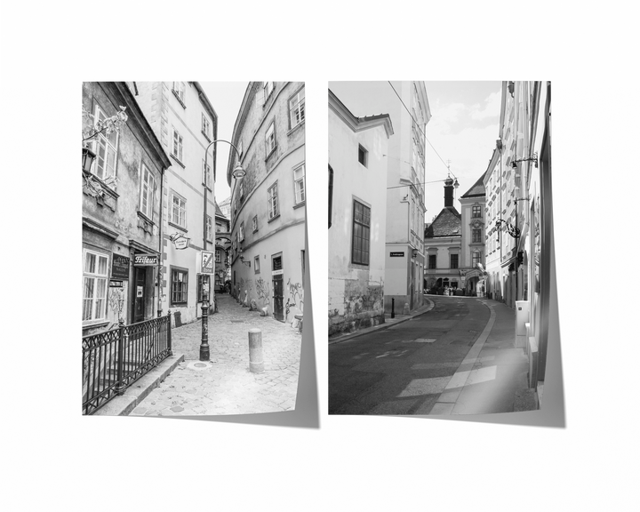 Erlebe die bezaubernden Straßen Wiens in monochromer Eleganz mit diesem Set aus zwei Fine Art Fotodrucken. Diese fesselnden Reisefotos entführen dich in das Herz der Wiener Altstadt, wo Geschichte und Architektur miteinander verschmelzen. Jeder Druck zeigt die zeitlose Schönheit der engen Gassen Wiens, voller Charakter und europäischem Charme. Egal, ob du schon einmal durch diese Straßen geschlendert bist oder dich danach sehnst, sie zu erkunden, dieses Set aus 2 Drucken bietet dir einen Einblick in die Seele Wiens. Bringe die Eleganz dieser historischen Stadt in dein Zuhause mit dieser atemberaubenden schwarzweißen Bilderwand, eine Hommage an die anhaltende Faszination Wiens.