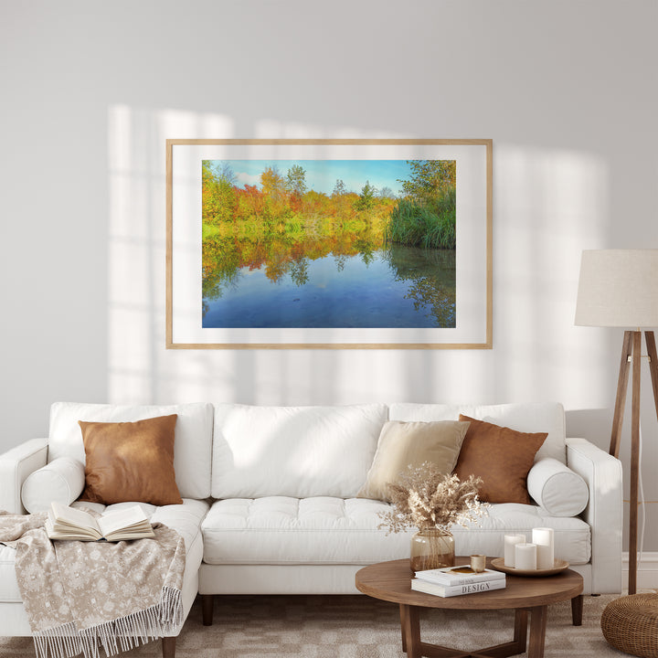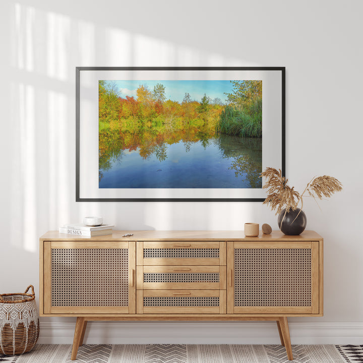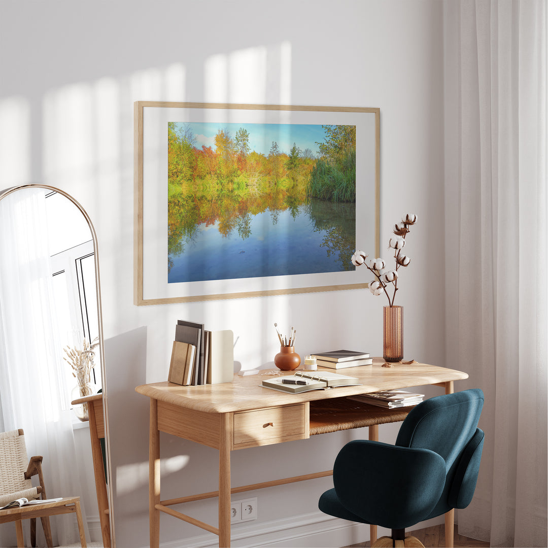 Erlebe die atemberaubende Schönheit der Natur mit diesem Fine Art Print, der die leuchtenden Farben eines Altweibersommers einfängt. Dieser wunderschöne Kunstdruck zeigt eine faszinierende Darstellung farbenfroher Blätter, die in den warmen Schein der Sonne getaucht sind und sich elegant auf der ruhigen Oberfläche eines ruhigen Sees spiegeln. Tauche ein in die harmonische Mischung aus lebendigen Tönen und einer ruhigen Umgebung und lasse dich von dem Bild an einen Ort der Ruhe und beeindruckender Naturwunder entführen. Dieser Druck ist eine ideale Ergänzung für jede Inneneinrichtung im Landhausstil.