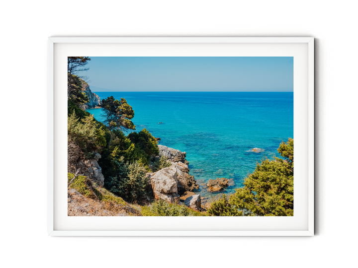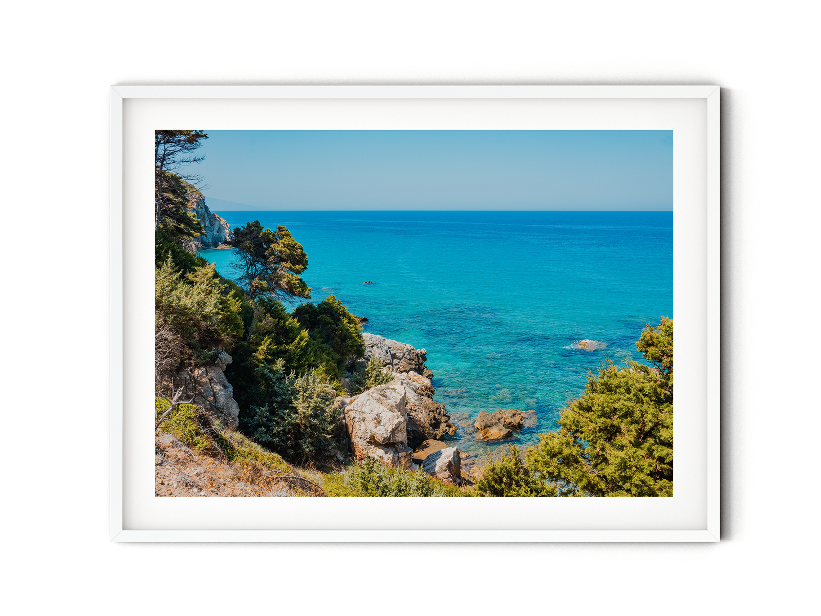 Eine schöne Fotografie der Küstenlandschaft von Samos, Griechenland. Lass dich vom endlosen türkisfarbenen Meer und der schorffen Küste in Staunen versetzen. Griechenland ist berühmt für seine Naturschönheit und unerreichten Meerespanoramen. Nimm ein Stück Griechenland mit diesem Meerbild zu dir nach Hause mit!