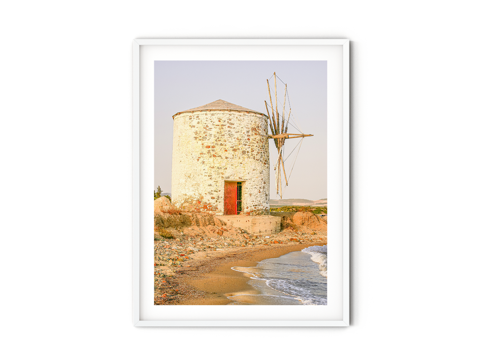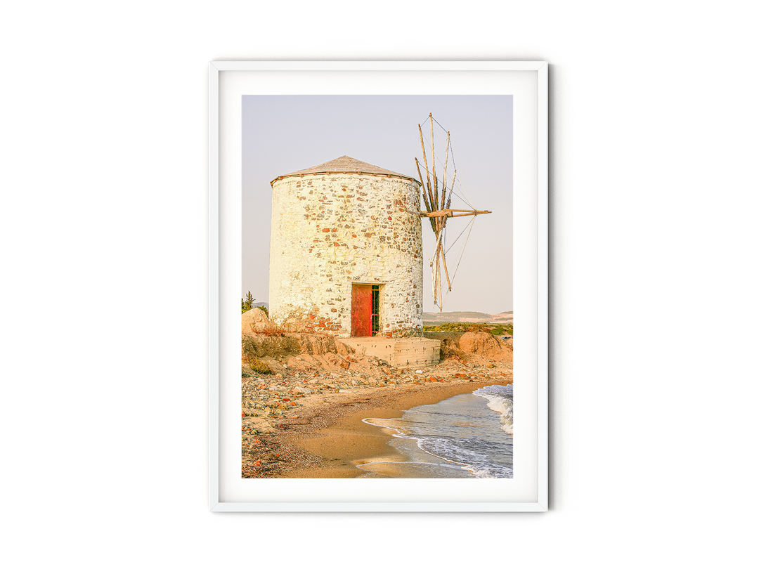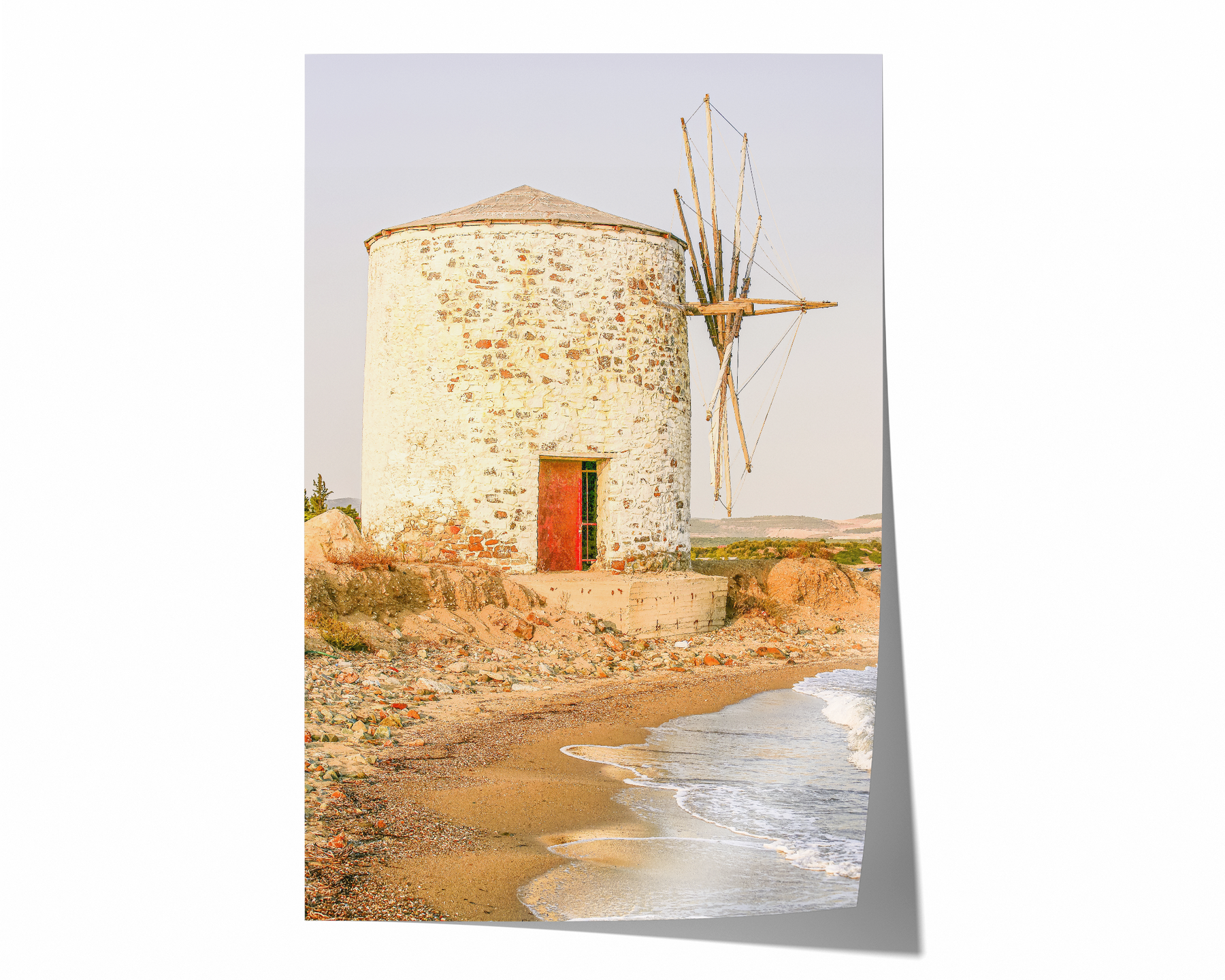 Fange die zeitlose Schönheit einer alten Windmühle am Strand von Kalyves in Chalkidiki, Griechenland, mit diesem wunderschönen Fine Art Print ein. Während die untergehende Sonne die Szene in ein goldenes Licht taucht, entsteht eine warme und bezaubernde Atmosphäre. Dieses Reiseposter ist das perfekte Geschenk für jeden Griechenland-Liebhaber und bietet eine atemberaubende visuelle Erinnerung an den faszinierenden Reiz und das reiche kulturelle Erbe dieses bemerkenswerten Reiseziels. Bringe mit diesem wunderschönen Kunstdruck einen Hauch des griechischen Küstencharmes und der magischen Atmosphäre von Kalyves in dein Zuhause.