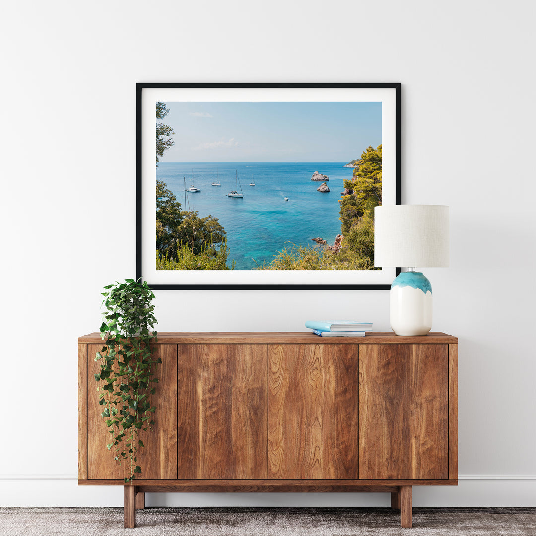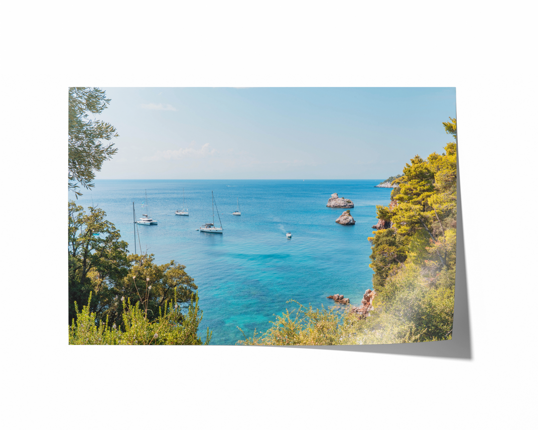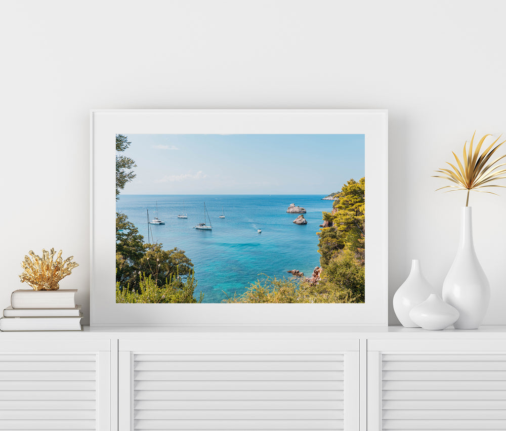 Stell dir vor, du stehst auf den schroffen Klippen der Insel Skopelos und blickst auf das glitzernde türkisfarbene Wasser der Ägäis. Segelboote treiben sanft auf dem ruhigen Wasser, während eine sanfte Küstenbrise die Luft erfüllt. Üppige grüne Vegetation schmiegt sich an die Küste und verleiht der lebendigen Landschaft einen Hauch von Gelassenheit. Dieses Foto erweckt diesen friedlichen Moment zum Leben und bietet einen Blick auf die stille Schönheit von Skopelos. Egal, ob du dein Zuhause auf die griechischen Inseln versetzen oder einfach die Ruhe der Natur genießen möchtest, dieser Kunstdruck ist die perfekte Möglichkeit dafür.