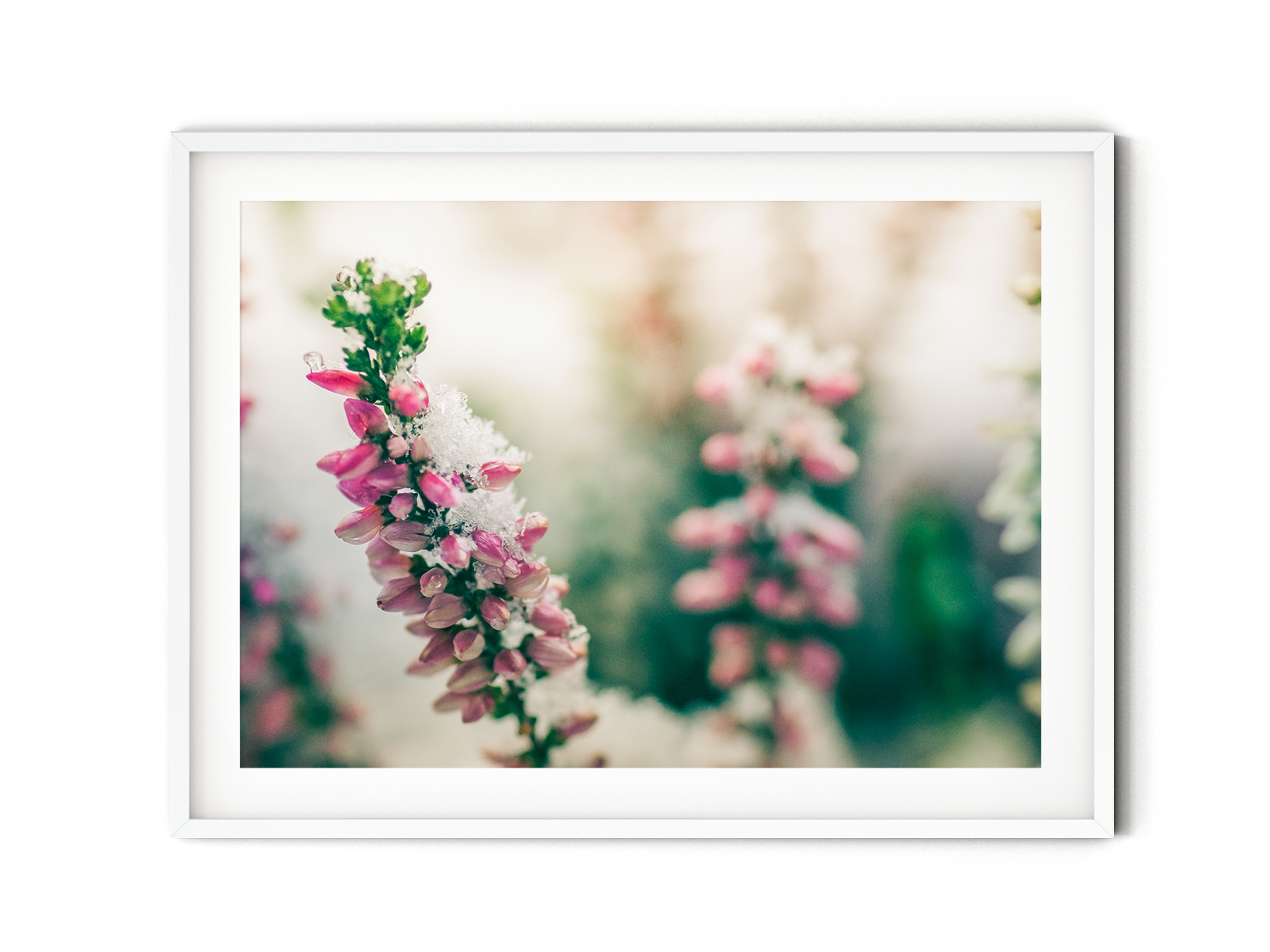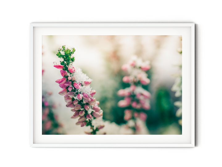 Fange die heitere Schönheit des schneebedeckten rosa Heidekrauts mit diesem atemberaubenden Fine Art Print ein. Die zartrosa Blüten, bedeckt von einer weichen Schneeschicht, schaffen eine bezaubernde und ruhige Szene. Verleihe deiner Einrichtung einen Hauch von winterlichem Charme und genieße die zarte Eleganz der Natur mit diesem atemberaubenden Kunstwerk, perfekt für alle, die die ruhige Schönheit des Winters schätzen.