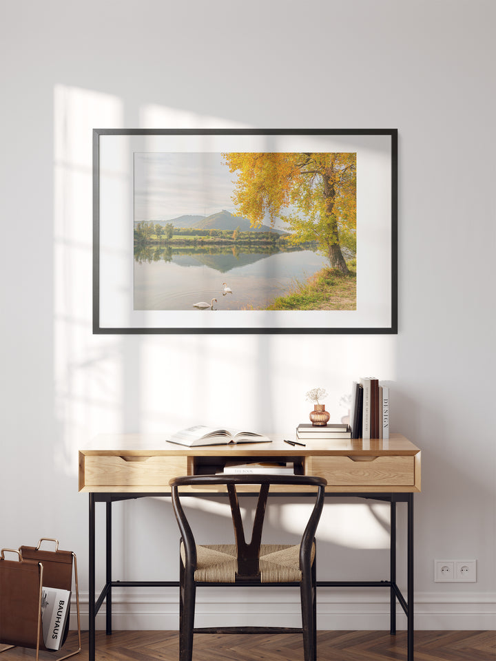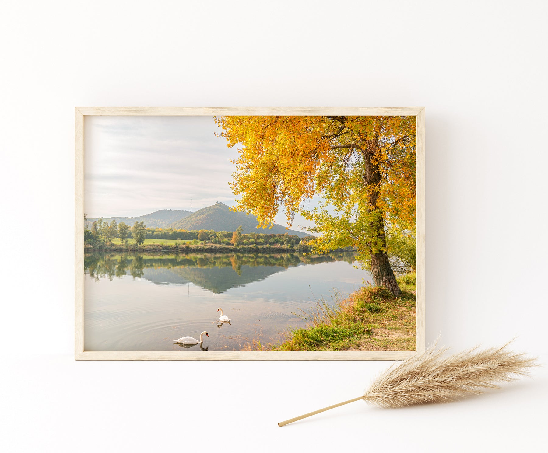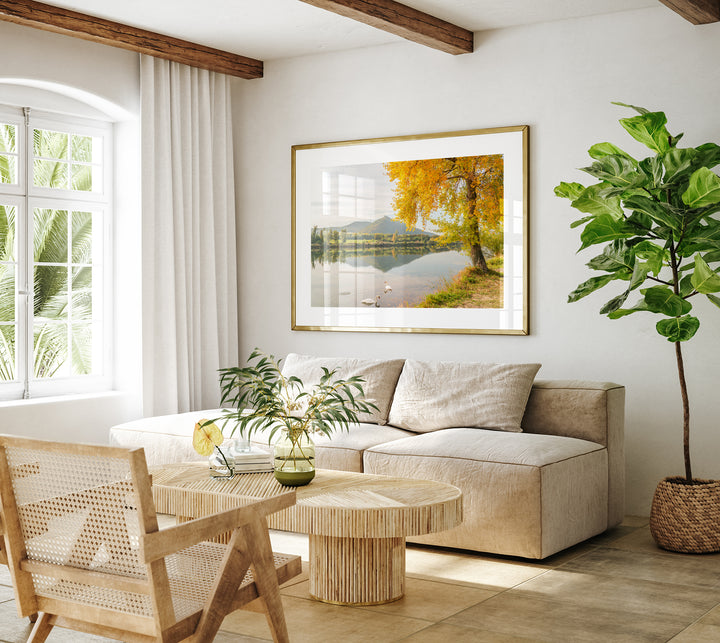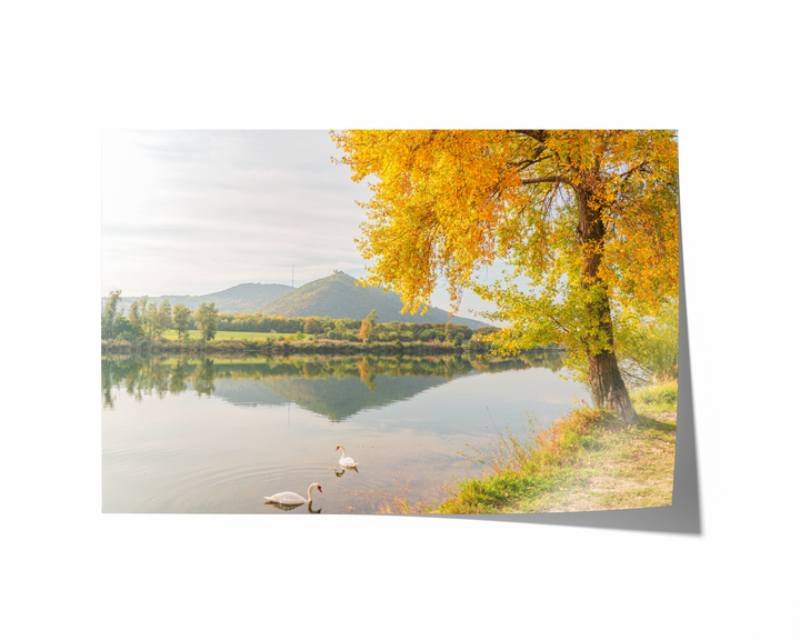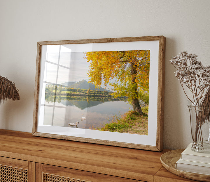 A beautiful photography print of a peaceful lakeside landscape in the fall. This calm lake is surrounded by yellow trees, the landscape in the background is dominated by the shadows cast by green mountains in the distant background. A pair of white swans is swimming in the water with each other. You will love the peaceful atmosphere of autumn that this high quality print captures and it will give your home a warm and welcoming atmosphere.