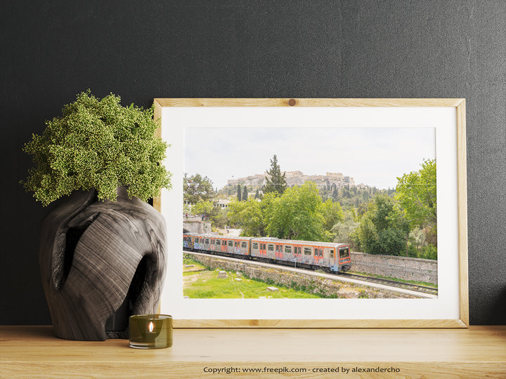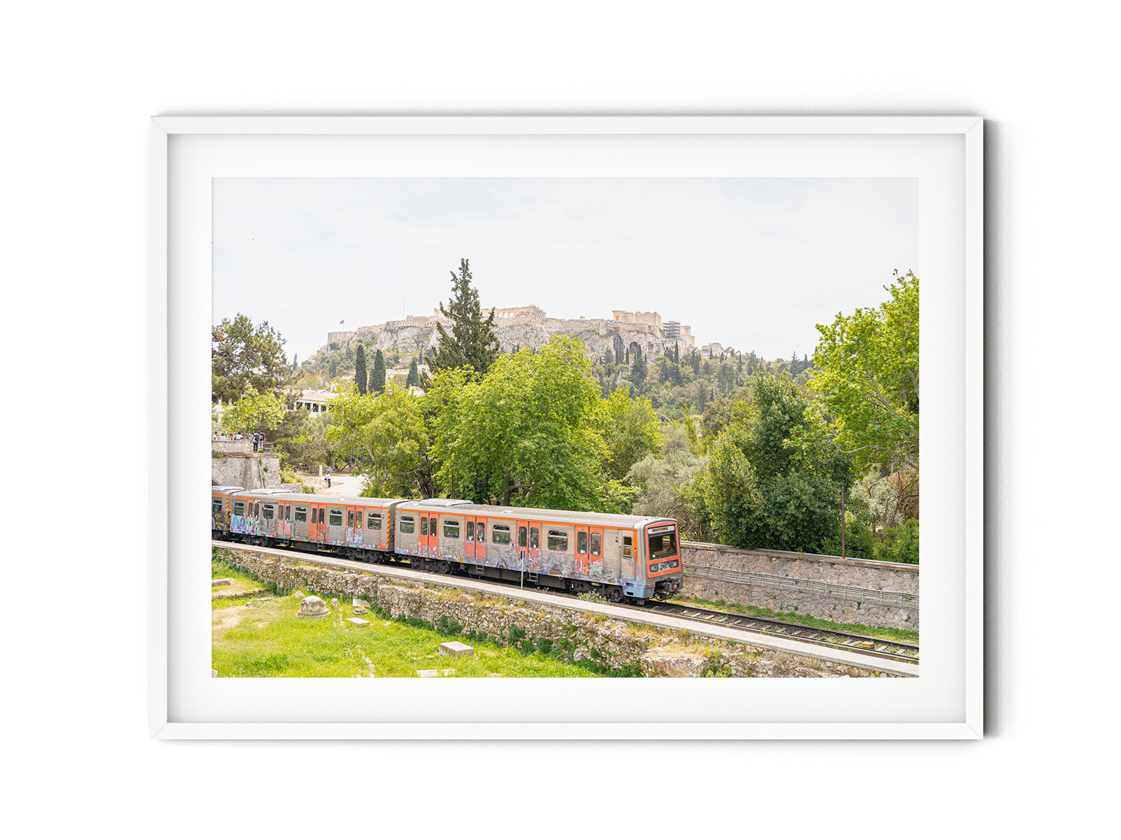 Experience the perfect blend of ancient history and modern, vibrant life with this stunning fine art photography print. Capture the view of the Acropolis and ancient Greek ruins, as a metro train passes under this iconic symbol of ancient Greece. The print brings the beauty of Athens to your home, making it an ideal addition to your Greek-inspired decor. Immerse yourself in the captivating harmony of ancient and contemporary elements as you add a touch of the vibrant Greek capital to your home. This travel print is not only a visual delight but also a great gift idea for Greece fans, travel lovers, and anyone who appreciates the fascinating allure of Athens.
