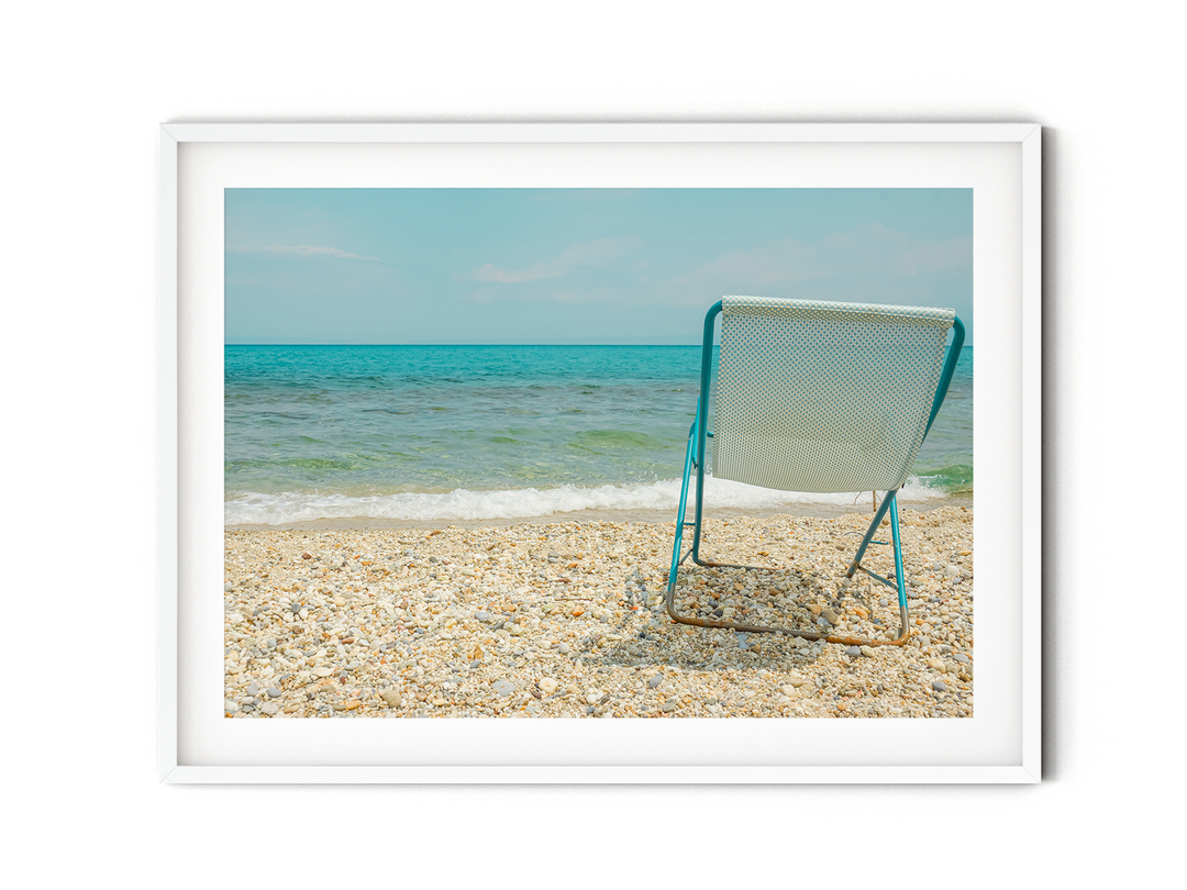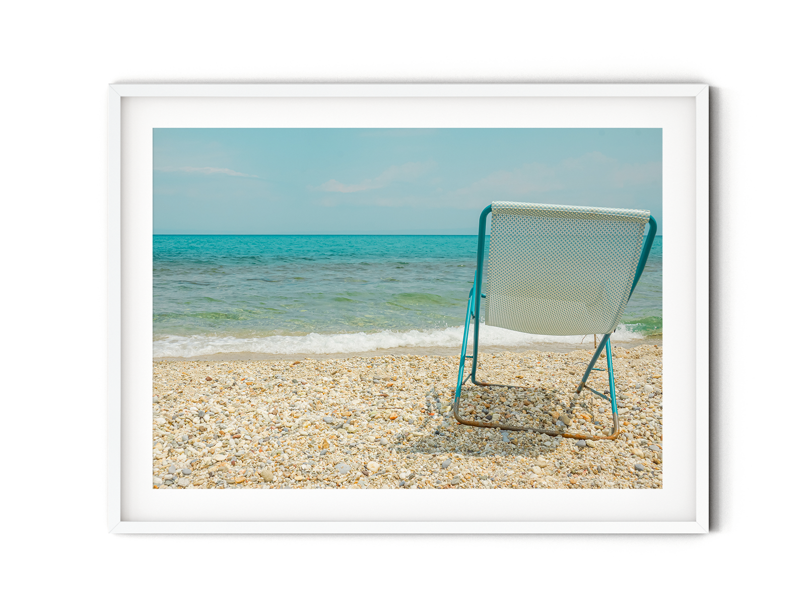 Enjoy a day by the sea with this lovely photography print of a retro-style beach chair. This eye-catching wall art print of a vintage beach chair against a backdrop of crystal clear turquoise waters and a blue sky will keep summer memories alive. This print will transform your living space into a coastal paradise instantly. The vintage style of the chair adds a touch of retro charm to any room, while the soothing blue hues and natural elements of the image create a calming atmosphere that will transport you to the beach with just a glance. Whether you're a beach lover or simply appreciate the timeless allure of retro design, this photography print is the perfect addition to your beach themed home decor.