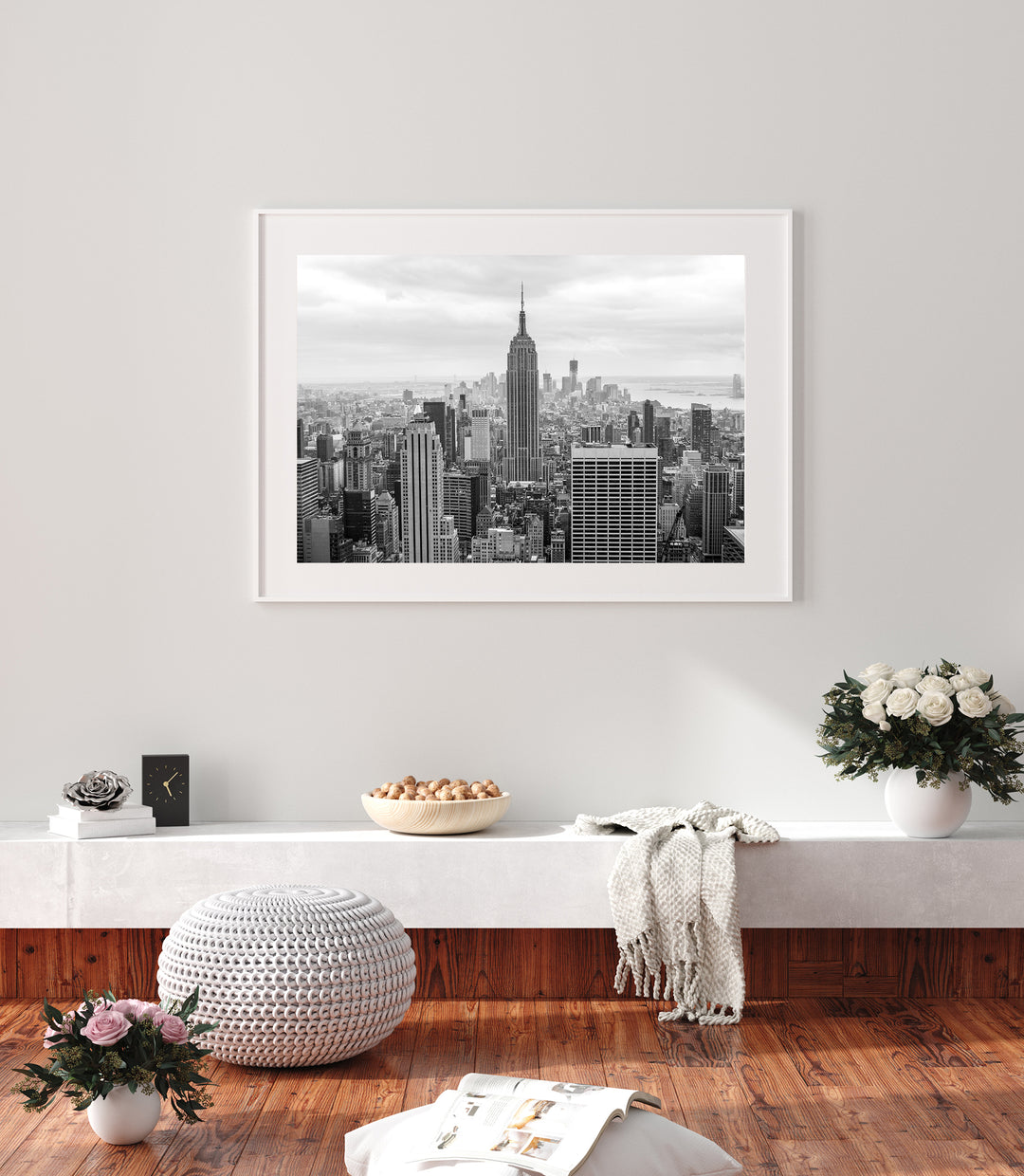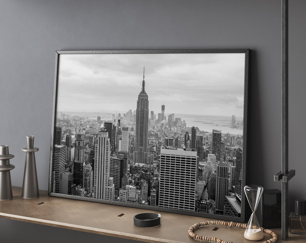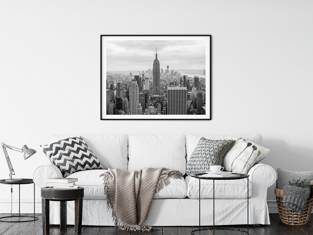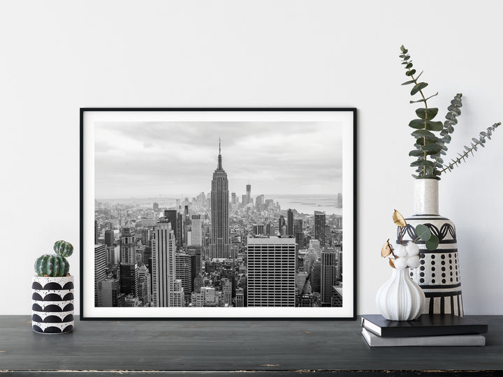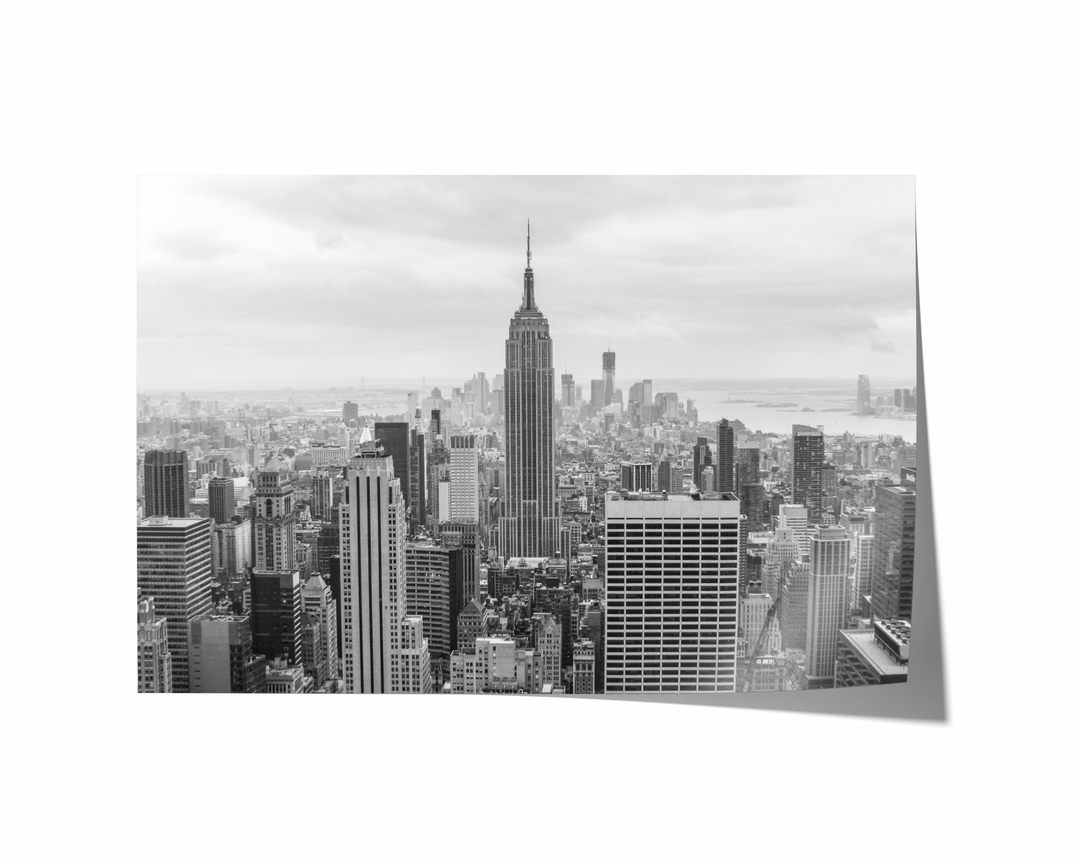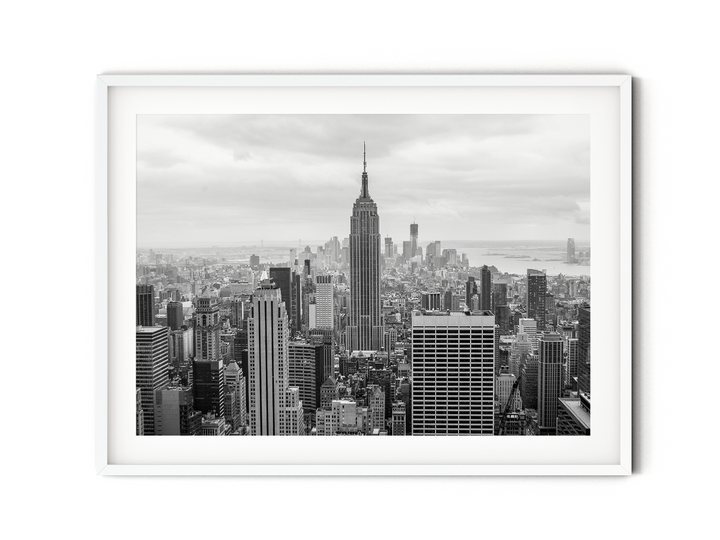 Capture the breathtaking beauty of the iconic New York City skyline with this stunning black and white photography print. This stunning art print showcases the mesmerizing grandeur of the city that never sleeps, prominently featuring the magnificent Empire State Building. With its timeless elegance, this fine art print transports you to the heart of the city. This urban photography adds a touch of sophistication to any space, whether it's displayed in a home, office, or art gallery. Immerse yourself in the unmistakable energy of the Big Apple with this captivating monochromatic print.