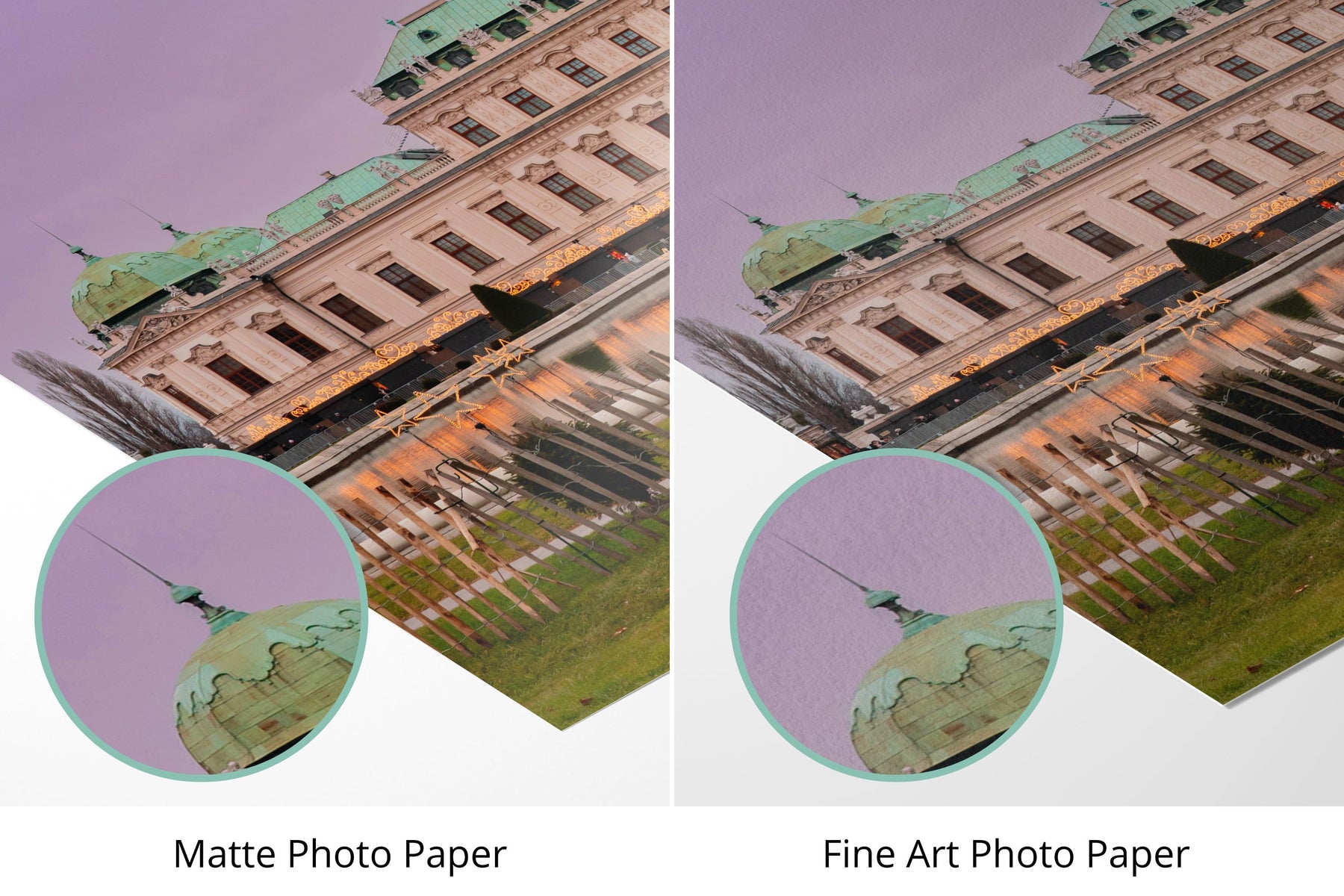 Fine art photo paper prints are printed on Hahnemühle Photo Rag® 308 fine art photo paper (308 gsm). The premium quality fine art prints are made by hand with archival pigmented inks. They impress with over 100 years of color brilliance. The Hahnemühle Photo Rag® 308 is a superior quality branded fine art paper made of 100% cotton with a smooth matte finish that emphasizes every detail.