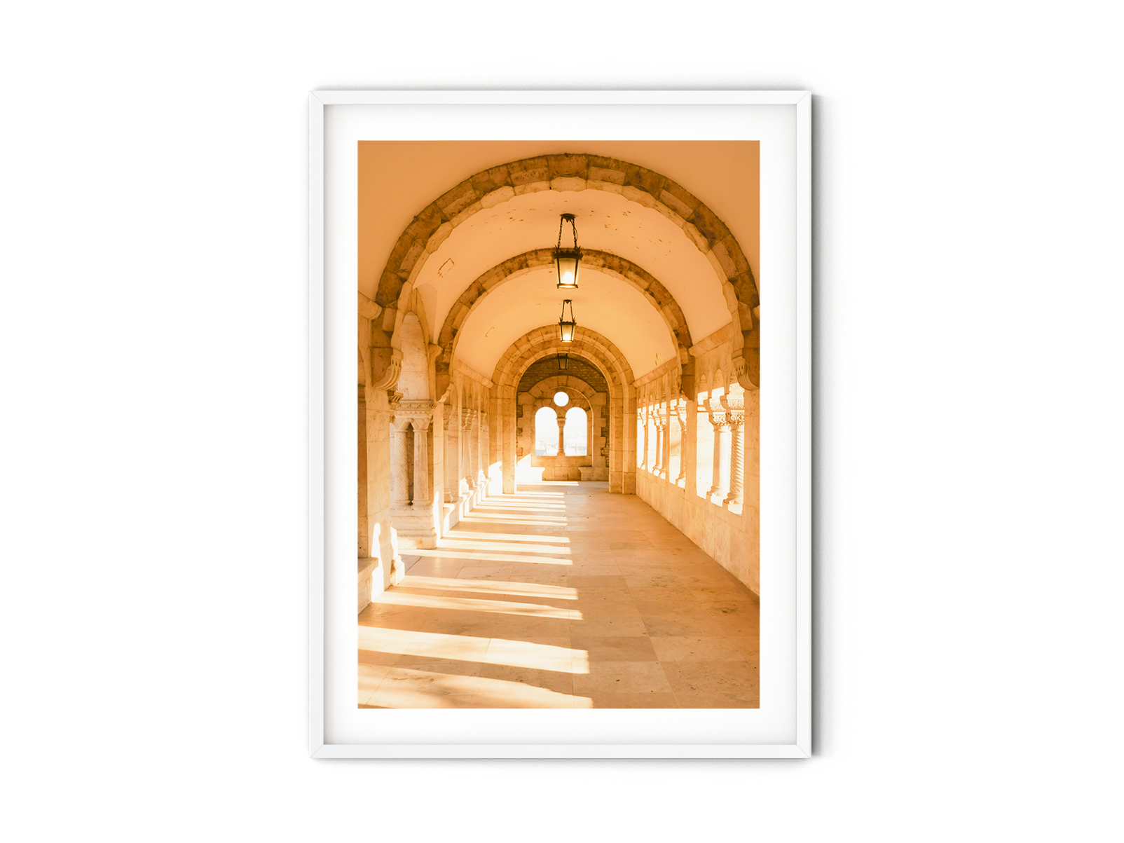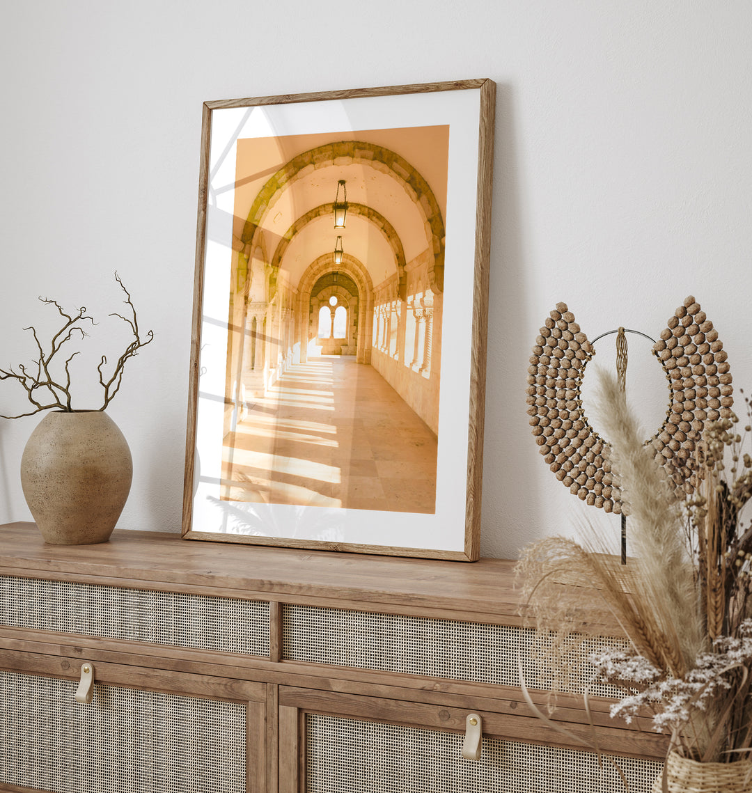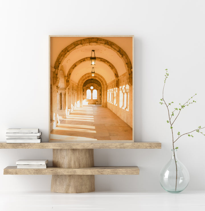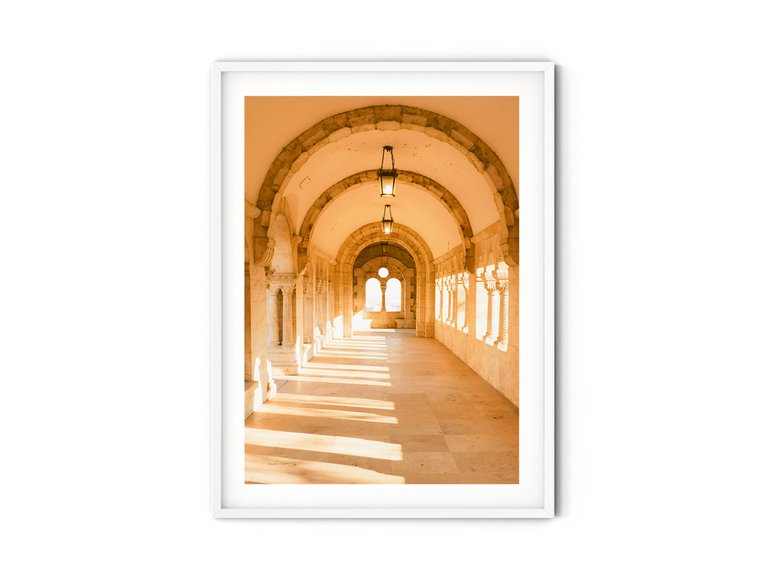 Transport yourself to the captivating city of Budapest with this stunning fine art photography print of the arcades of the Fisherman's Bastion. Witness the play of sunlight as it gracefully filters through the gaps between the pillars, casting a serene and enchanting atmosphere within the corridor. Perched high above the city, the Fisherman's Bastion is a marvel of Neo-Romanesque architecture, constructed between 1895 and 1902. This print allows you to bring the beauty of European architecture into your living space. Immerse yourself in the unique charm of the Fisherman's Bastion and let this remarkable travel print become a captivating focal point, inspiring a sense of wanderlust and evoking a feeling of awe for Hungary's cultural heritage.