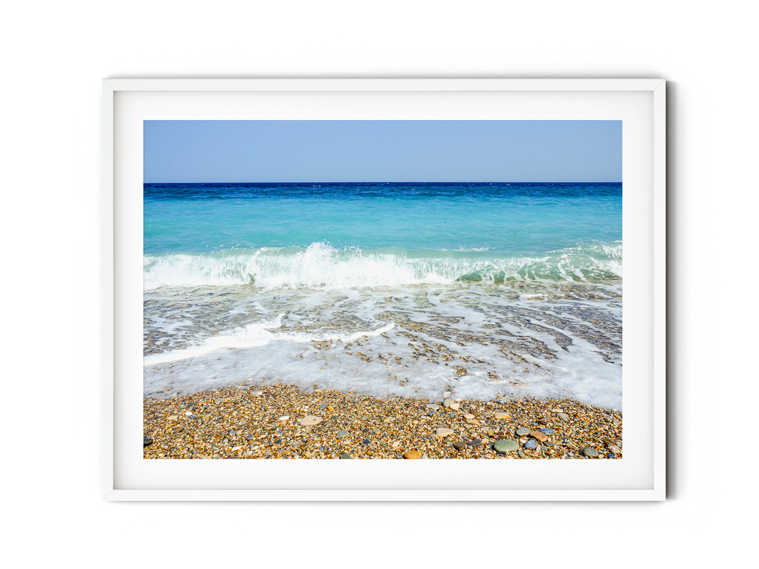Transport yourself to the idyllic Greek islands with this stunning beach print, designed to evoke cherished memories of relaxed summer days. The mesmerizing scene captures the essence of the Mediterranean, with the boundless turquoise sea gently transitioning into a deeper blue as the waves kiss the shore. This coastal landscape print not only brings the allure of the ocean into your home but also radiates feelings of freedom and carefreeness. Perfect for adorning your own space or as a thoughtful gift for fellow beach lovers, let this artwork immerse you in the eternal summer of the Greek islands.