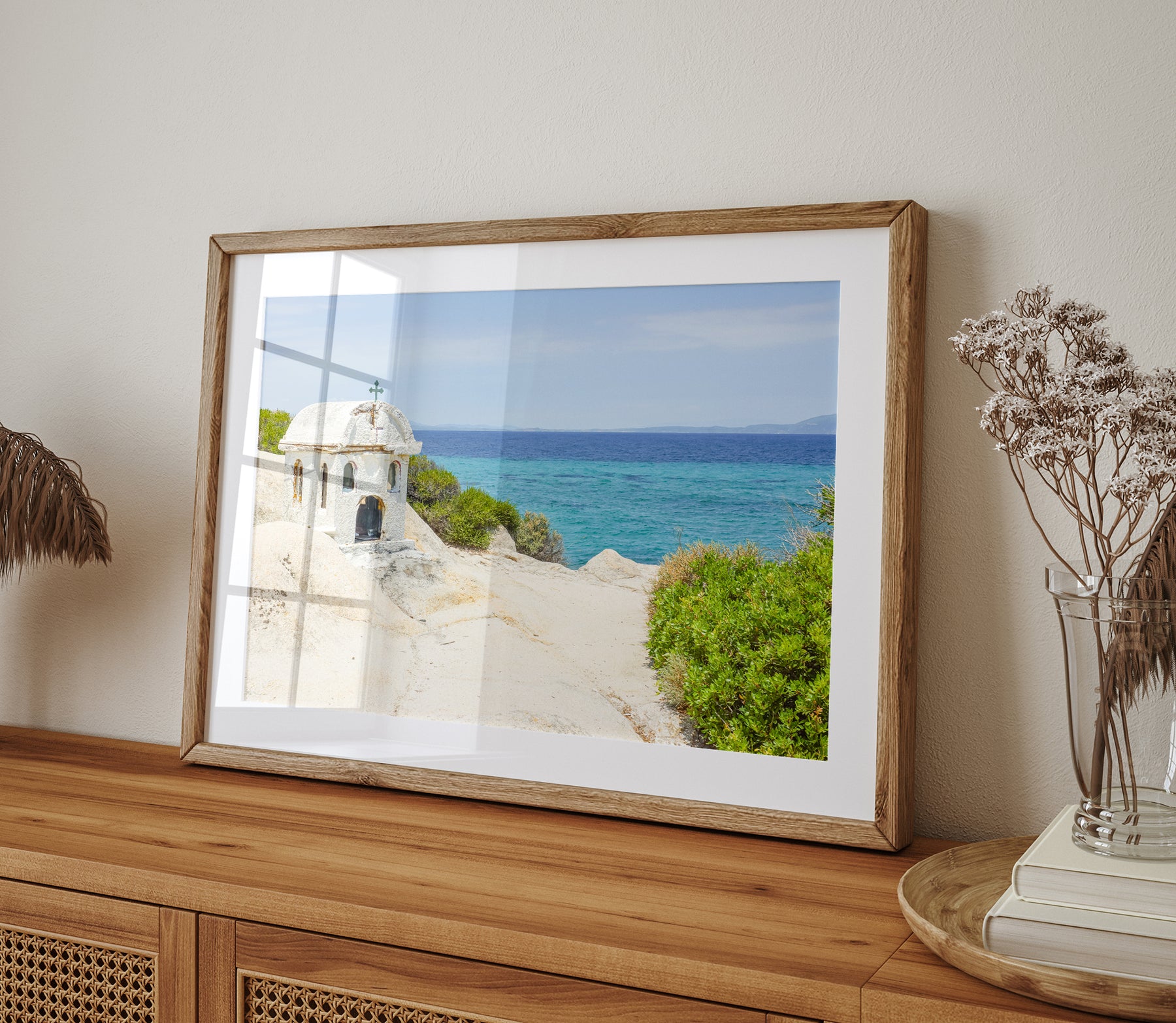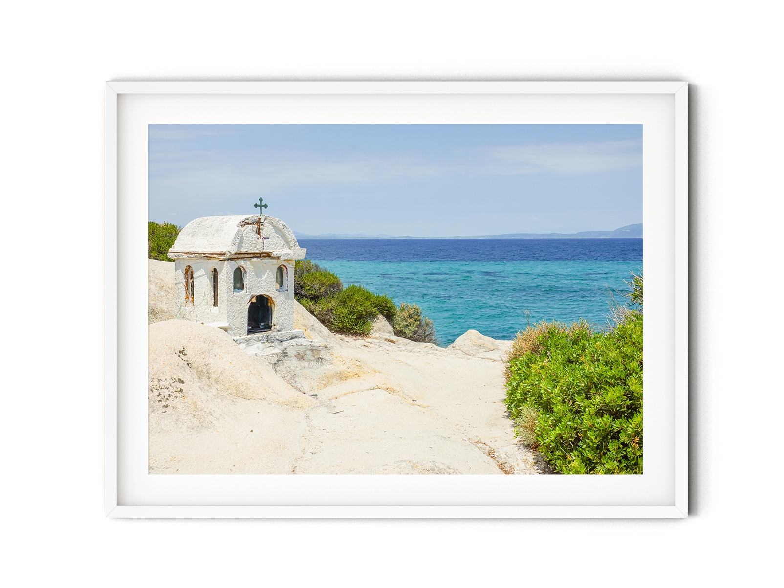 This stunning coastal print transports you the tranquil and picturesque coast of the Halkidiki peninsula in Greece. Featuring a small white chapel set against the backdrop of the glistening turquoise sea of the Aegean, this print perfectly captures the atmosphere of summertime on the Greek coast. This coastal-themed art print is the ideal addition to any Mediterranean style decor. Whether you're looking to create a coastal oasis in your bedroom or a cozy nook in your living room, this print will bring a touch of effortless elegance to any space. It also makes for a great addition to any Greece themed gallery wall.