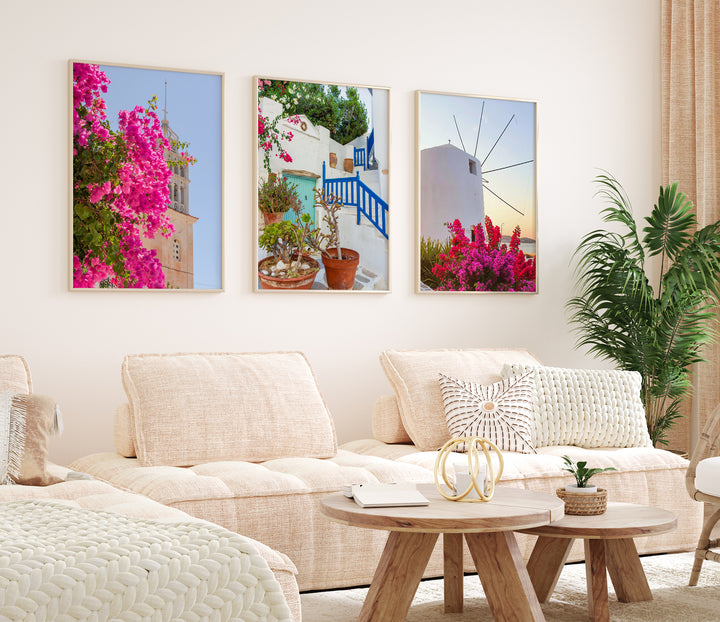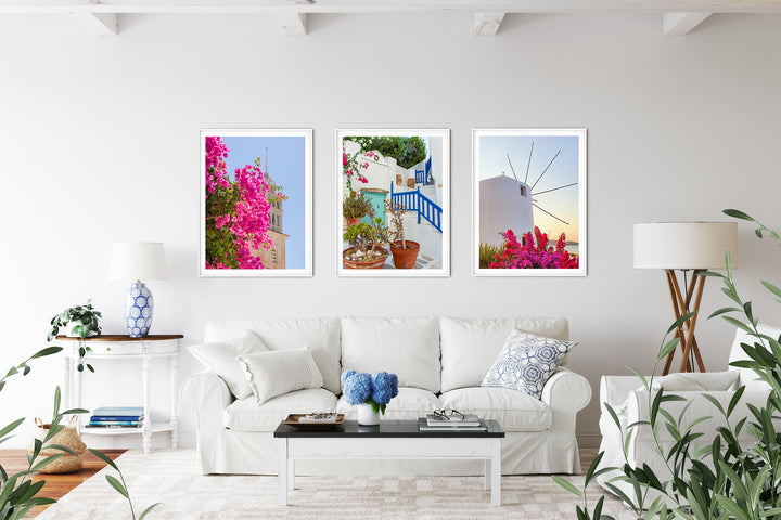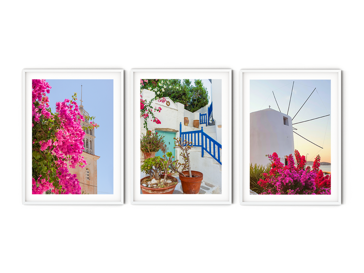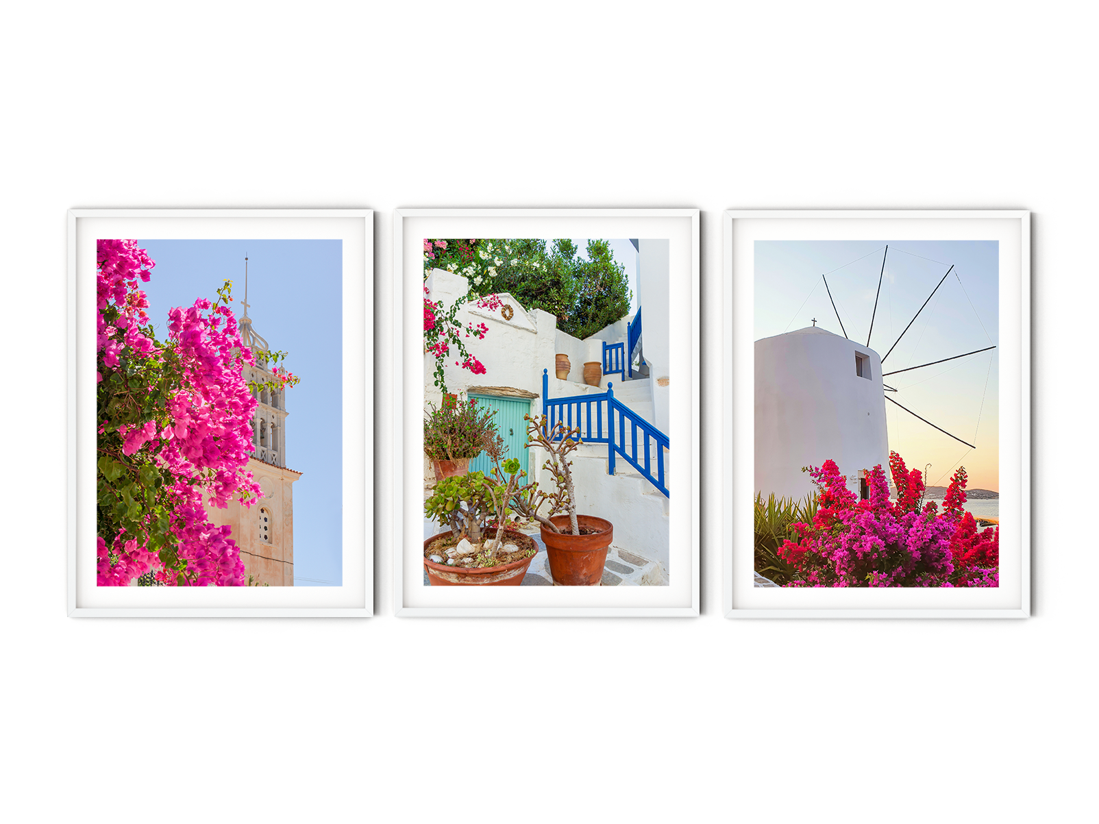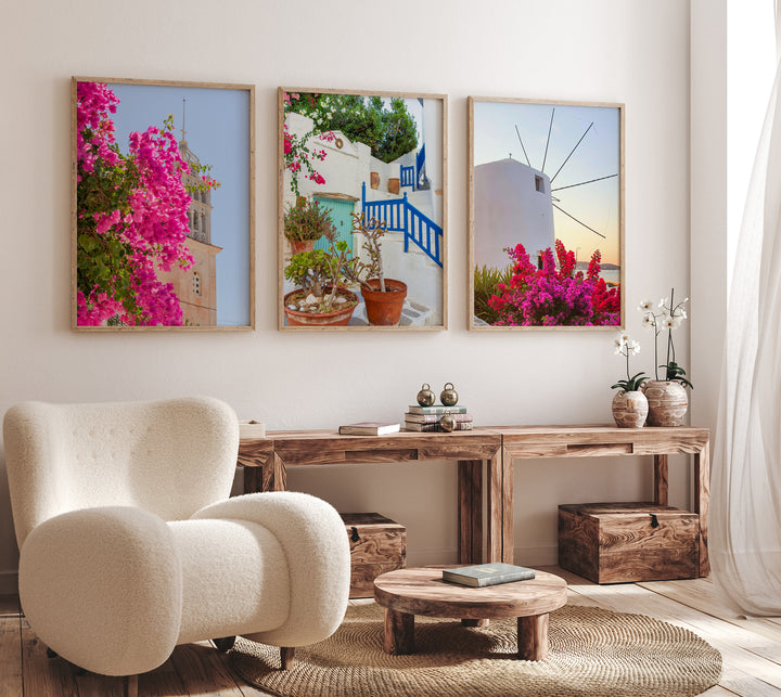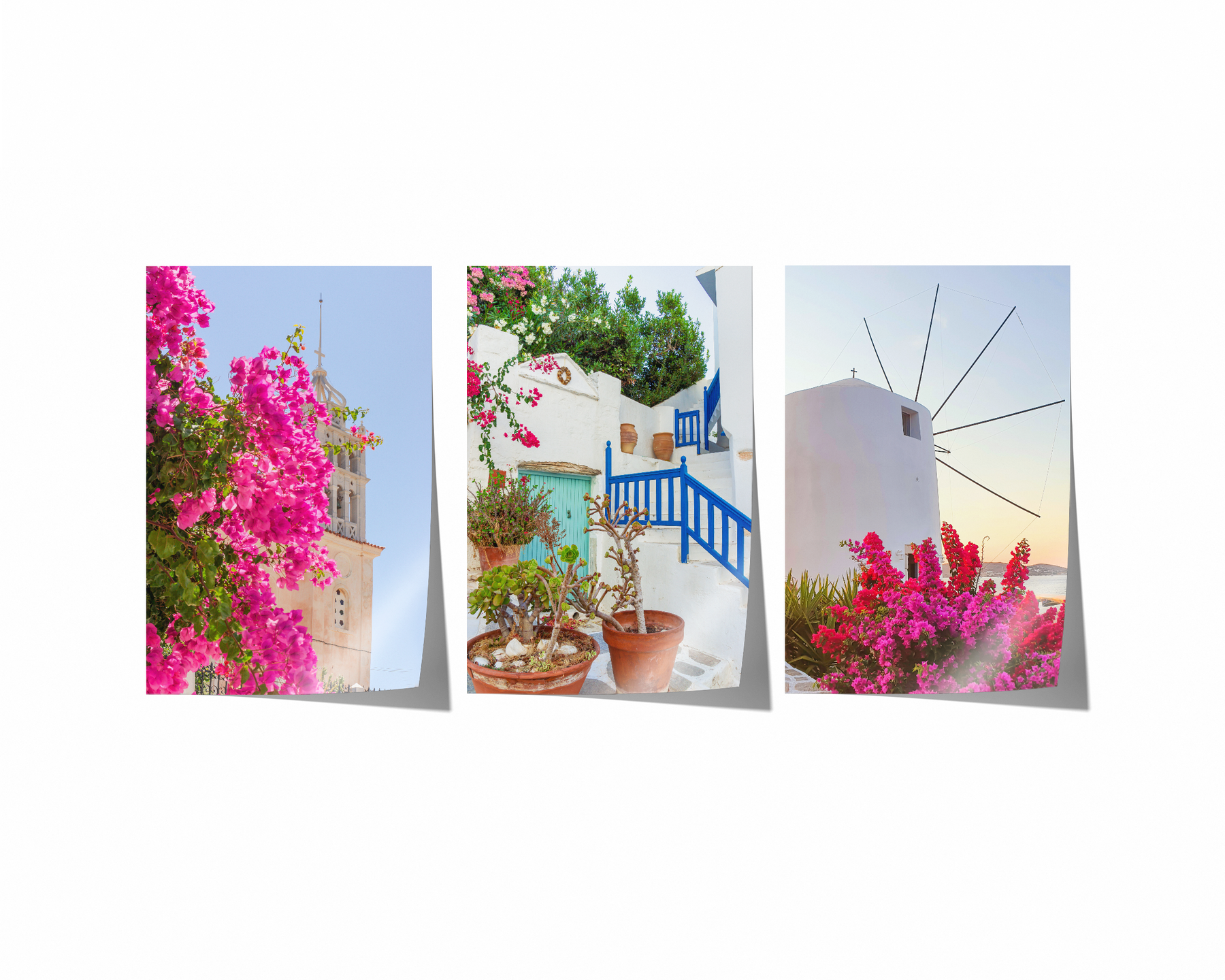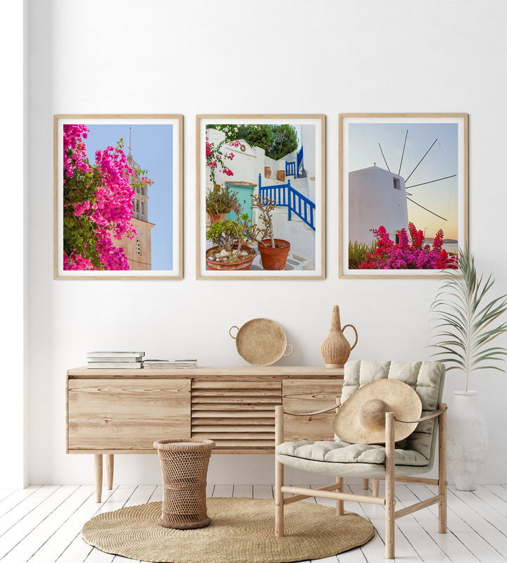 Embrace the allure of Greece with this charming print set capturing the essence of the idyllic Greek island of Paros. The vibrant pink bougainvillea blossoms, the whitewashed houses adorned with blue windows, the iconic Greek windmill, and the picturesque Greek church come together to epitomize the enchanting beauty of Greece. The warm colors exude a friendly and inviting ambiance, making this wall art set a perfect choice to bring life and vibrancy to your walls. Transport yourself to the sun-kissed landscapes of Paros with this delightful poster set, and let the beauty of Greece adorn your home with its timeless charm.