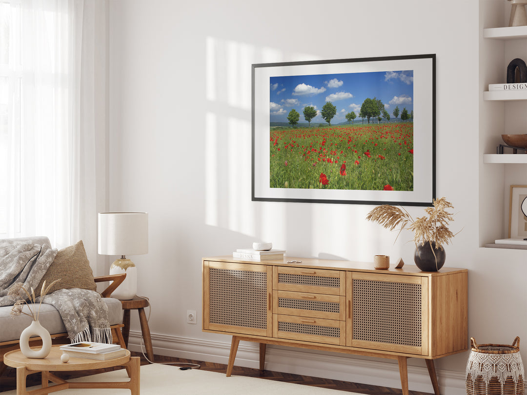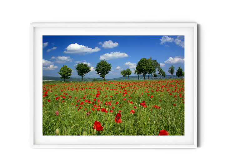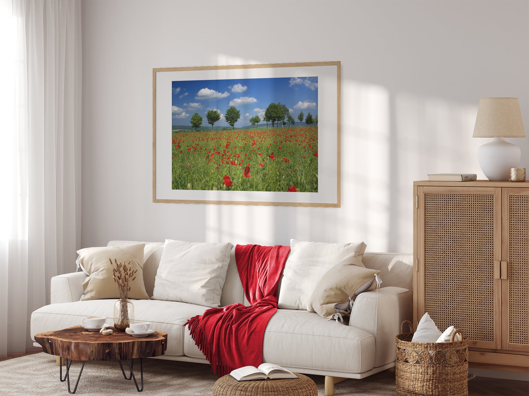 Transport your senses to the idyllic charm of sun-drenched poppy fields and lazy summer afternoons with this exquisite fine art photography print. Ideal for complementing cottage or farmhouse-style decor, this print effortlessly captures the essence of a warm, sun-kissed day. Whether it's the vibrant red hues or the dreamy landscape, this print invites the beauty of nature into your home, offering a perpetual touch of summer and a timeless escape from the ordinary.