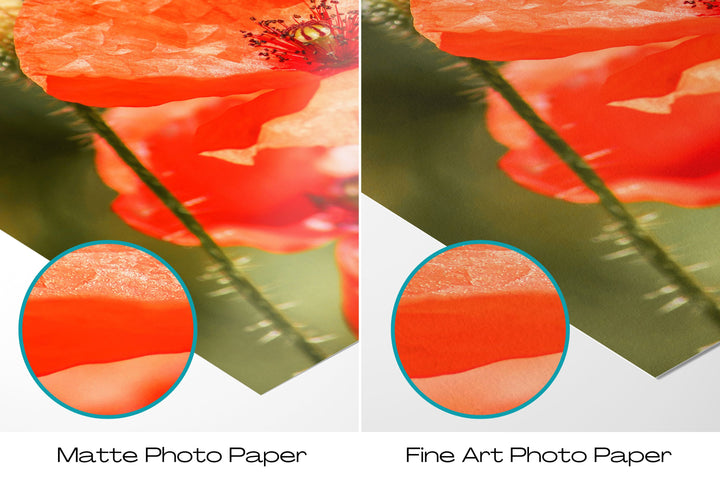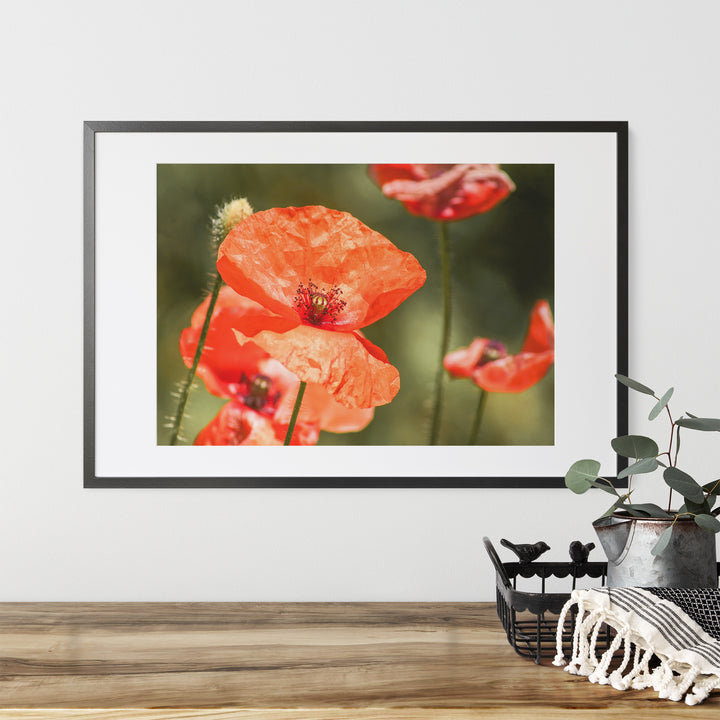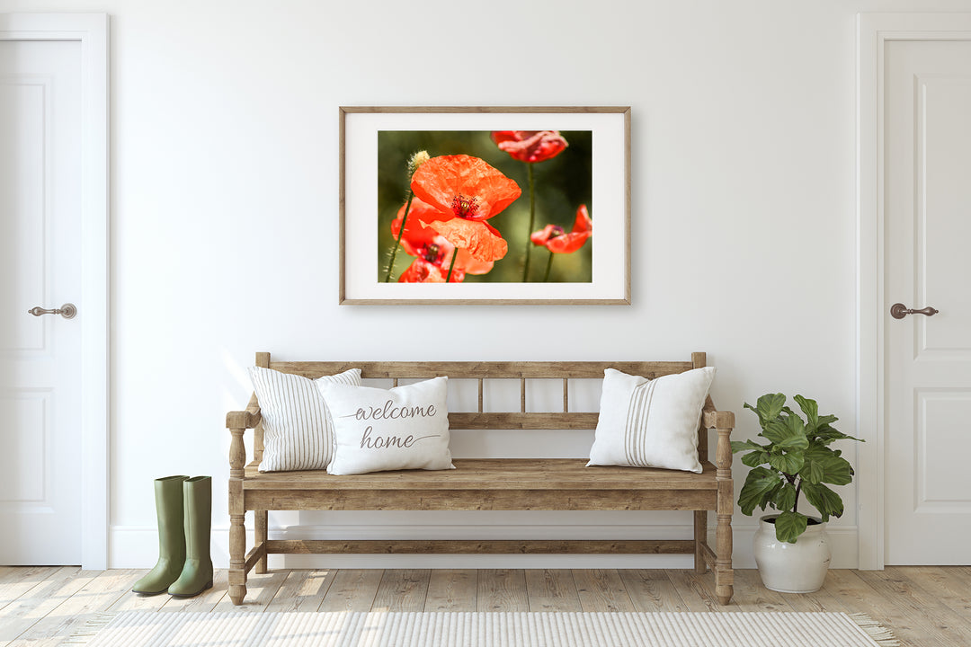 Dream of warm summer evenings in the country with this beautiful poppy flower print. The vibrant red poppies exude energy, warmth, and a sense of joy. Adding a touch of cosiness to any room, this wall art print ensures that the spirit of summer never leaves your home. Perfect for rustic farmhouse decor, this fine art nature photography will transport you to a picturesque meadow of blooming poppies, filling your home with natural beauty and a cheerful ambiance.