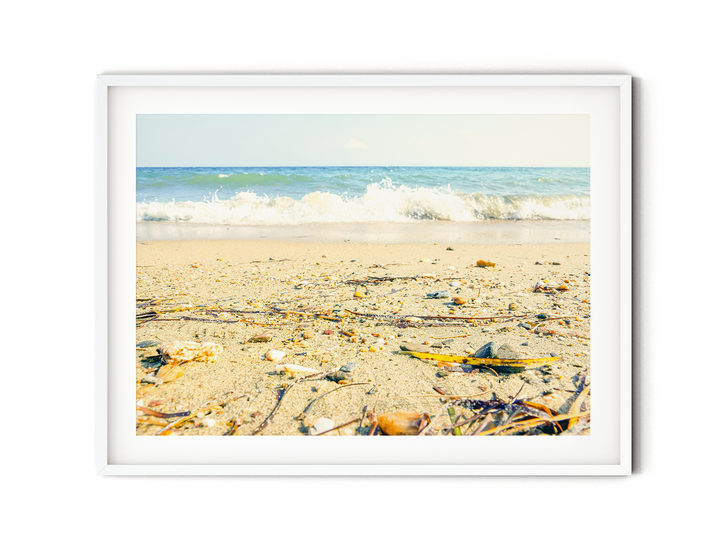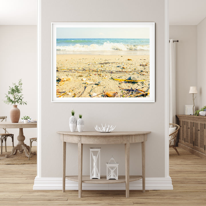 Immerse yourself in the tranquil beauty of the coast with this captivating nature poster. As waves gracefully caress the shoreline in the backdrop and seaweed gently carpets the sandy foreground, this beach photography evokes the soothing sensations of sea and shore. Hang this beach wall art in your space, and let it not only infuse your home with maritime flair but also transport you to the serene ambiance of the seaside, where the salty air and ocean breeze become an everyday presence.