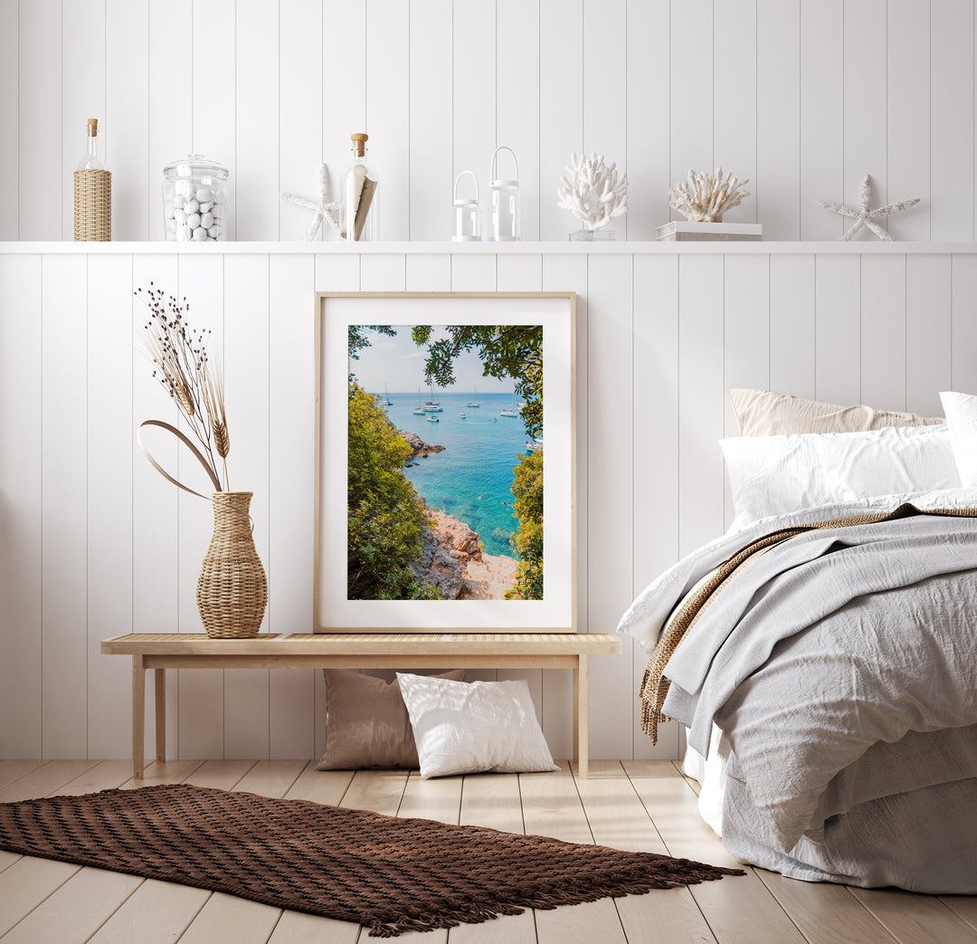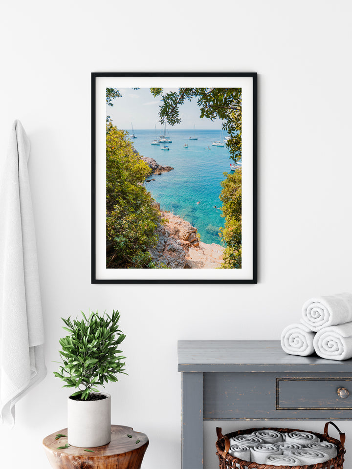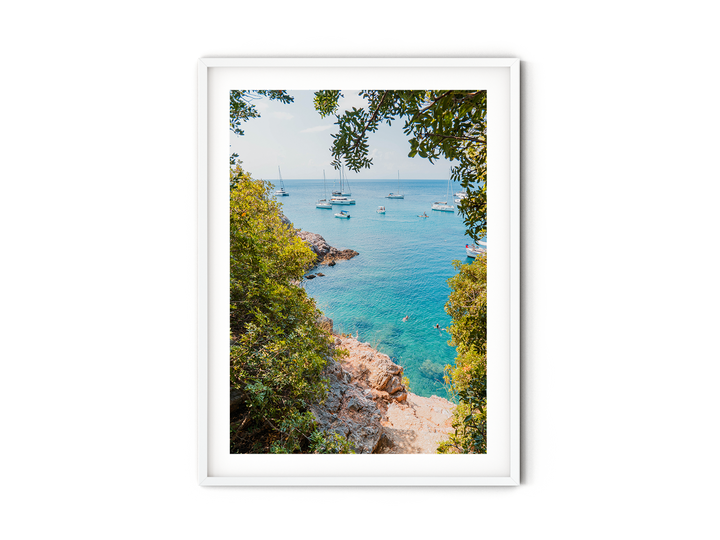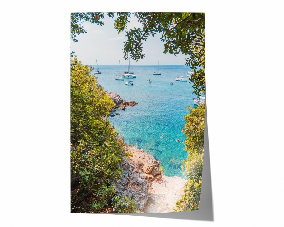 Picture the quiet moment when sailboats rest peacefully at anchor, their sails folded, waiting for the breeze to carry them away again. Off the coast of Skopelos, the turquoise waters provide the perfect calm for these boats to pause, while the island’s lush green hills rise majestically. This photograph captures the stillness of the Aegean, offering a serene view of a moment where time seems to slow down. Ideal for bringing a touch of Mediterranean tranquility into your space, this fine art print reflects the peaceful essence of Skopelos Island.