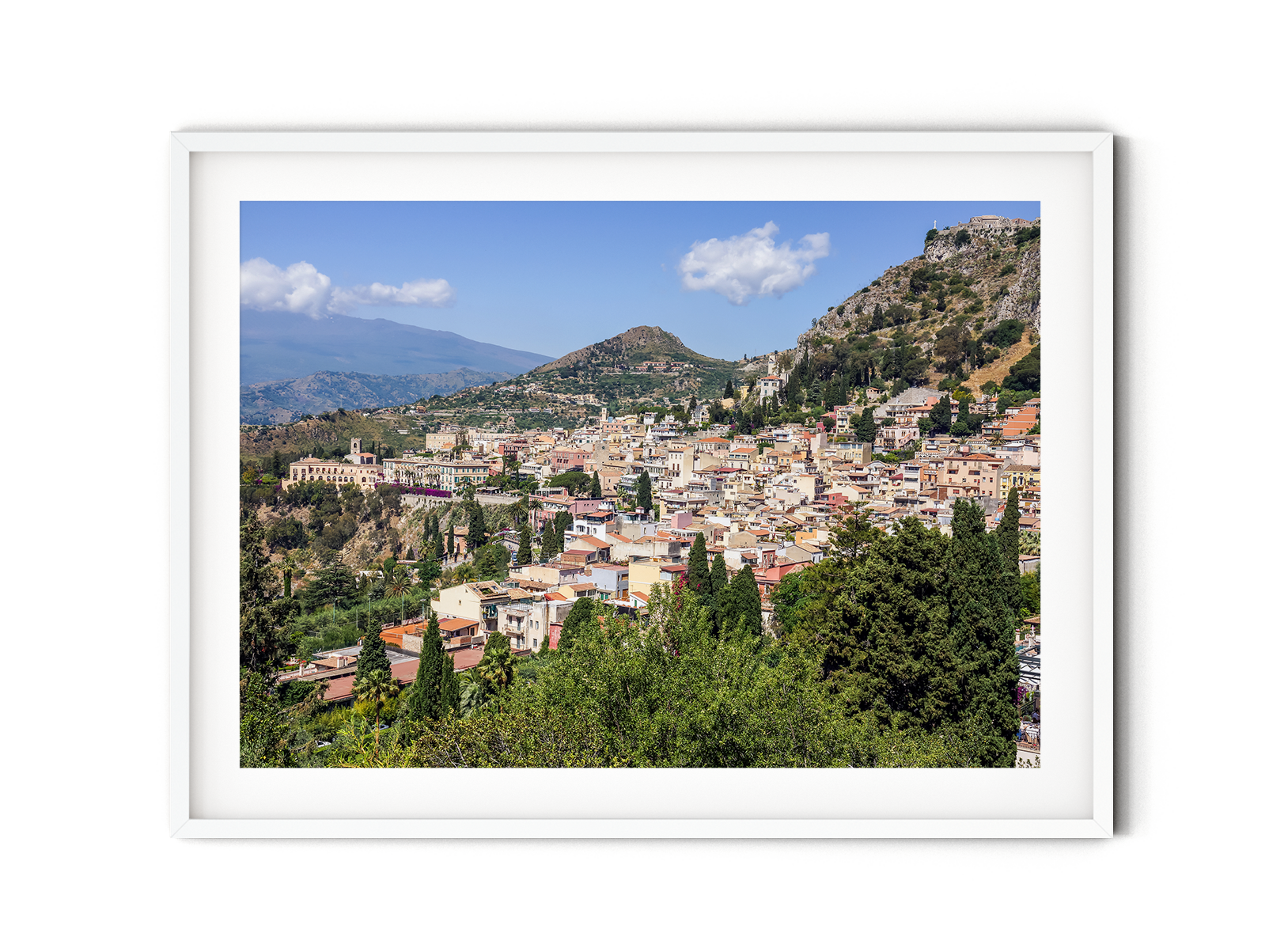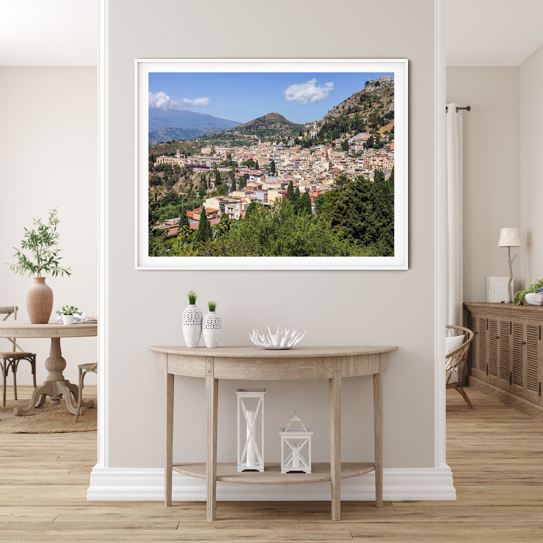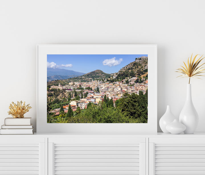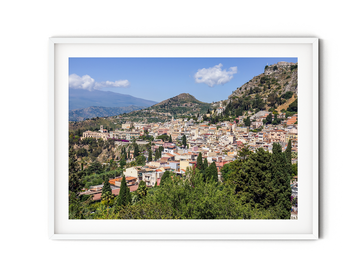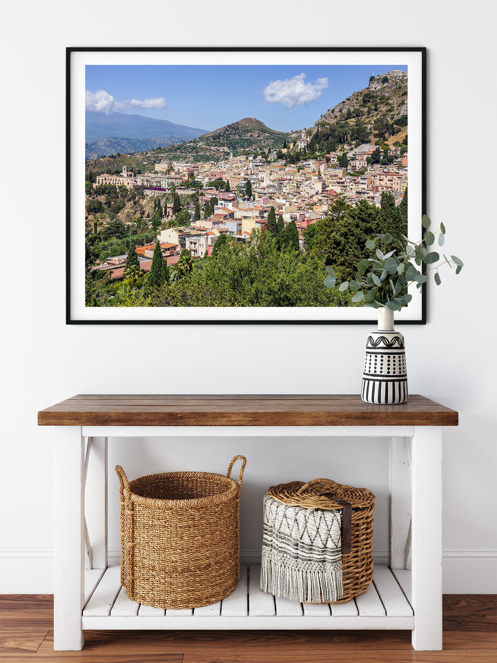 Immerse yourself in the picturesque beauty of Taormina, a charming village in Sicily, with this pretty landscape poster. The city's history traces back to the Sikelers, and its present-day incarnation is a re-establishment from the Middle Ages after the ancient city was destroyed by the Arabs. Let the captivating Italian landscape inspire you as you bring the enchanting charm of Sicily into your home with this poster print. Allow the beauty of Taormina's scenic vistas to transport you to the idyllic landscapes of Italy, creating a sense of tranquility and allure in your living space.