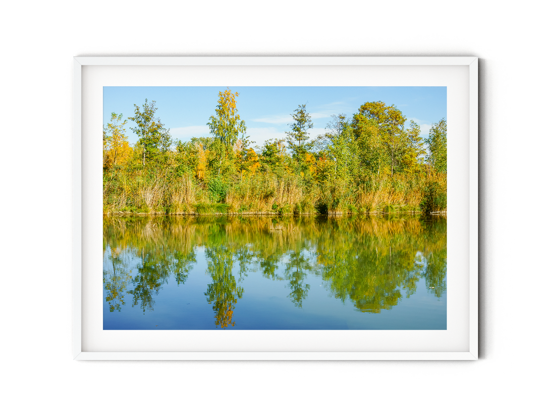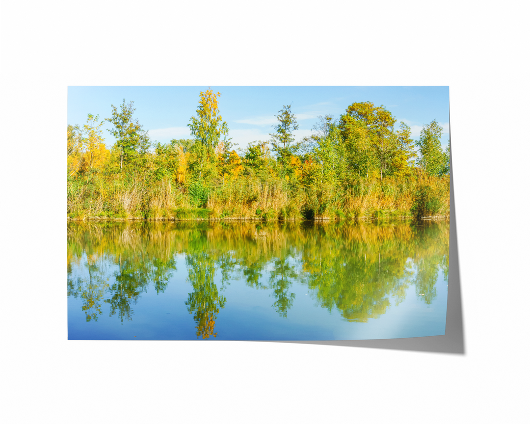 Embrace the beauty of the fall season with this stunning nature print capturing vibrant fall foliage. In this photograph, autumn trees are reflected in the tranquil waters of a serene lake, creating a mesmerizing scene where the yellow and green leaves beautifully contrast with the clear, bright blue sky. Invite the essence of fall into your home with this captivating landscape wall art, and let the colors of autumn transform your space.