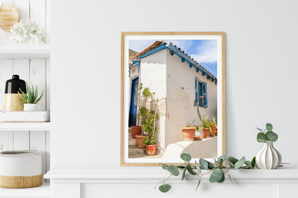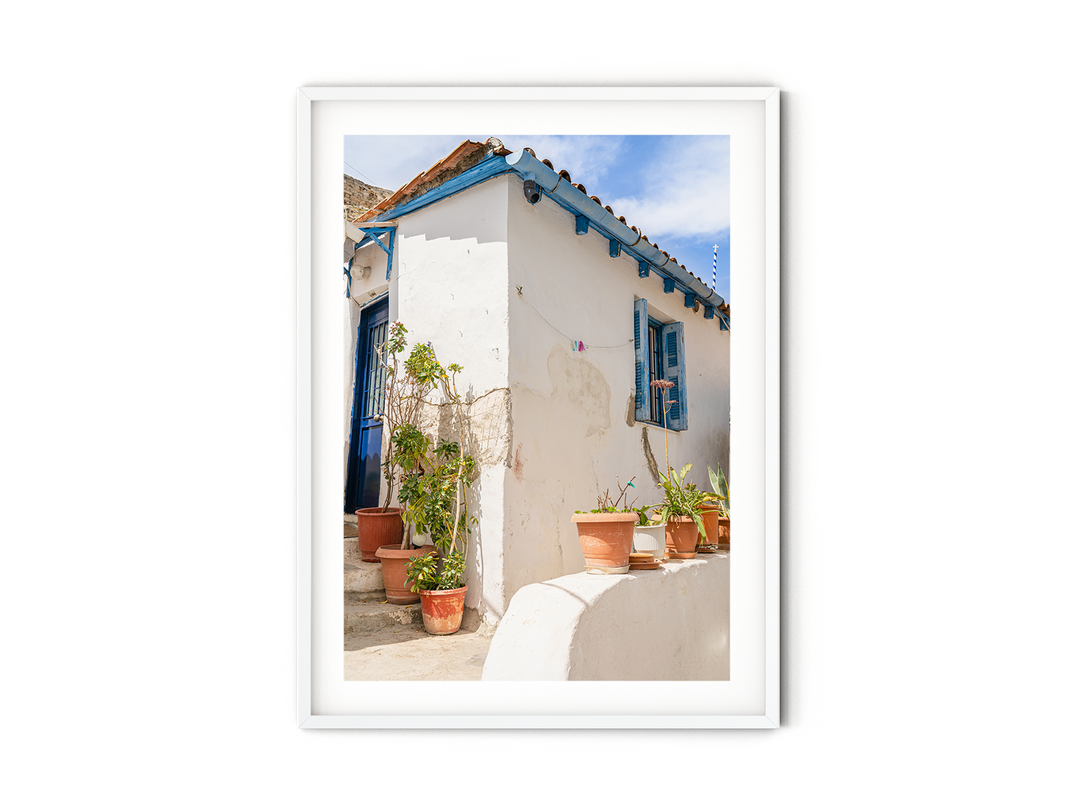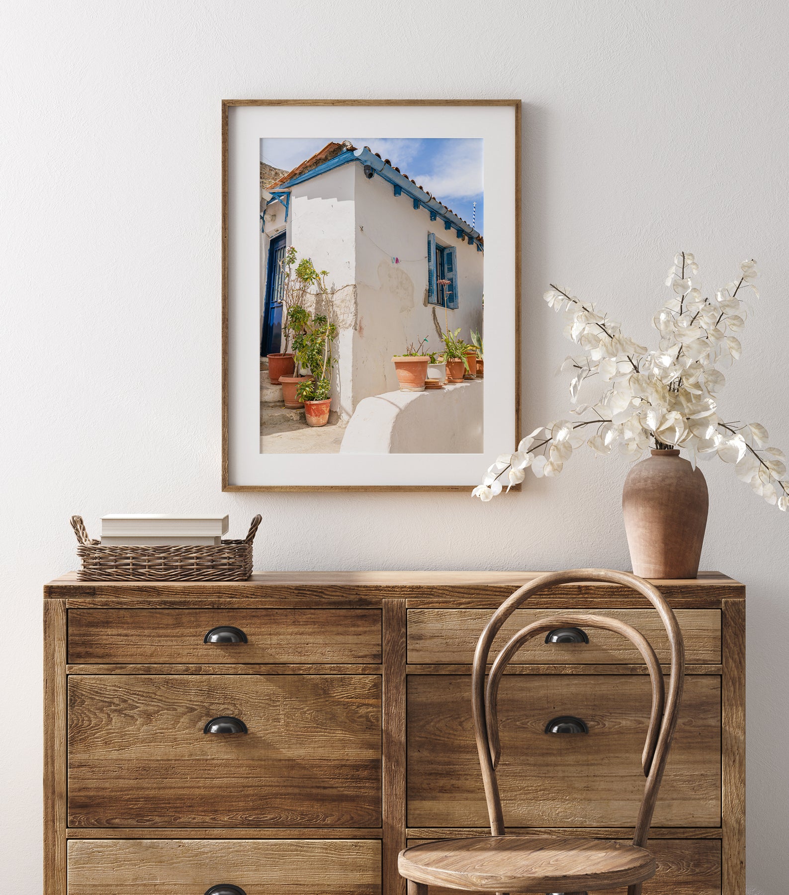Transport yourself to the idyllic streets of Anafiotika in Athens with this stunning photography print of a traditional blue and white house. Nestled in the heart of Anafiotika, a small neighborhood at the foot of the hill of the Acropolis, this charming house is a true representation of Greek architecture and design. With its whitewashed walls and bright blue accents, this house exudes the magical atmosphere reminiscent of the Cyclades. Whether you're a lover of travel, architecture, or simply drawn to the magic of Greece, this photography print is sure to transport you to the charming streets of Anafiotika and add a touch of Mediterranean charm to your space.