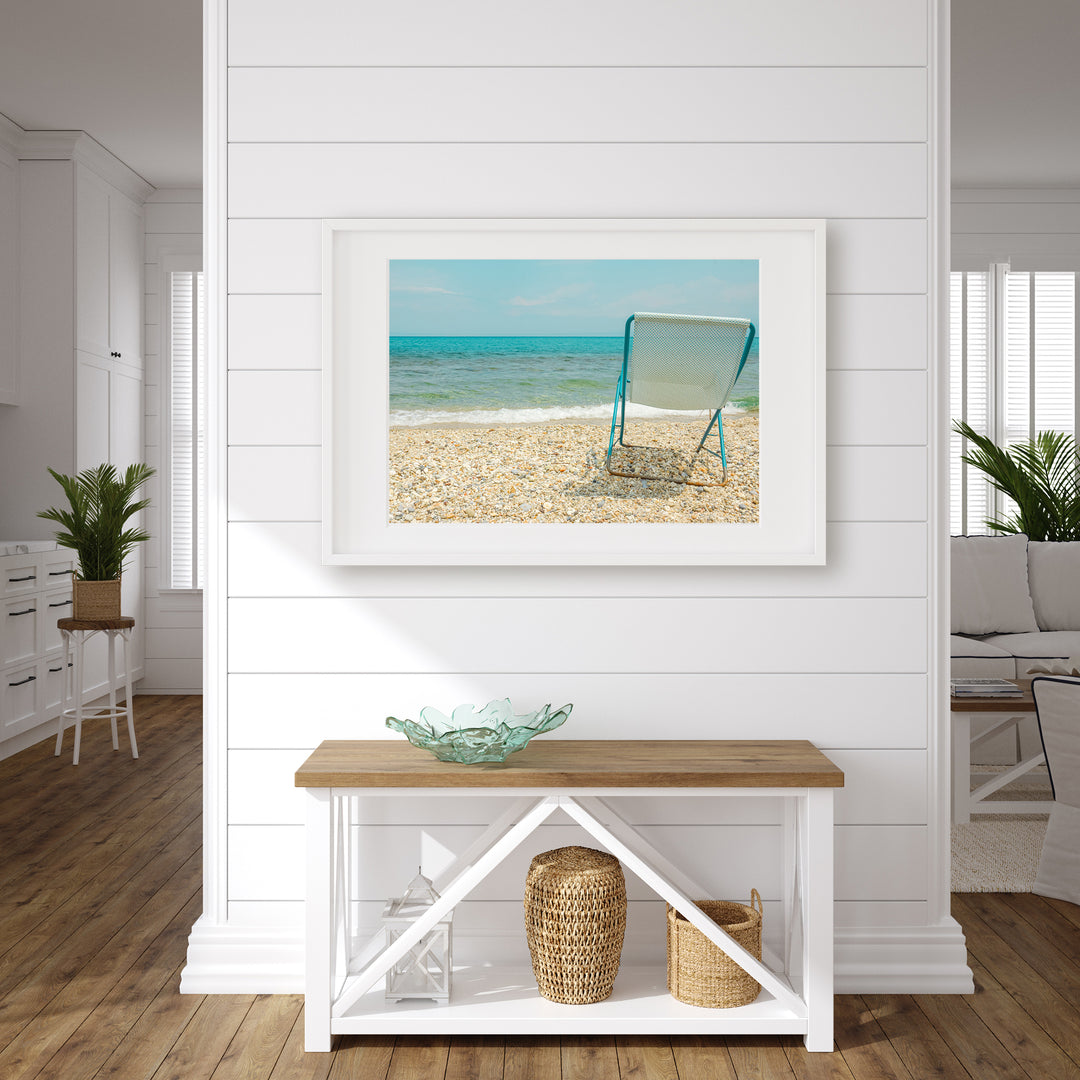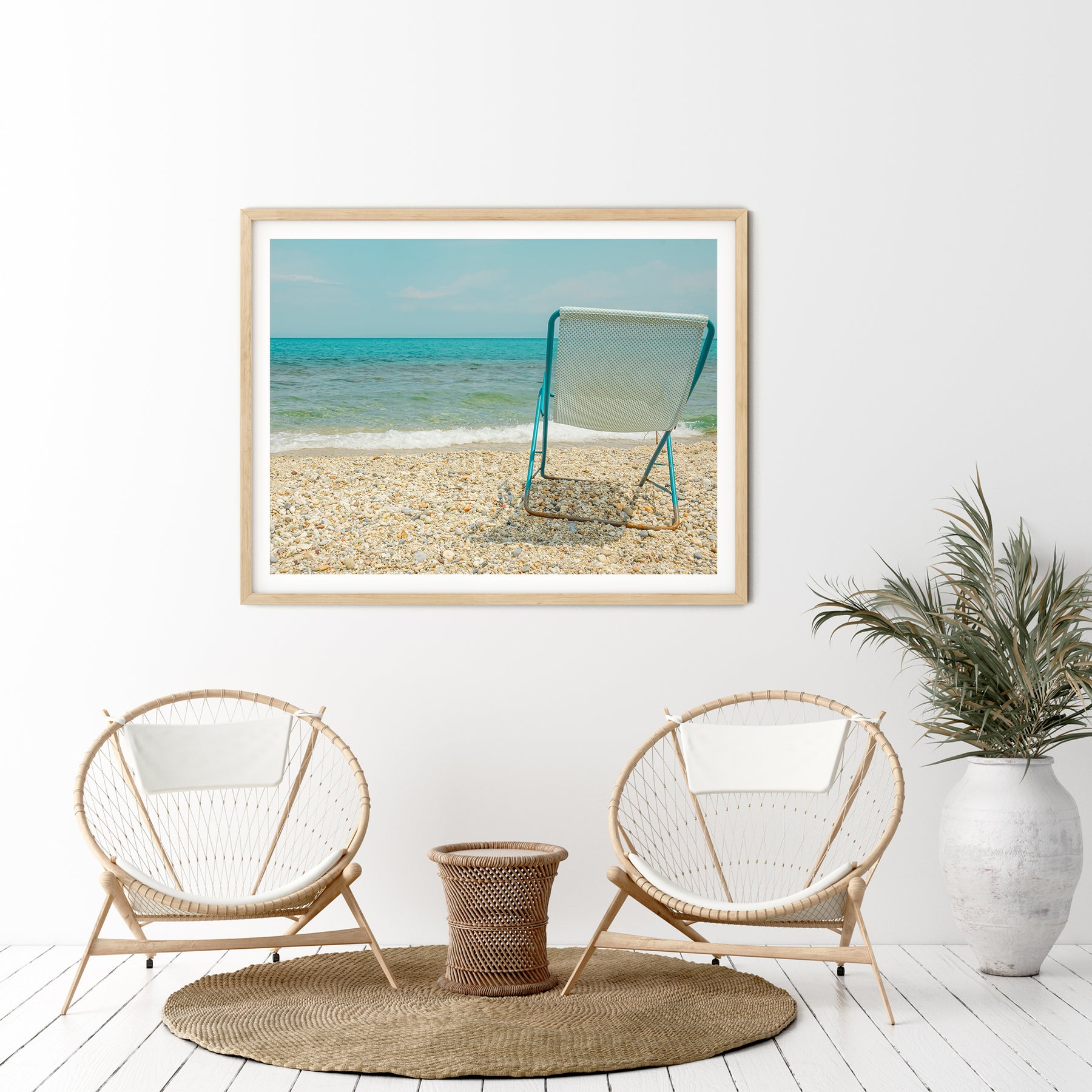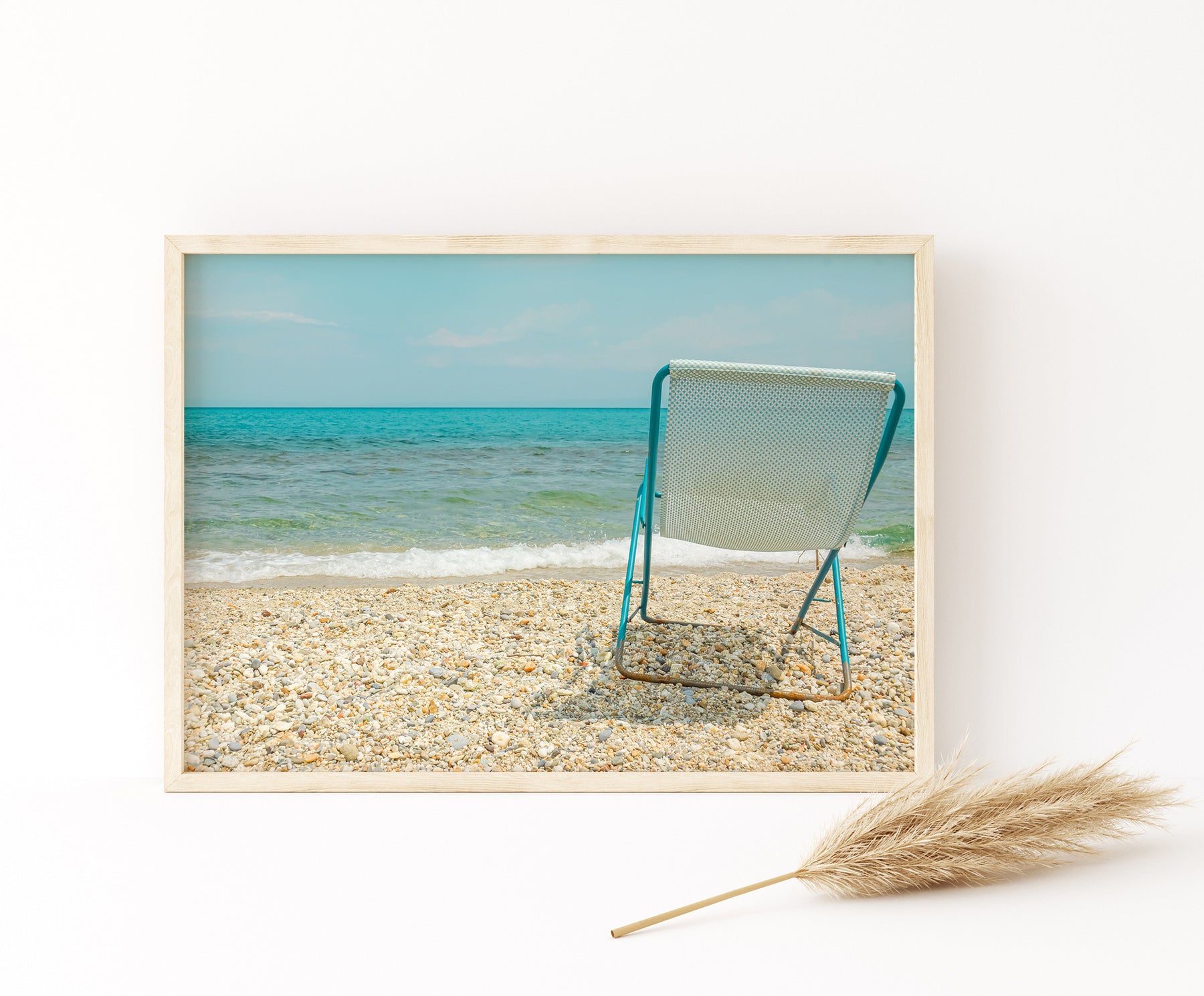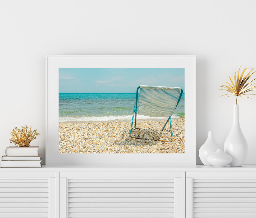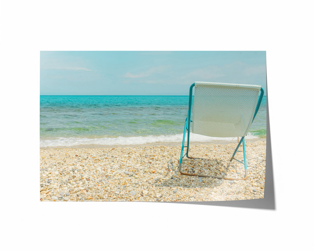 Enjoy a day by the sea with this lovely photography print of a retro-style beach chair. This eye-catching wall art print of a vintage beach chair against a backdrop of crystal clear turquoise waters and a blue sky will keep summer memories alive. This print will transform your living space into a coastal paradise instantly. The vintage style of the chair adds a touch of retro charm to any room, while the soothing blue hues and natural elements of the image create a calming atmosphere that will transport you to the beach with just a glance. Whether you're a beach lover or simply appreciate the timeless allure of retro design, this photography print is the perfect addition to your beach themed home decor.