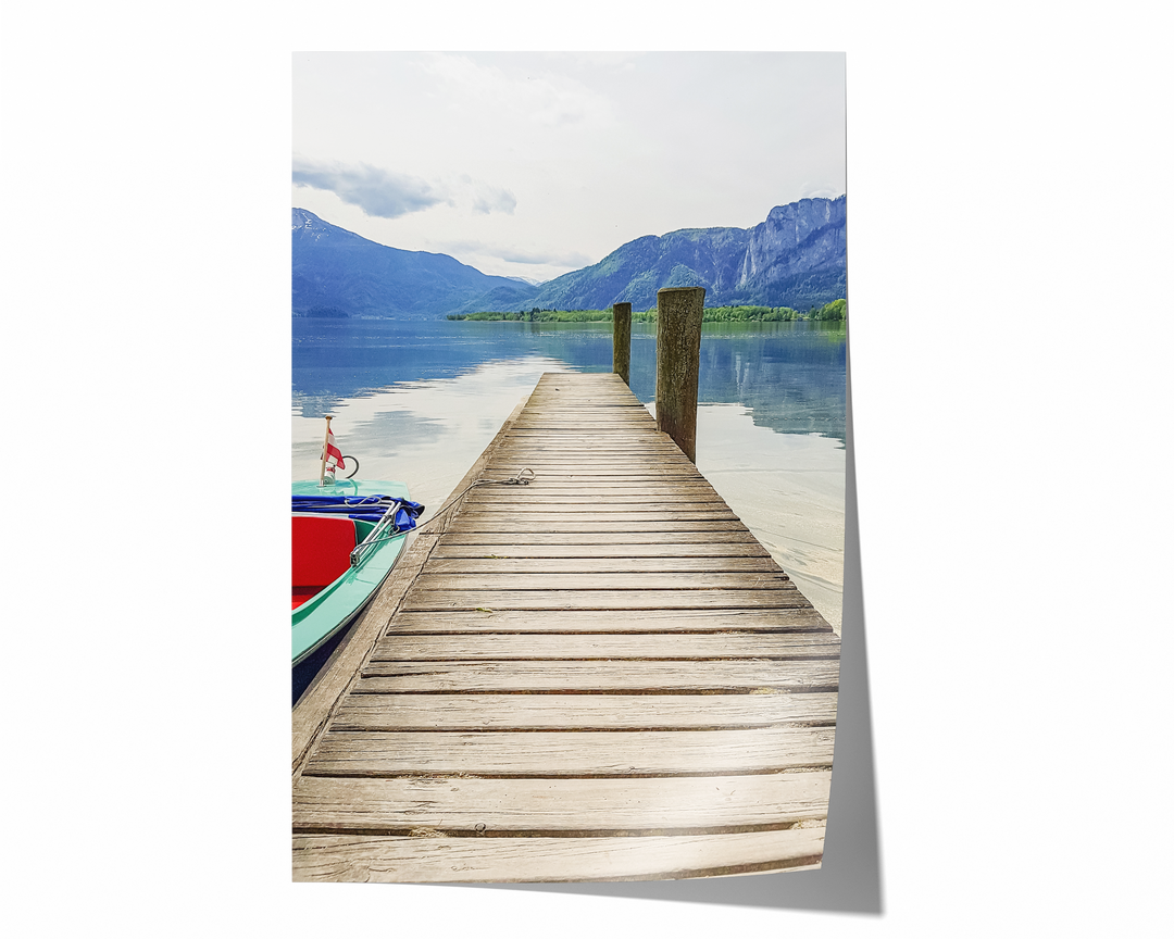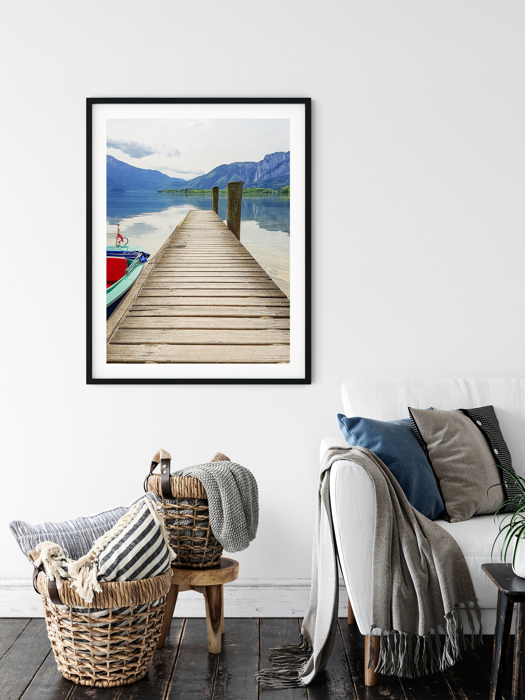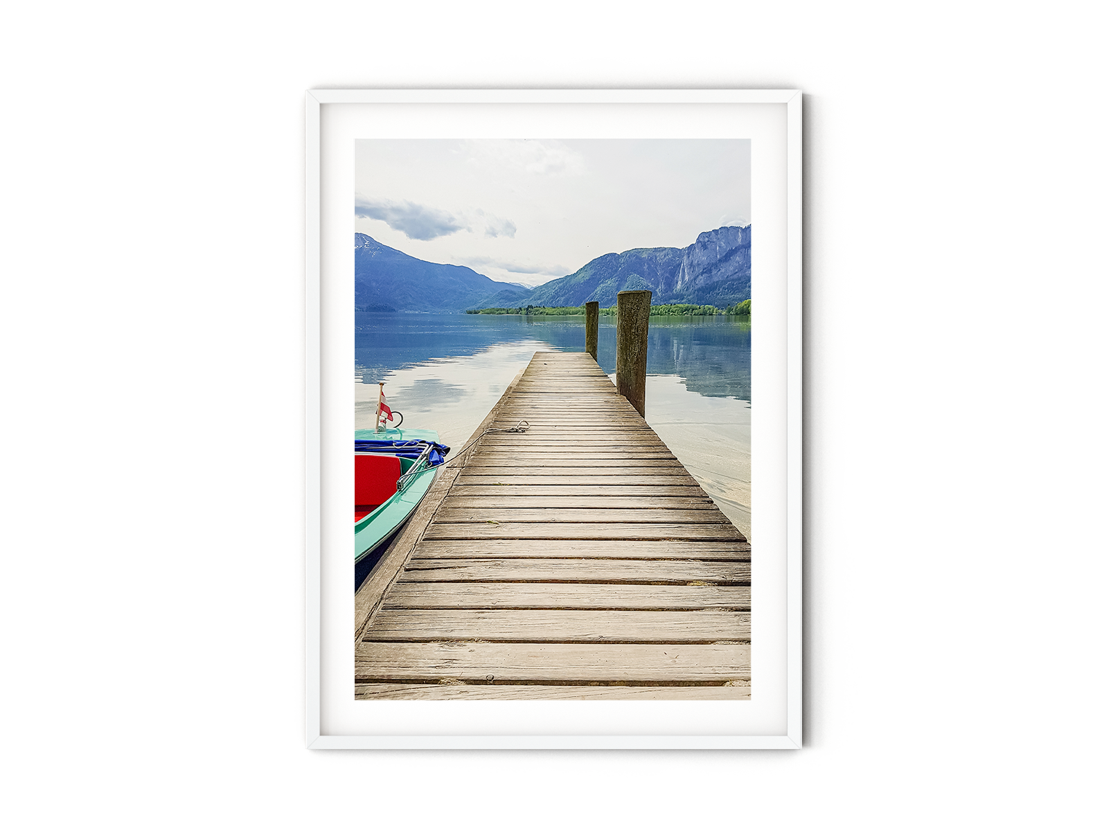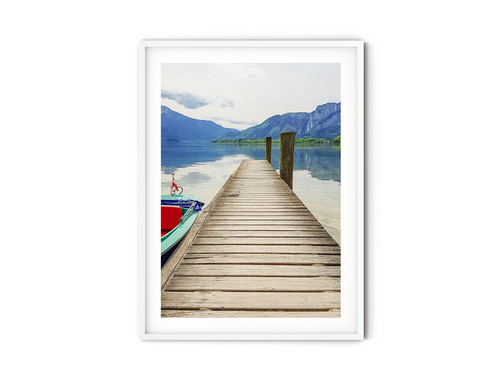 Transport yourself to the picturesque Austrian Salzkammergut with this captivating fine art photography print. Behold the tranquil beauty of a wooden boat dock, gracefully extending into the calm waters of a serene lake. The scene is a perfect harmony of nature and human craftsmanship, inviting you to wander along the dock and embrace the soothing atmosphere of this breathtaking landscape. Hang this print in your home or office and let the serene beauty of the Austrian Salzkammergut fill your surroundings with tranquility.