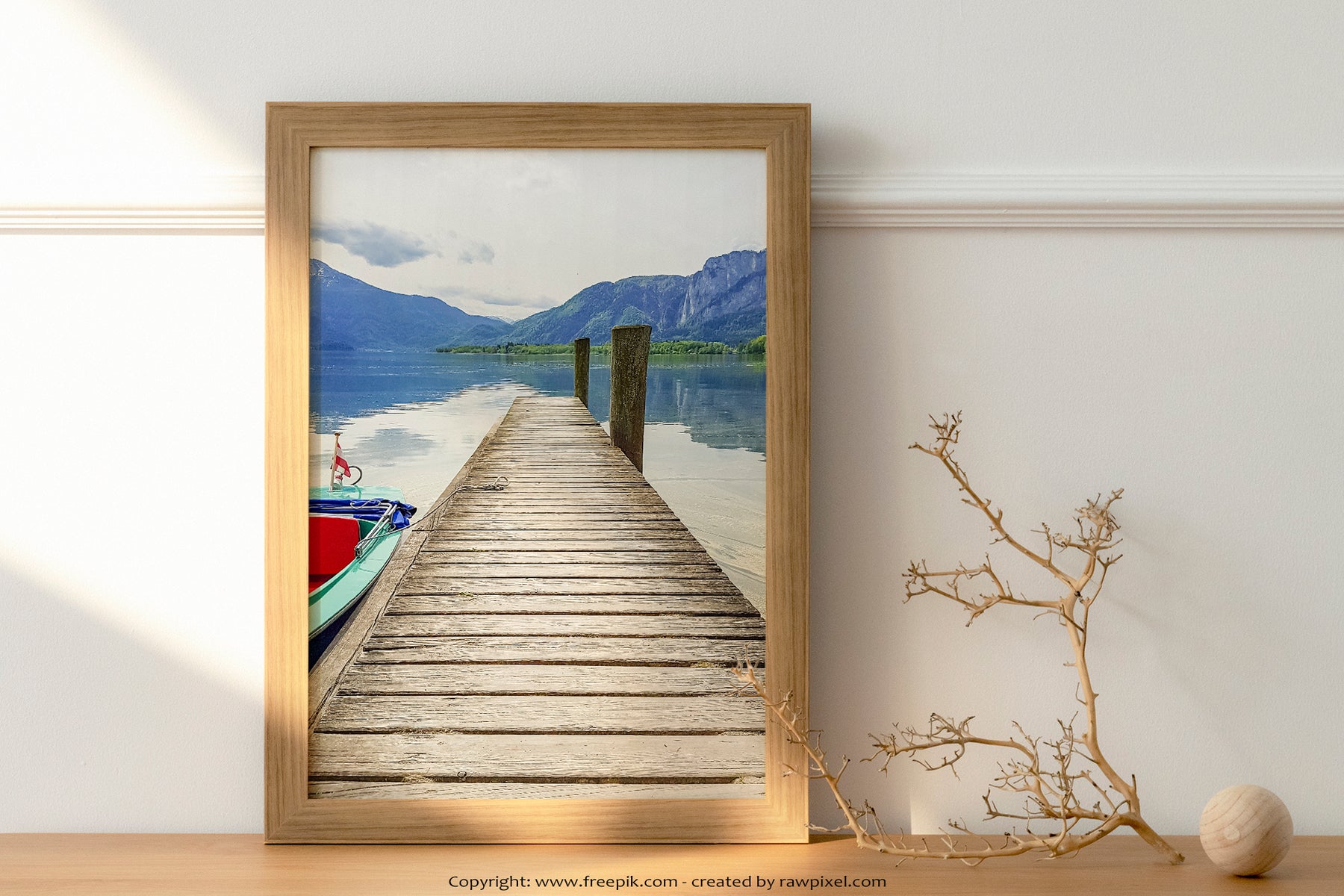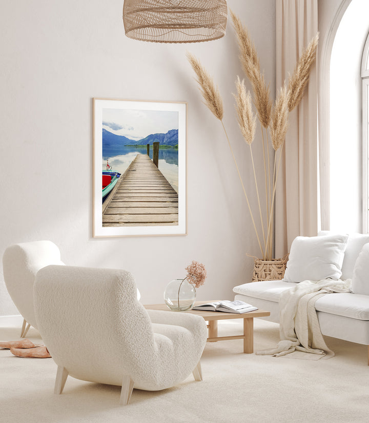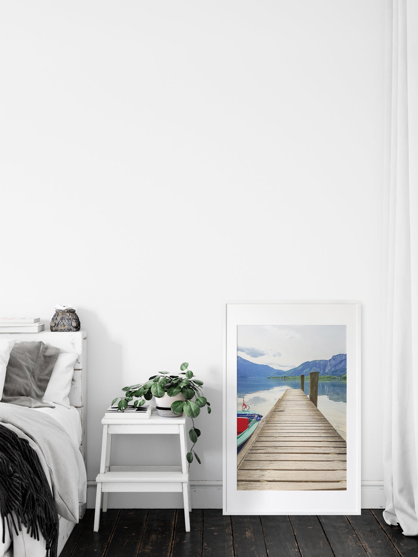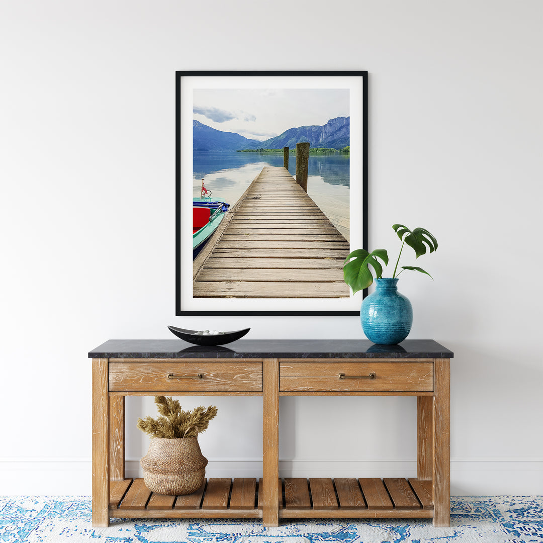 Transport yourself to the picturesque Austrian Salzkammergut with this captivating fine art photography print. Behold the tranquil beauty of a wooden boat dock, gracefully extending into the calm waters of a serene lake. The scene is a perfect harmony of nature and human craftsmanship, inviting you to wander along the dock and embrace the soothing atmosphere of this breathtaking landscape. Hang this print in your home or office and let the serene beauty of the Austrian Salzkammergut fill your surroundings with tranquility.
