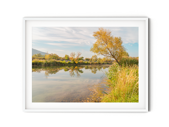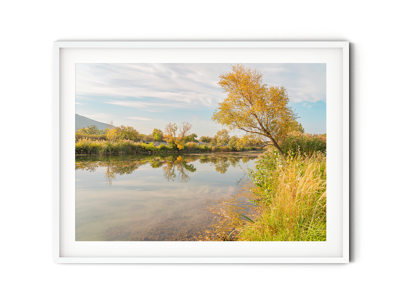 Embrace the tranquility of autumn with this beautiful fine art fall photography print. The peaceful lake reflects the vibrant hues of fall, creating a picturesque scene that beautifully captures the essence of nature. The still waters mirror the surrounding shoreline, evoking the calmness of an Indian summer day. Elevate your home decor with this high-quality photo print, and infuse your space with the serene and vibrant spirit of fall. Let the beauty of this landscape print bring the soothing atmosphere of nature into every corner of your home.