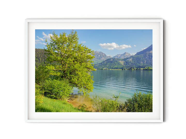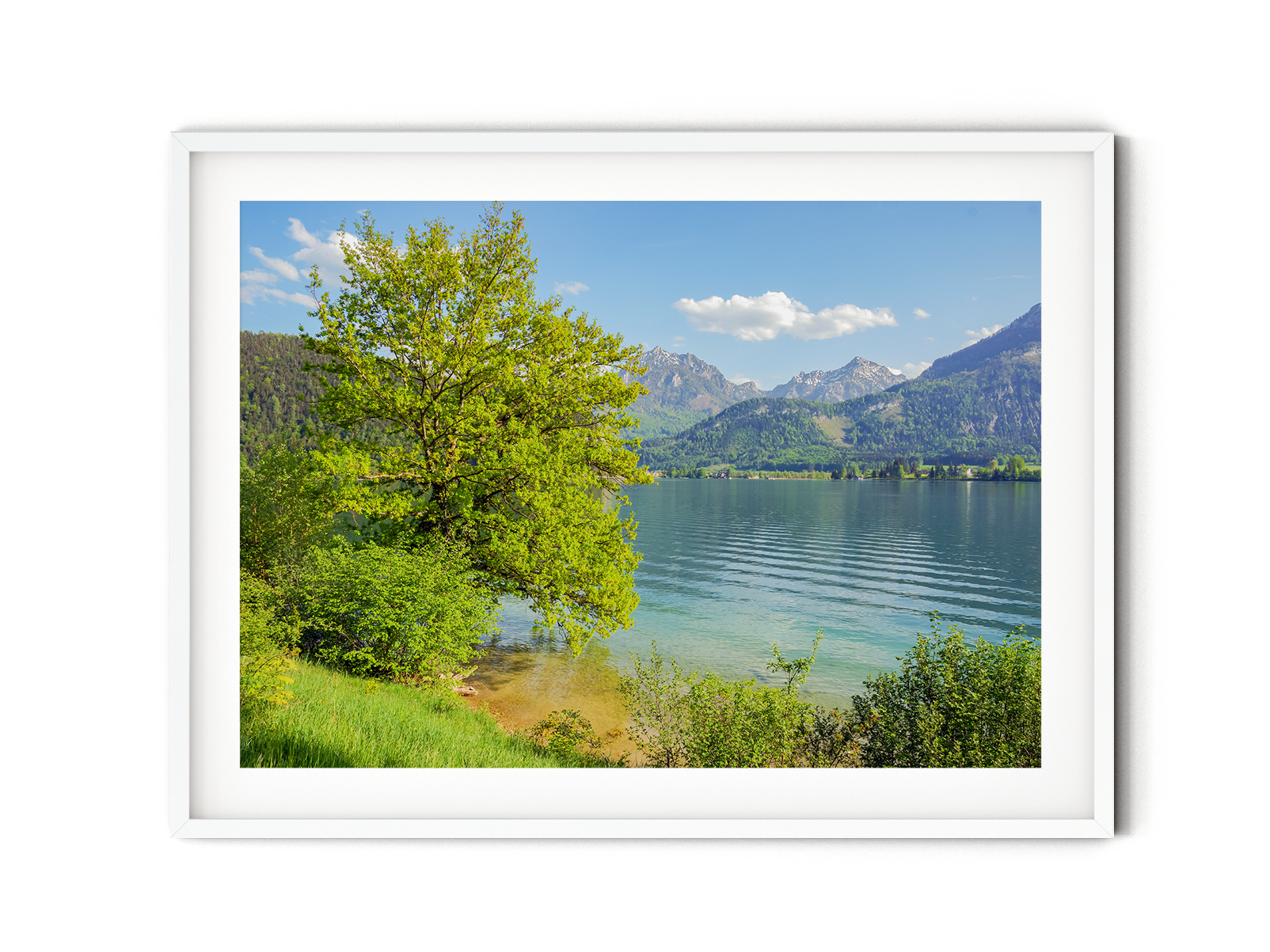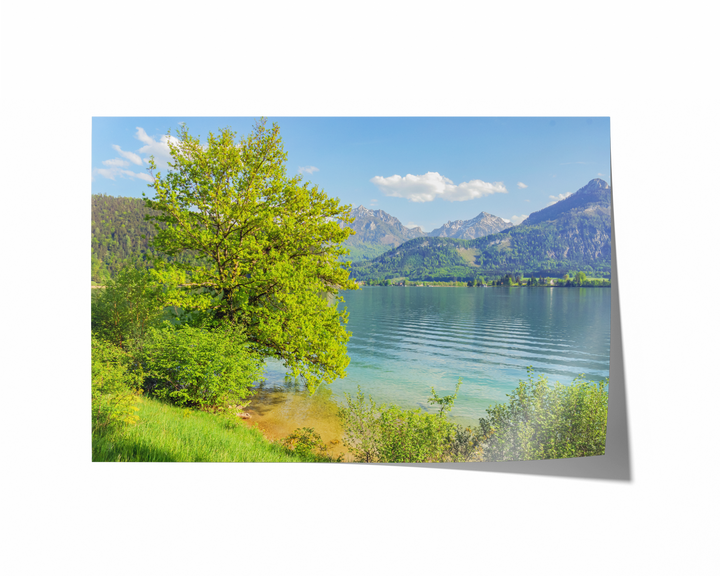 Elevate your home decor with this stunning landscape poster featuring the Wolfgangsee, a peaceful mountain lake in the Salzkammergut, Austria, basking in the warm spring sun. Majestic Austrian mountains provide a breathtaking backdrop, while vivid colors and a calm atmosphere transport you to the serene shores of this picturesque lake. This nature print brings the peace and quiet of nature into your home, creating a harmonious look that captures the essence of Austria's natural beauty. Immerse yourself in the tranquil charm of the Salzkammergut region and infuse any room with the serene allure of the Wolfgangsee.