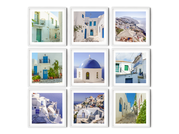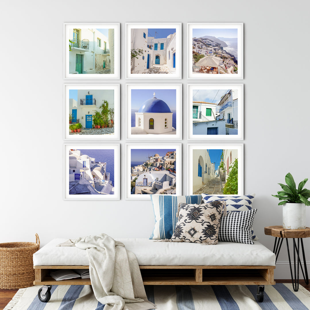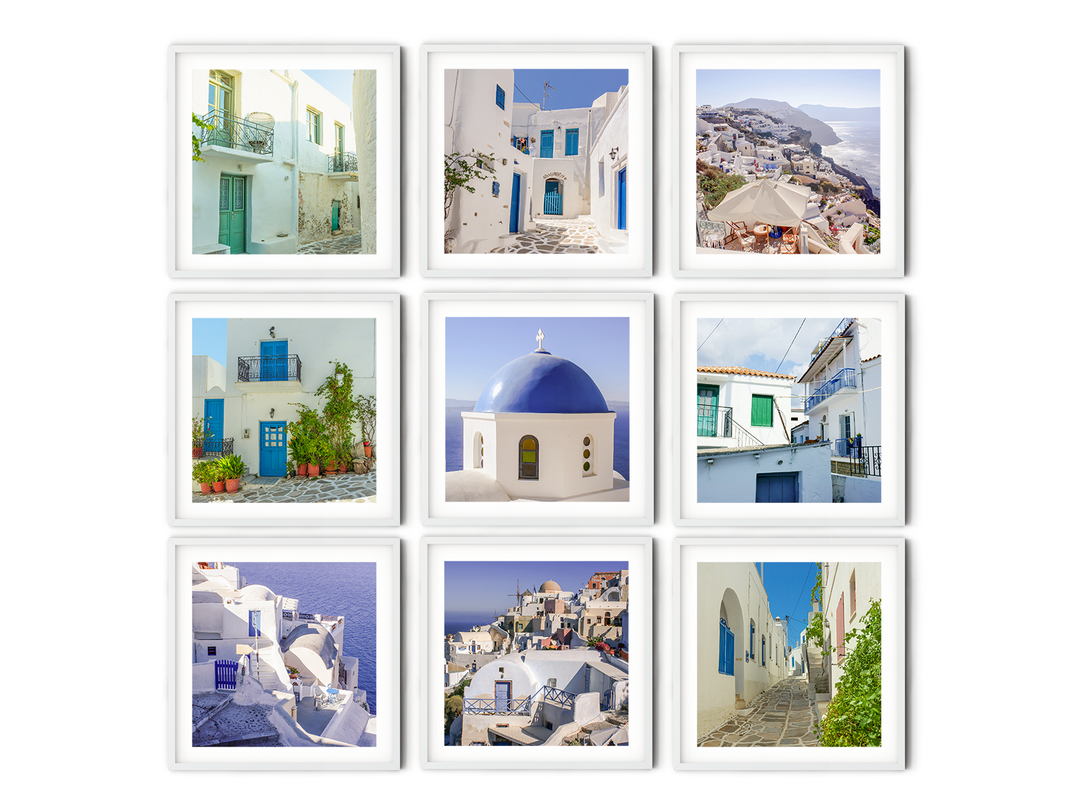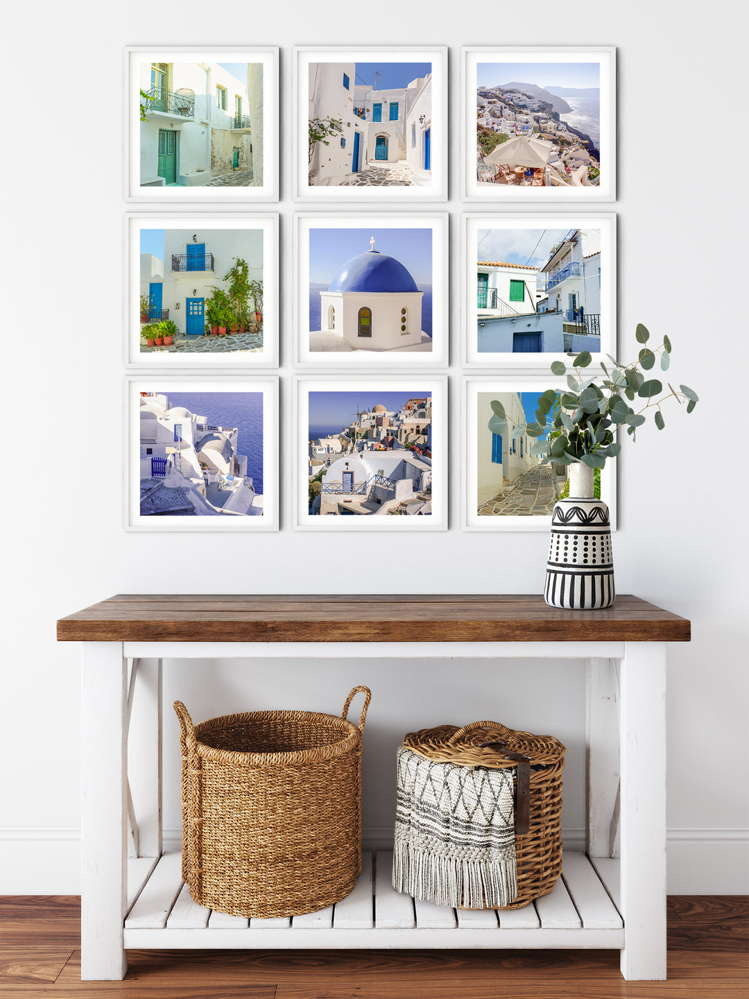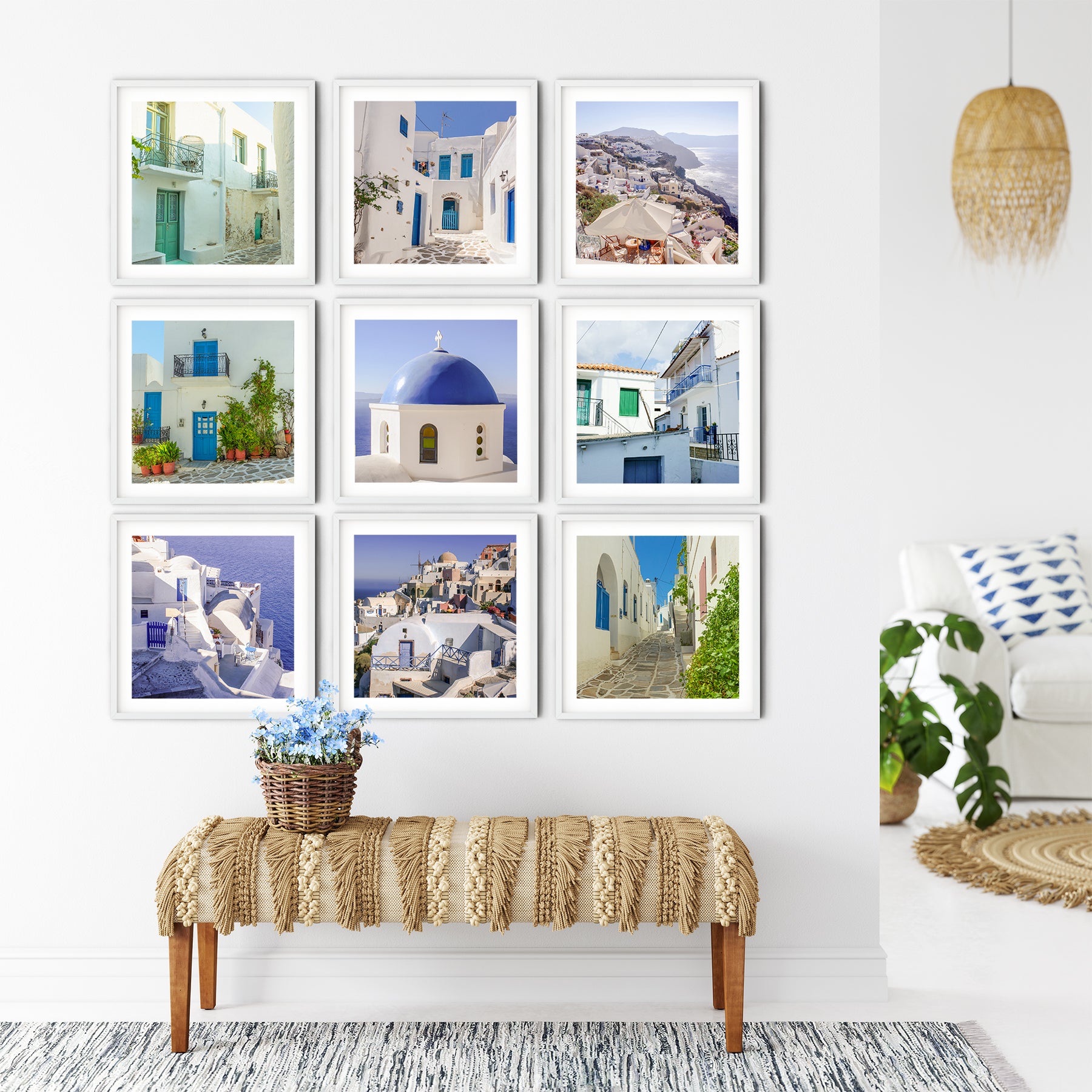 Capture the captivating beauty of the Greek islands with this gallery wall set of 9 square photography prints. Each print showcases the unique allure and picturesque landscapes of different Greek islands, allowing you to experience their charm from the comfort of your own home. From the turquoise waters to the charming whitewashed villages, these prints encapsulate the essence of the Greek islands and bring a touch of their innate beauty into your home. This gallery wall set is a perfect addition to elevate your Mediterranean style decor and transport you to the idyllic beauty of the Greek islands.