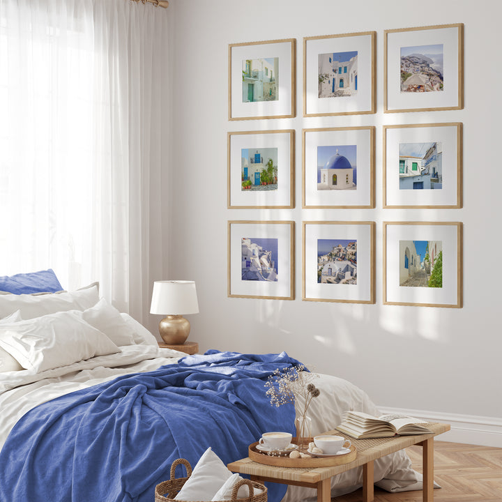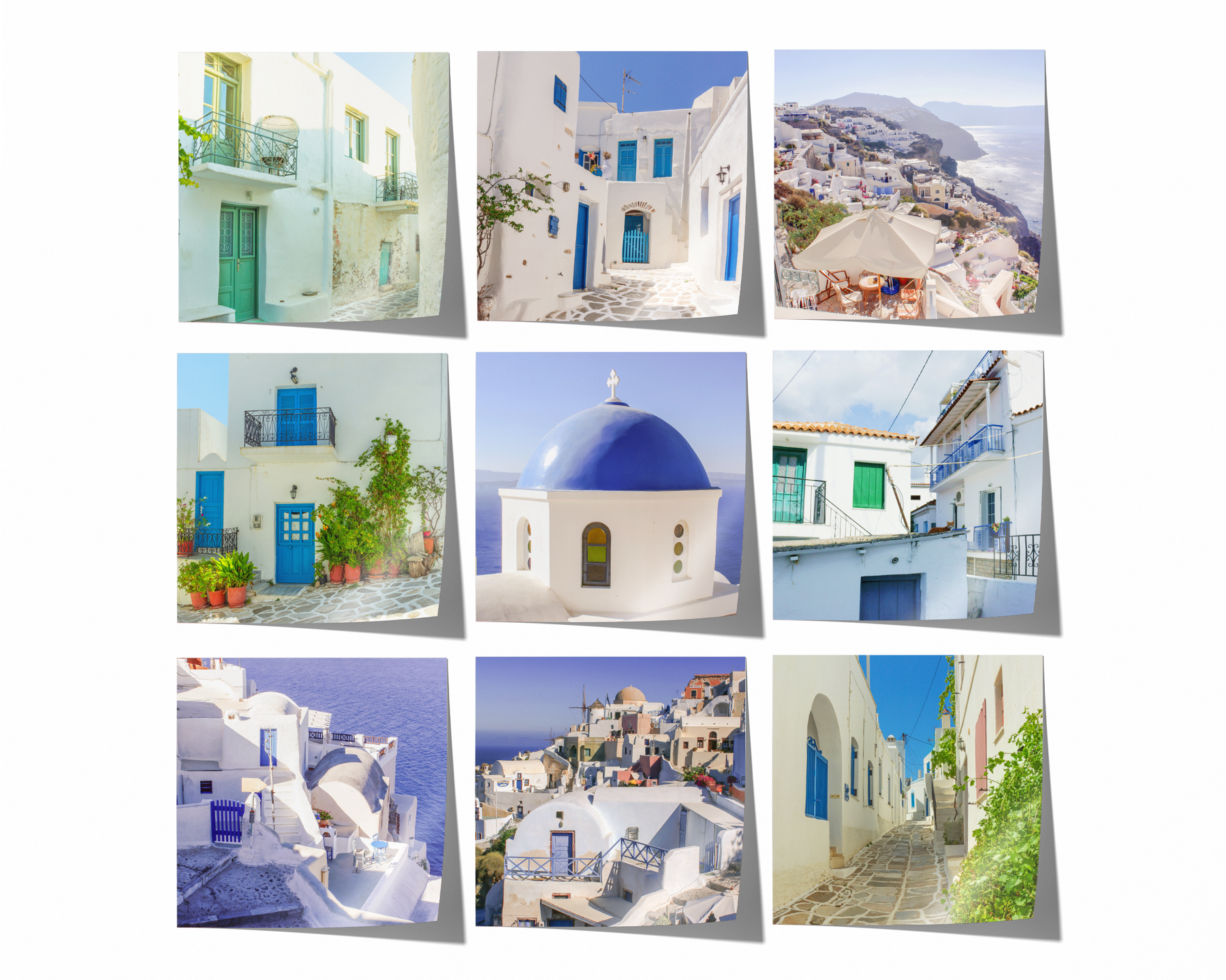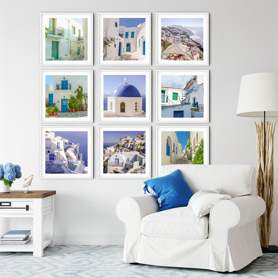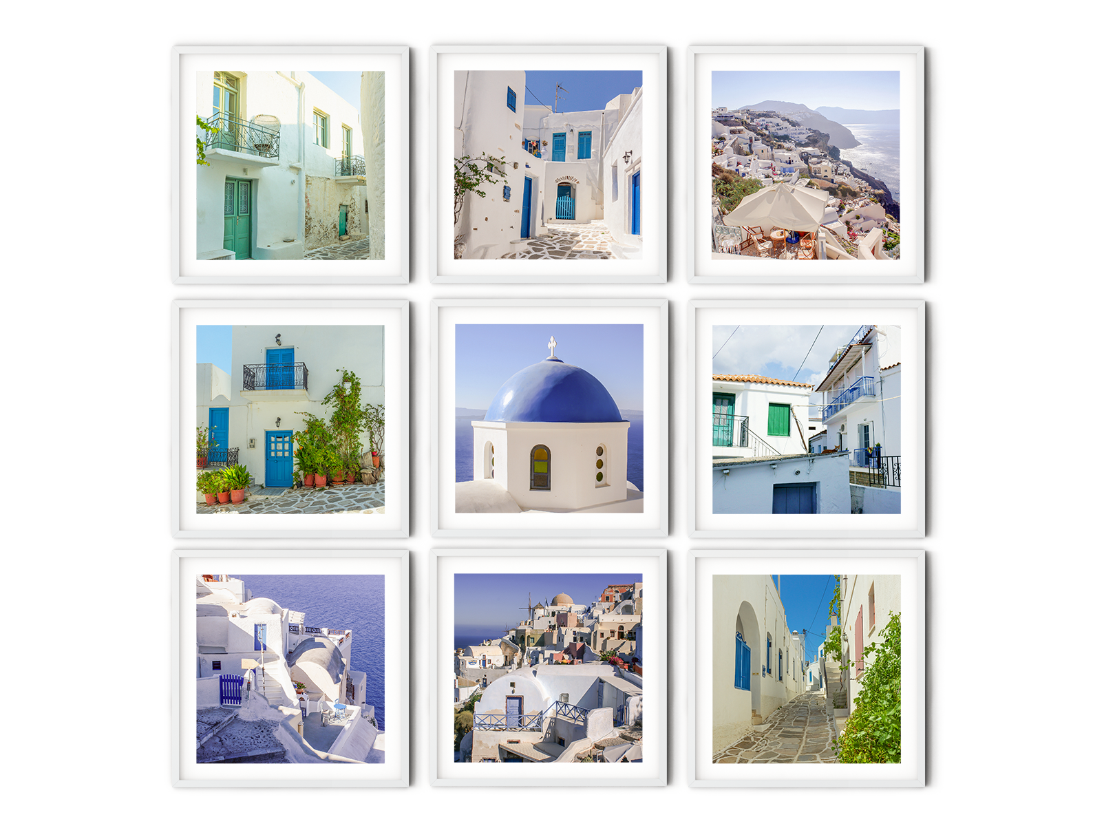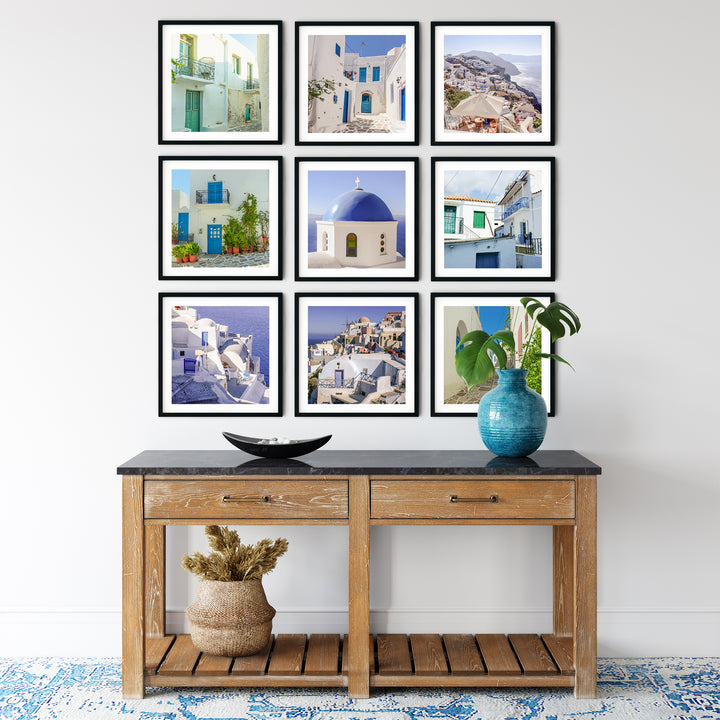 Capture the captivating beauty of the Greek islands with this gallery wall set of 9 square photography prints. Each print showcases the unique allure and picturesque landscapes of different Greek islands, allowing you to experience their charm from the comfort of your own home. From the turquoise waters to the charming whitewashed villages, these prints encapsulate the essence of the Greek islands and bring a touch of their innate beauty into your home. This gallery wall set is a perfect addition to elevate your Mediterranean style decor and transport you to the idyllic beauty of the Greek islands.