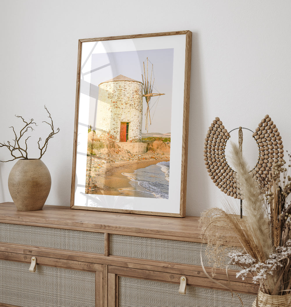Capture the timeless beauty of an old windmill on the beach of Kalyves in Halkidiki, Greece with this beautiful fine art photography print. As the setting sun bathes the scene in a golden light, a warm and enchanting atmosphere is created. This travel print is the perfect gift for every Greece lover, offering a stunning visual reminder of the captivating allure and rich cultural heritage of this remarkable destination. Bring a touch of Greece's coastal charm and the magical ambiance of Kalyves into your home with this beautiful fine art print.