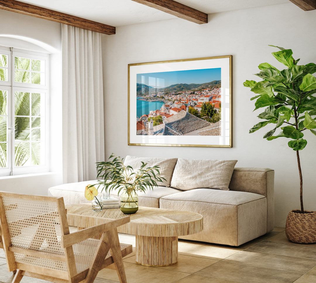 Looking out over Skopelos Town, the whitewashed houses with their terracotta roofs spread across the hillside, leading down to the harbor where boats rest in the calm Aegean waters. The narrow streets below wind through the town, hinting at the island’s quiet charm and everyday life. This photograph captures the balance of serenity and movement that defines Skopelos — a coastal town full of character. A perfect addition to any space, bringing the warmth of the Mediterranean and the beauty of island living into your home.