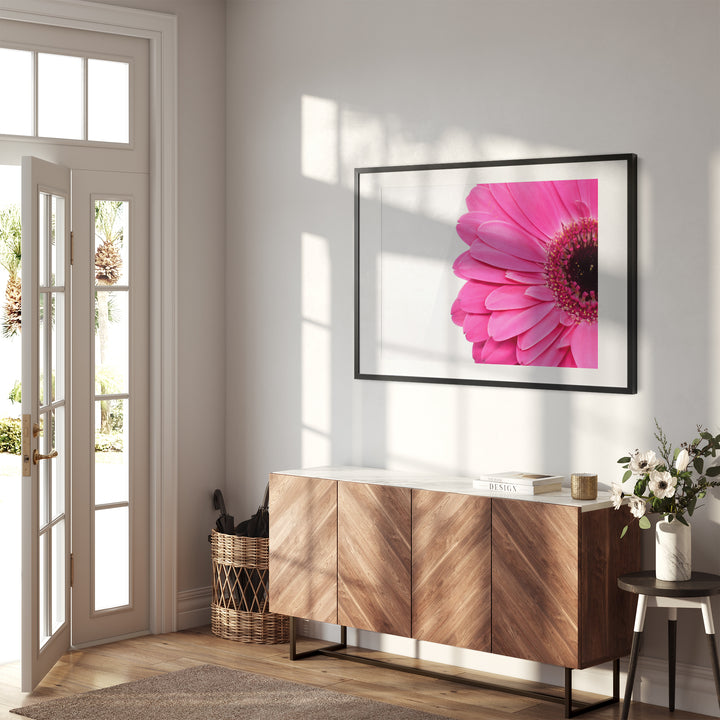 Embrace the modern charm of a pink Gerbera with this captivating floral poster. Gerbera flowers, distant relatives of the daisy family, thrive in warmth, and this print effortlessly imparts that same warmth to your living space. The striking beauty of this contemporary piece adds a touch of elegance and vibrancy to your home decor. Let the allure of this flower captivate your senses, bringing its timeless beauty into your daily life. Elevate your surroundings with this exquisite floral art print and savor the essence of nature's grace.
