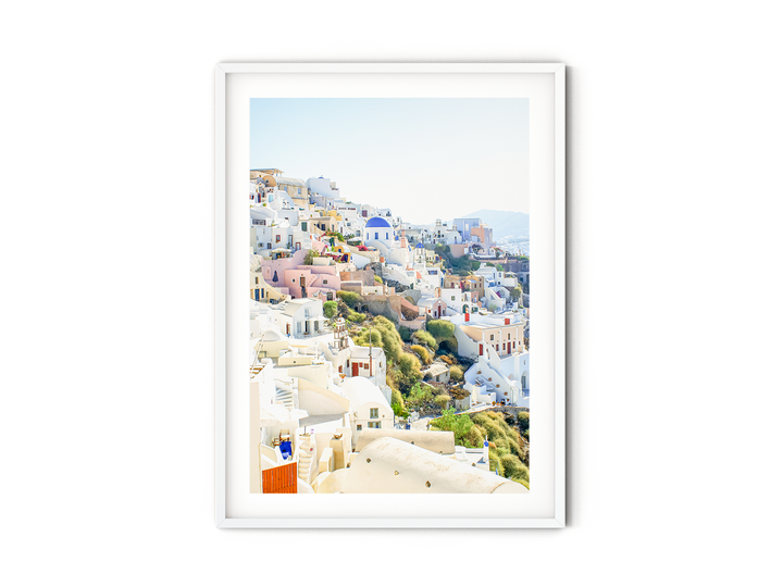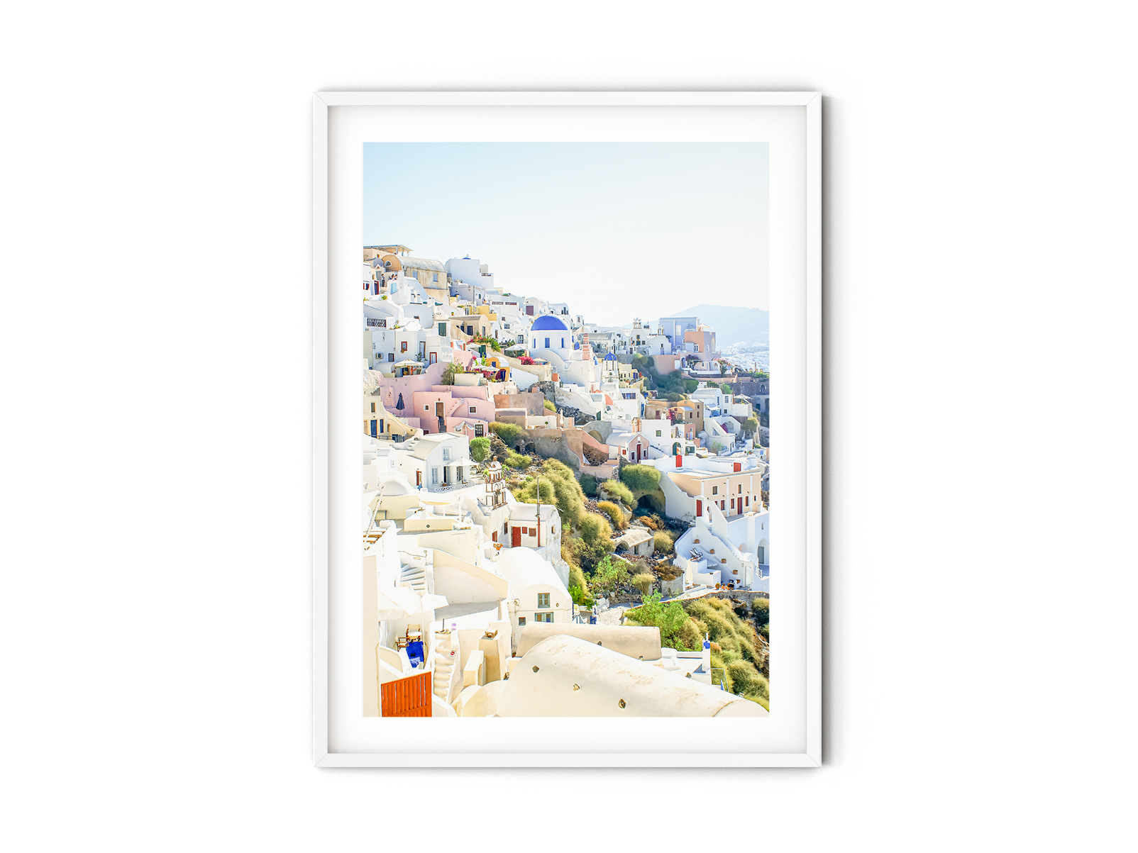 Step into the picturesque beauty of Santorini, the most famous of the Cycladic islands, with this summery travel poster capturing the essence of Greek summer. Behold the iconic blue and white houses, nestled on the steep rocky coast of the caldera, offering breathtaking views over the Aegean Sea. Transport yourself to the magic of Santorini and bring the charm of the Greek summer into your home with this captivating travel art print. Let the enchanting landscapes and timeless architecture of Santorini grace your walls and immerse yourself in the beauty of this beloved Greek island every day.