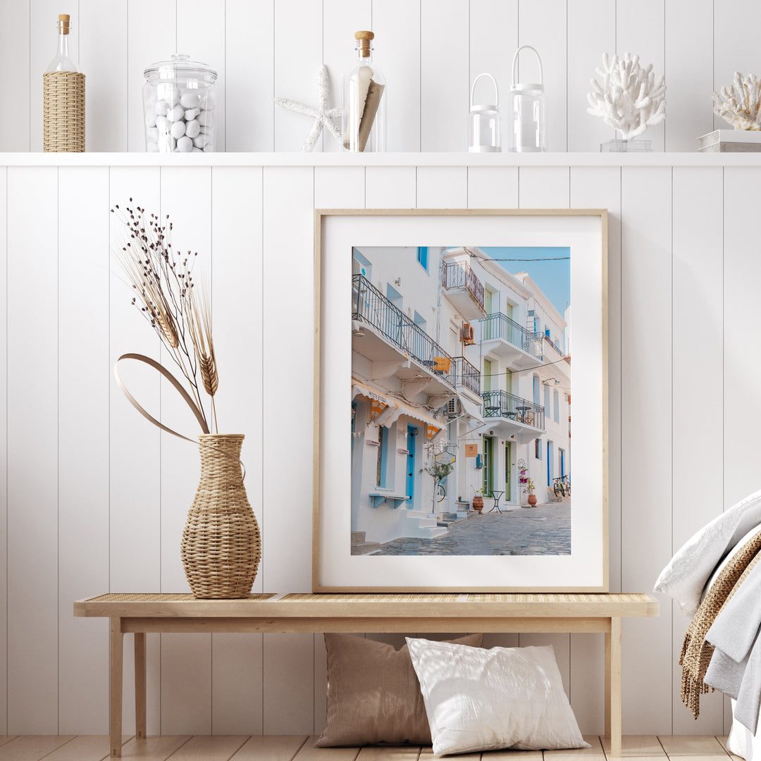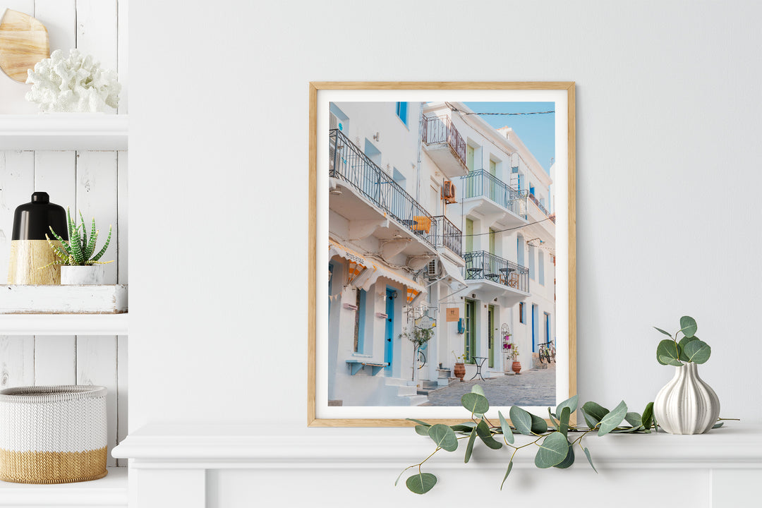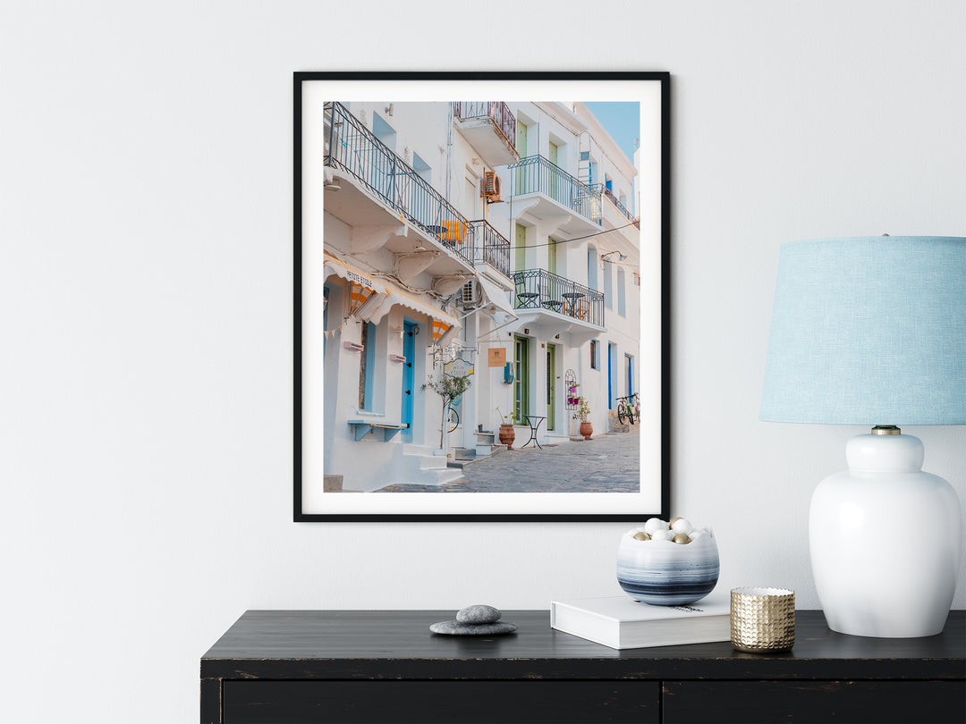 In the heart of Skopelos Town, narrow alleys wind through the whitewashed buildings, each one offering a glimpse into the island’s charming streets. The cobblestone path, framed by traditional Greek architecture, invites you to explore further into the town’s quiet corners. This photograph captures the essence of everyday life in Skopelos, where time seems to slow down as you wander through its peaceful, picturesque streets. Ideal for anyone who loves discovering hidden spots and the charm of island towns, this fine art print brings the authentic feel of Skopelos to your space.
