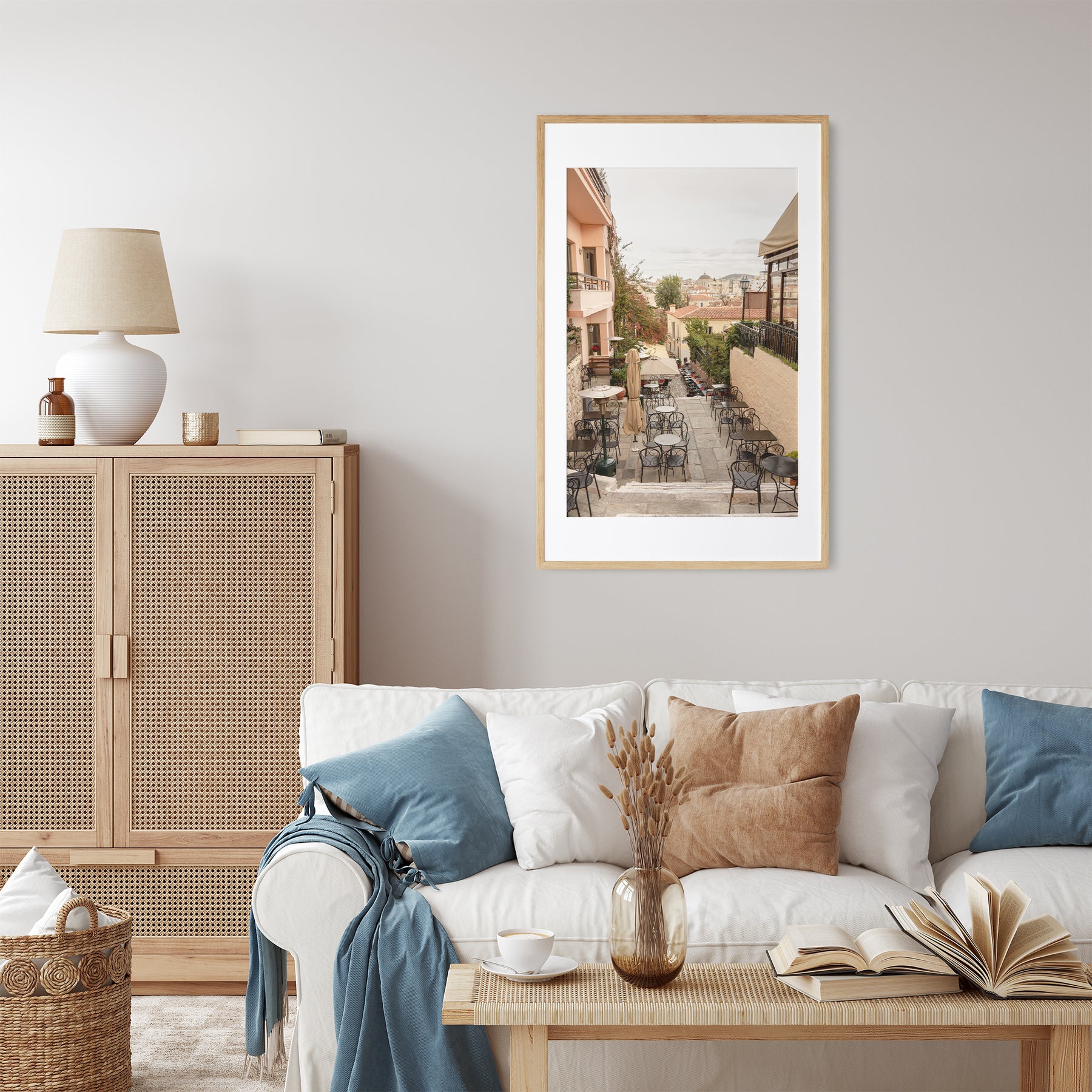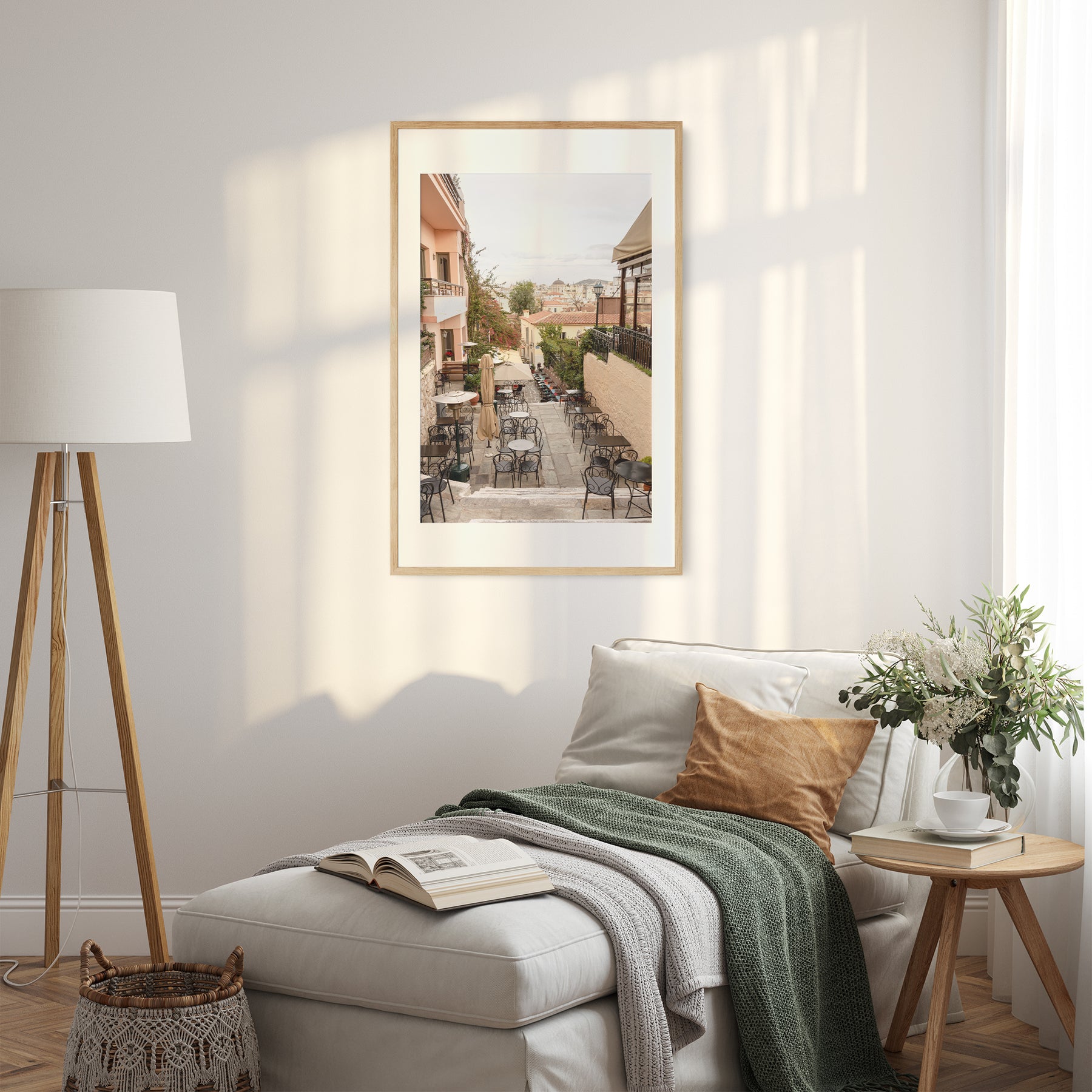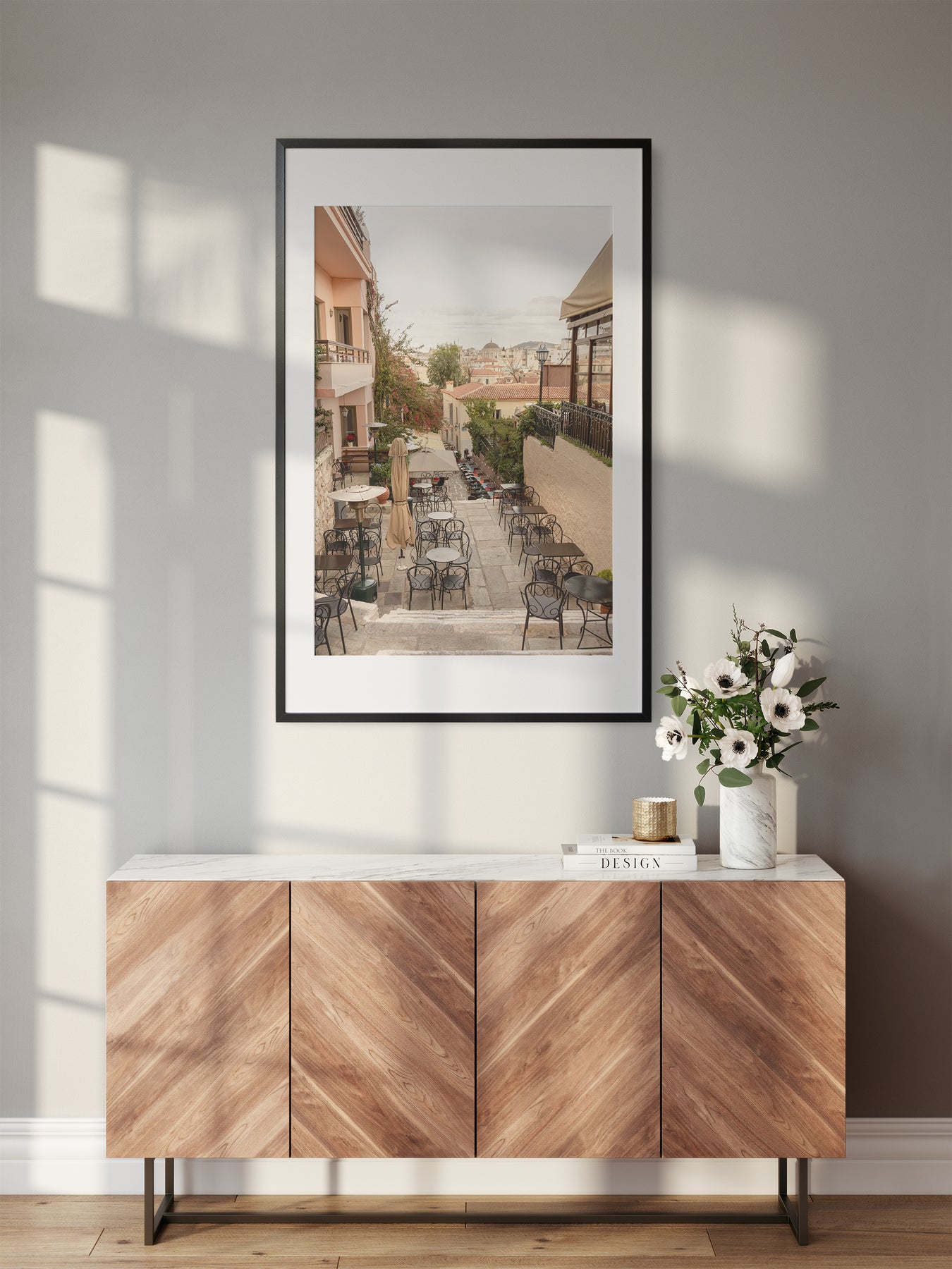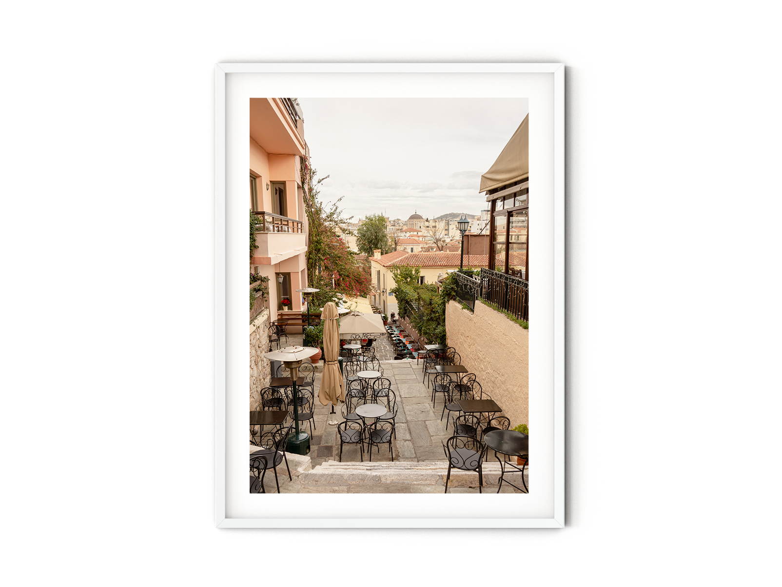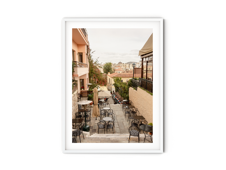 Experience the vibrant spirit of Athens' historic Plaka district with this beautiful fine art photography print. This enchanting composition transports you to a street cafe nestled within the winding lanes of this ancient Greek old town. The warm Mediterranean breeze, the aroma of freshly brewed coffee, and the ambiance of Plaka come to life in this captivating image. Ideal for travel enthusiasts and admirers of Greek culture, this travel print evokes the beauty of this timeless city. Bring the inviting atmosphere of Plaka into your home and let the heart of Athens be a part of your daily life.
