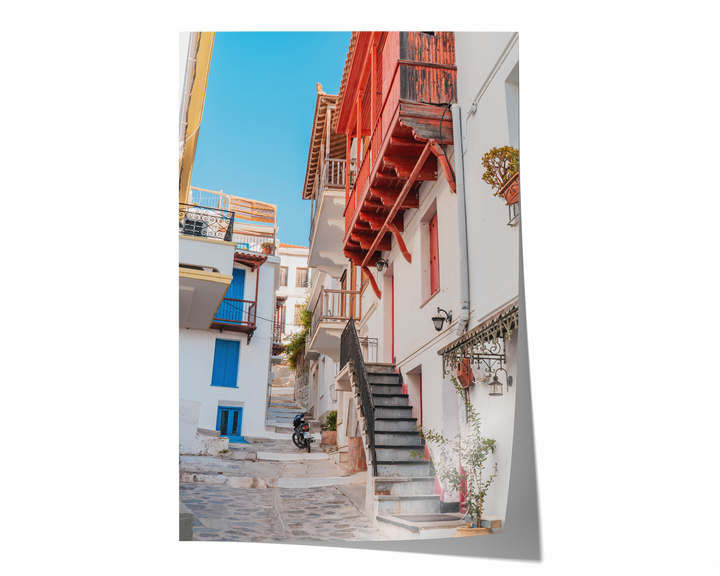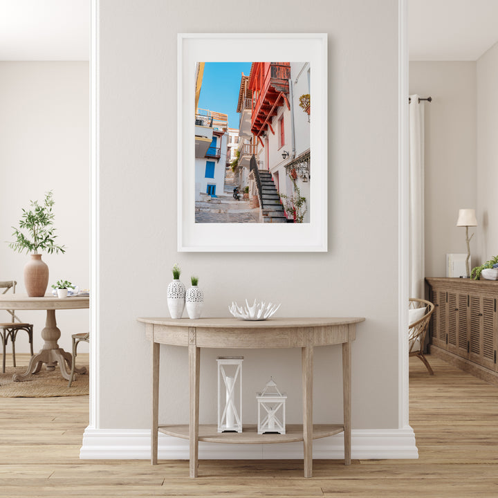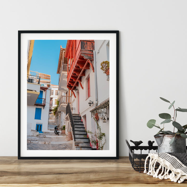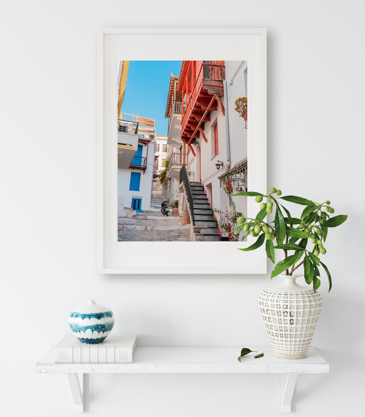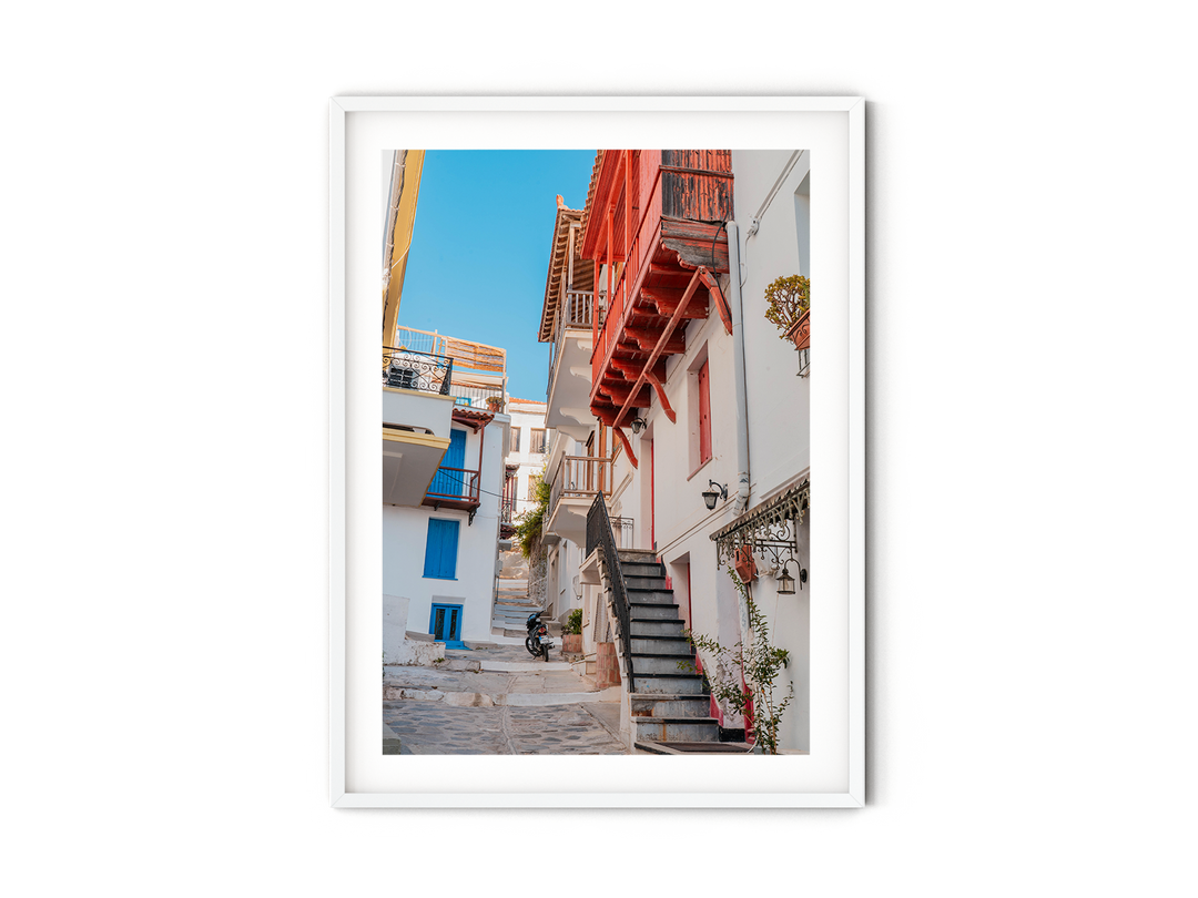 Walking through the streets of Skopelos Town, you can’t help but notice the vibrant wooden balconies that add a splash of color to the whitewashed houses. Painted in shades of blue, red, and green, these traditional balconies reflect the island’s character — simple yet full of life. Some are adorned with potted plants, others with drying laundry, giving a glimpse into daily life on the island. This photograph captures the charm of Skopelos’s architecture, where history and personality blend seamlessly. A perfect piece for those who appreciate the details of island living and Mediterranean design.