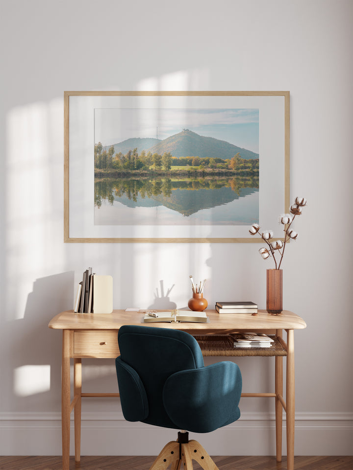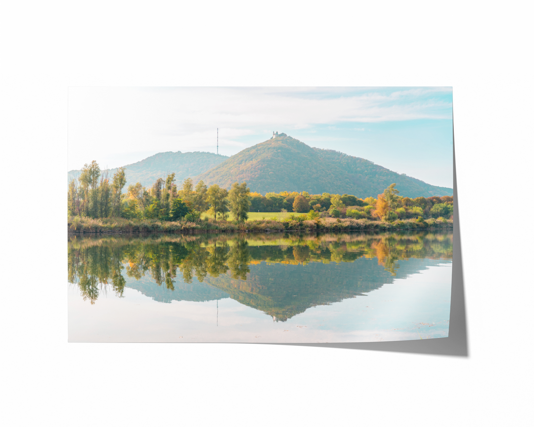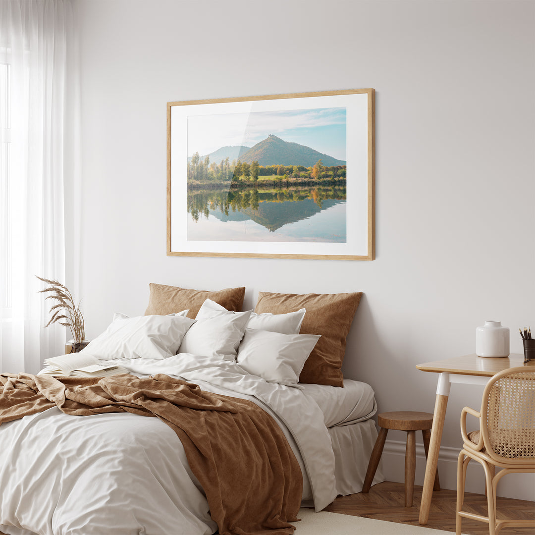 Immerse your home in the serene beauty of this fine art photography print of a peaceful lake. This fine art print captures the tranquility of a calm fall landscape, where green mountains mirror in the still waters. A perfect addition to your nature-themed country style decor, this wall art print brings the peaceful vibes of the countryside into your home. Elevate your surroundings with the timeless beauty of this picturesque scene, creating a soothing atmosphere that invites relaxation and connection with nature.