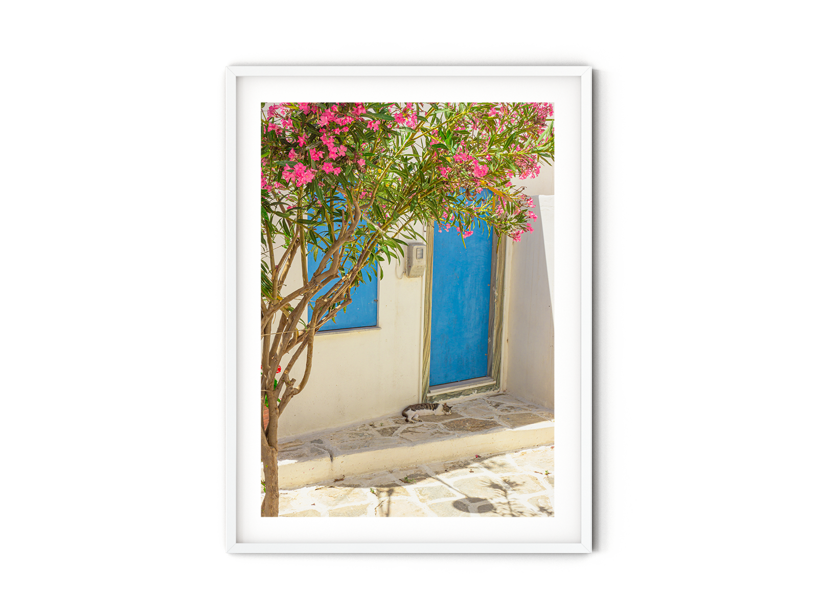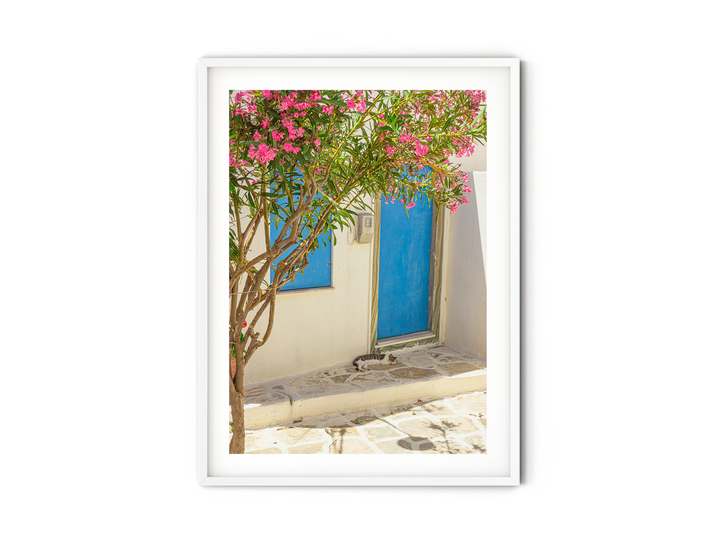 Capture the serene beauty of the Greek island of Paros with this beautiful fine art photography print. Featuring a charming cat peacefully slumbering under the delicate branches of a pink oleander, framed by a vibrant blue door, this photograph embodies tranquility and the essence of Mediterranean life. The composition expertly balances the contrasting colors, creating a visually stunning scene that will add a touch of elegance to any space. Display this stunning fine art print in your home or office to bring the enchantment of Paros into your daily life and evoke a sense of calm and serenity wherever you go.