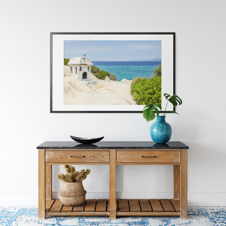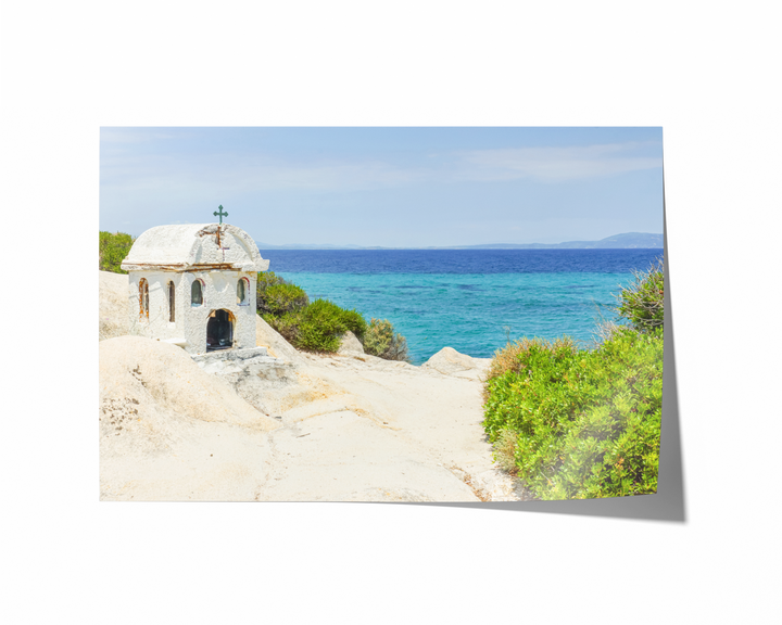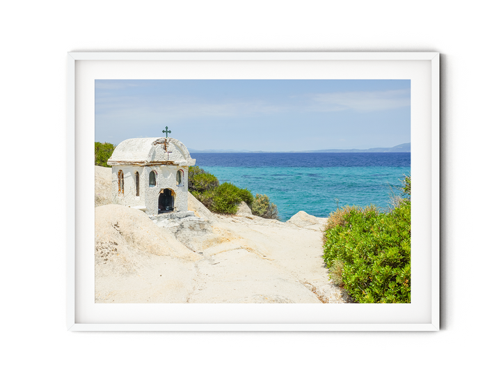 This stunning coastal print transports you the tranquil and picturesque coast of the Halkidiki peninsula in Greece. Featuring a small white chapel set against the backdrop of the glistening turquoise sea of the Aegean, this print perfectly captures the atmosphere of summertime on the Greek coast. This coastal-themed art print is the ideal addition to any Mediterranean style decor. Whether you're looking to create a coastal oasis in your bedroom or a cozy nook in your living room, this print will bring a touch of effortless elegance to any space. It also makes for a great addition to any Greece themed gallery wall.