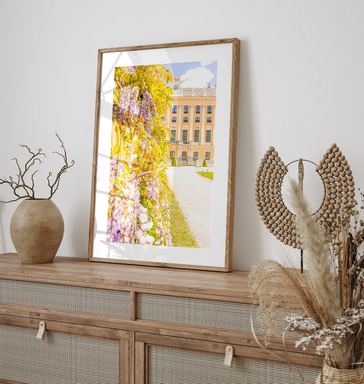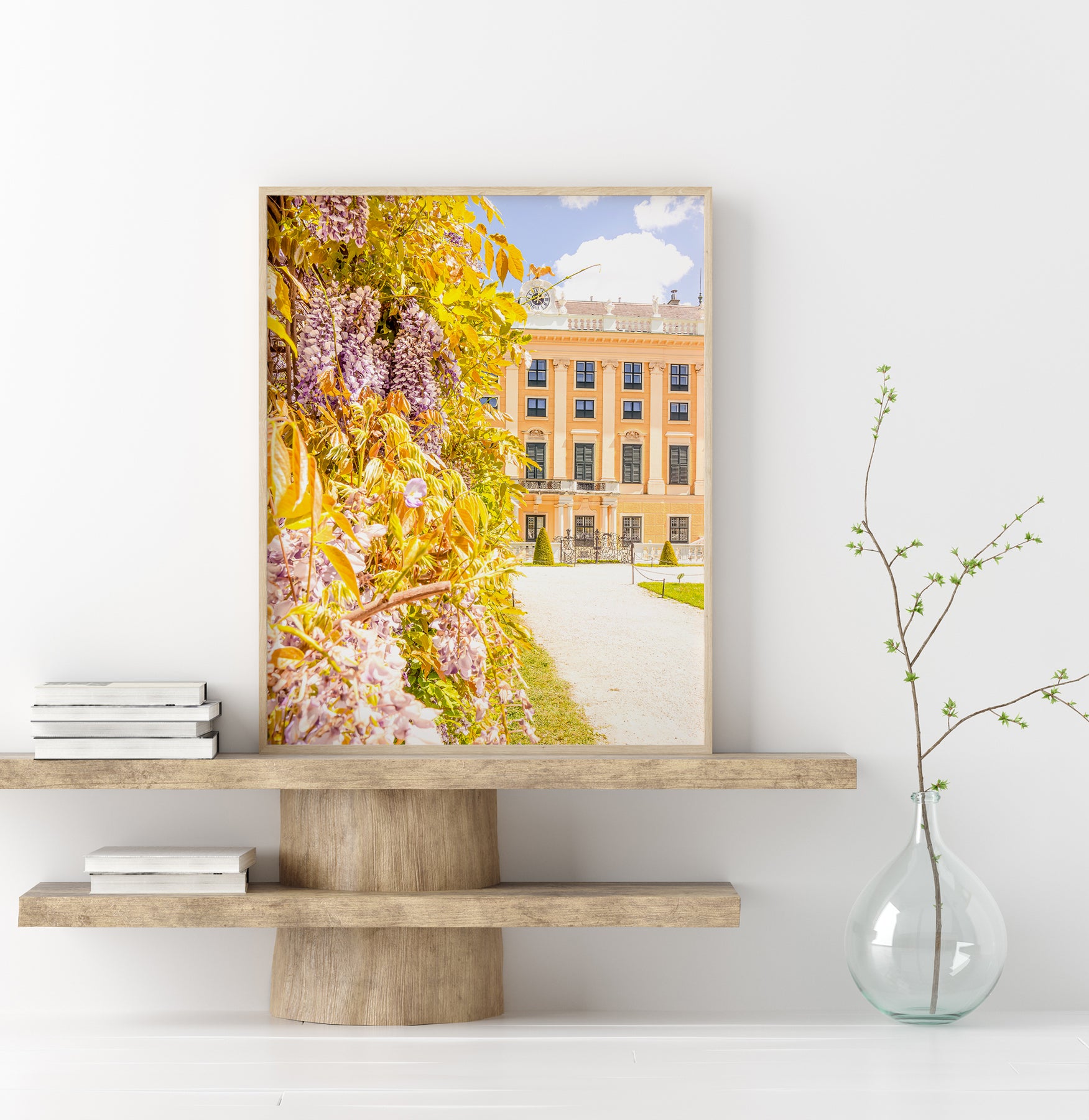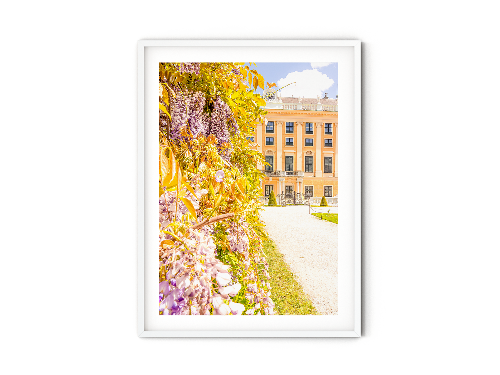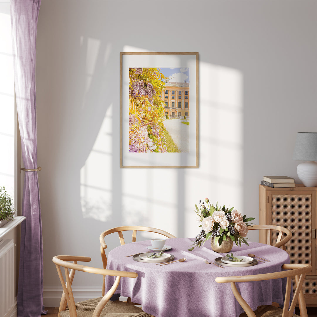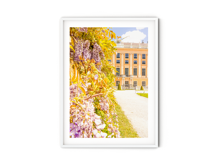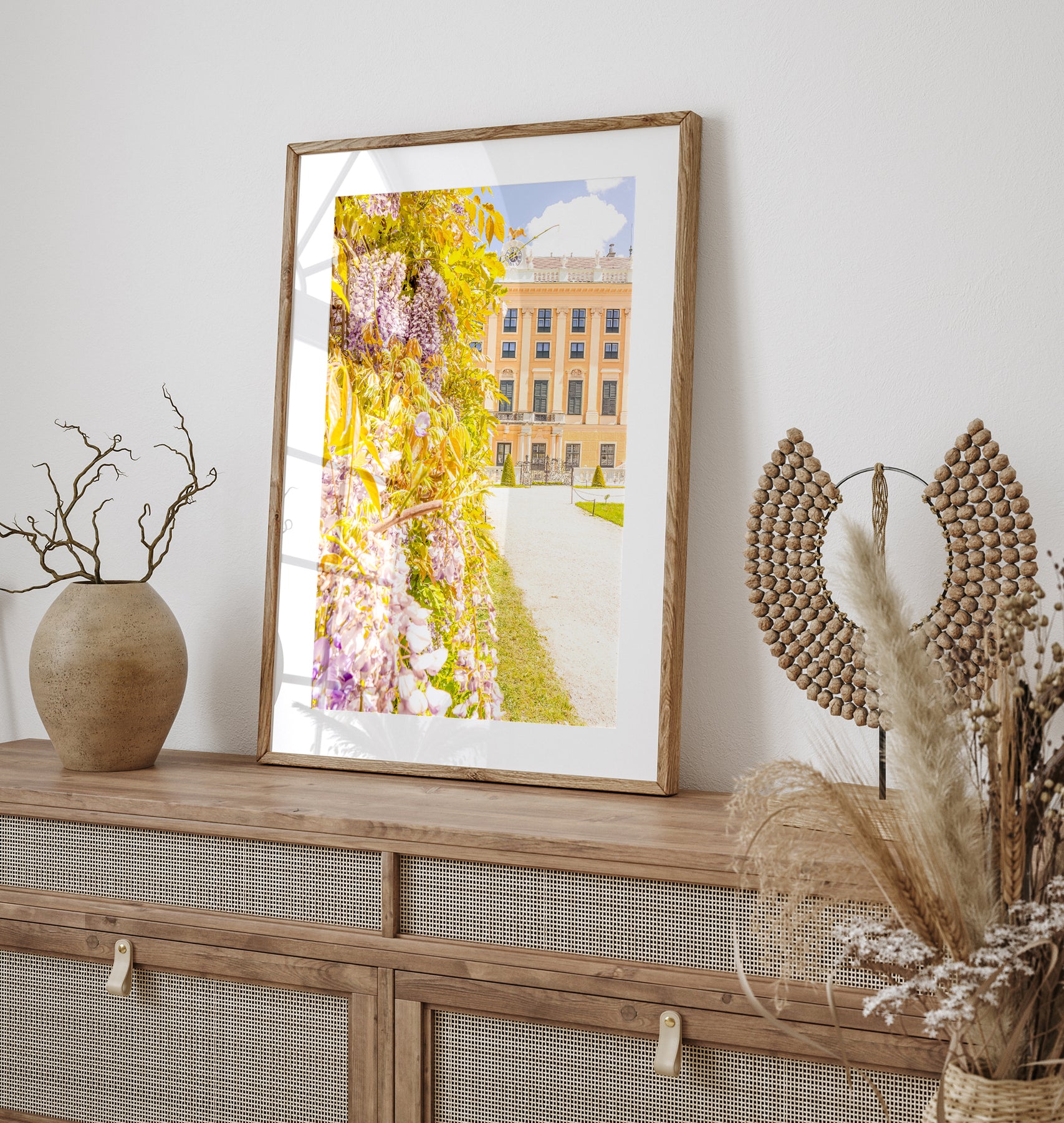 Capture the enchanting beauty of Vienna's Schönbrunn Palace in spring with this stunning travel photography print. The fragrant wisteria flowers in the foreground set a magical scene, while the palace itself, boasting 1,441 rooms and a rich Habsburg history, graces the background. A UNESCO World Heritage Site since 1996, this Schönbrunn Palace art print invites the grandeur and magic of Austria's imperial past into your home.