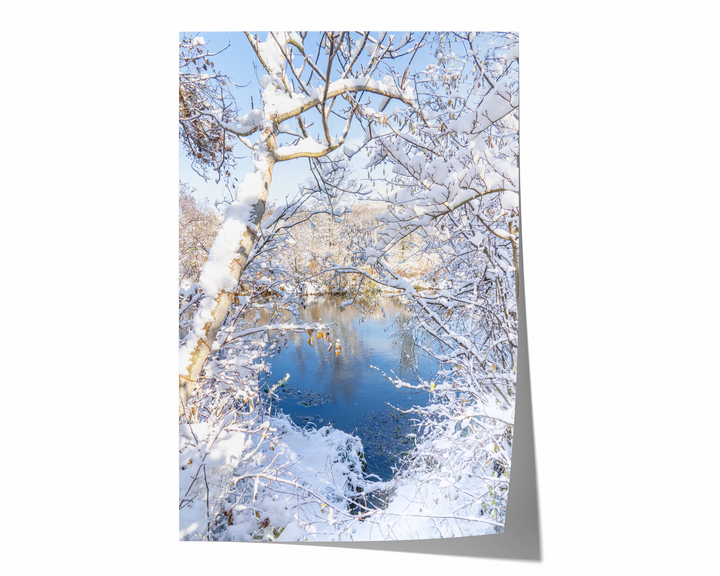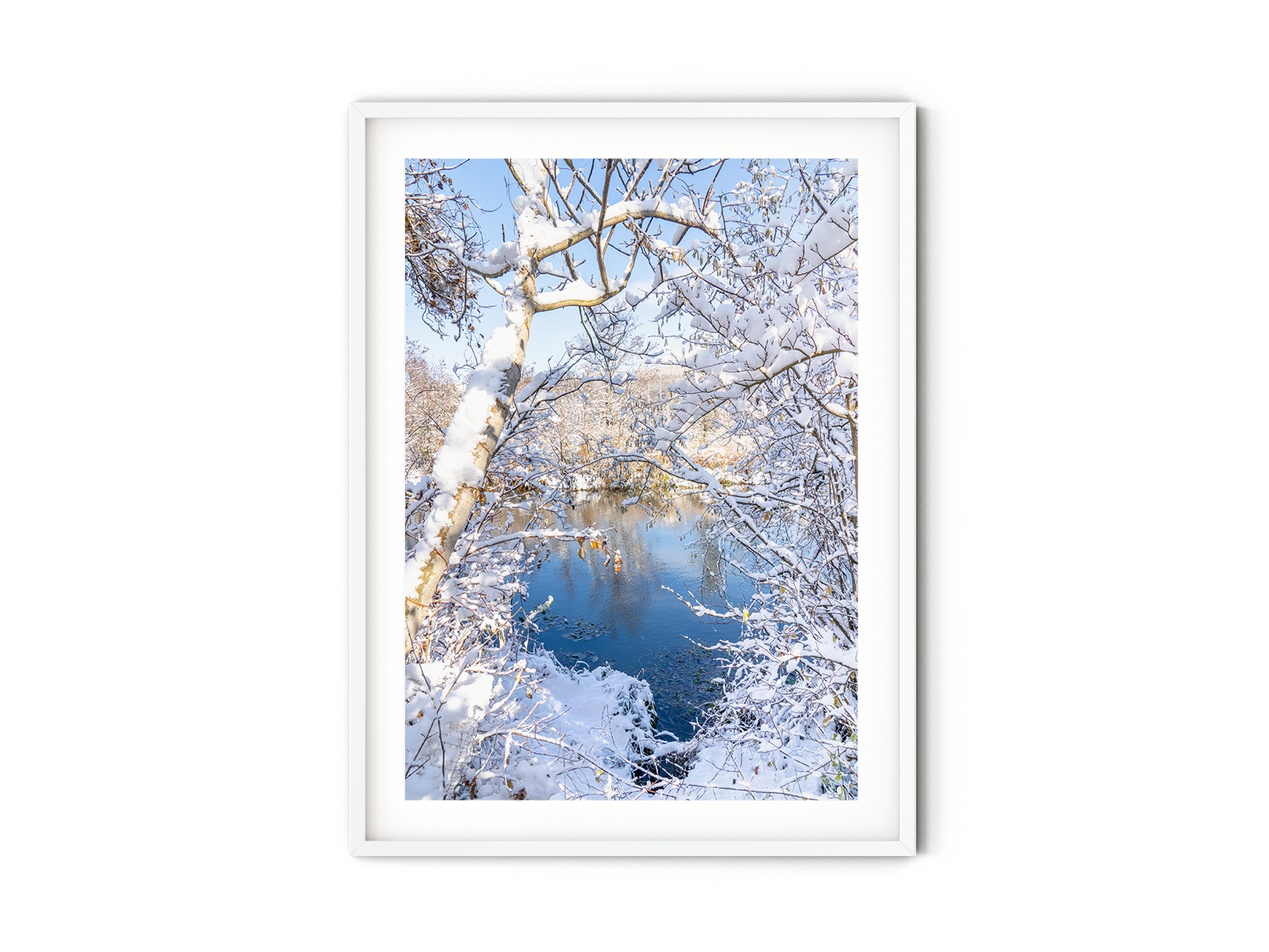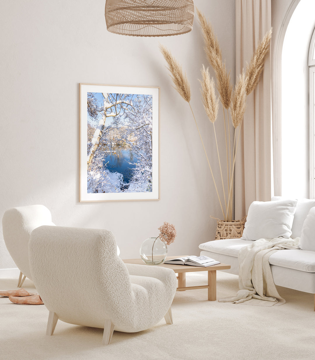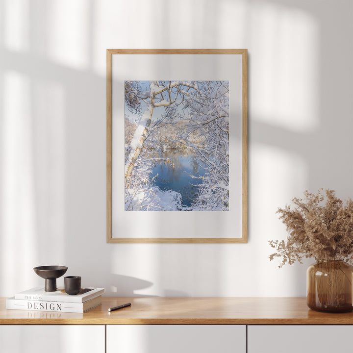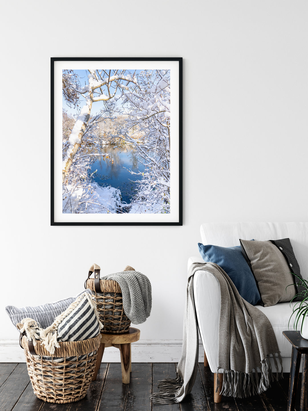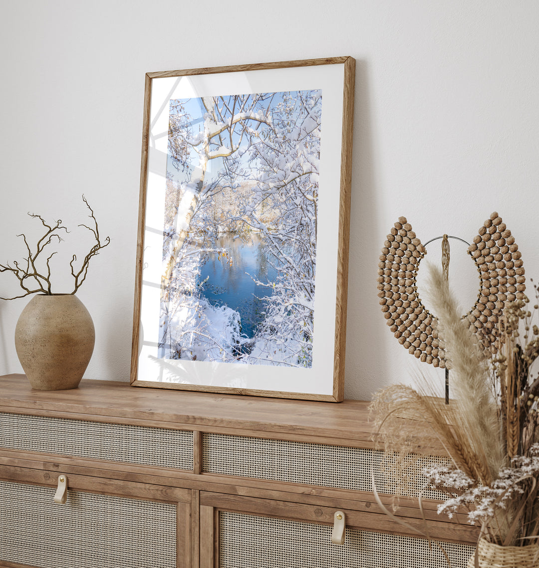 Step into a winter wonderland with this captivating fine art photography print. The tranquil scene captures the magic of snow-covered trees standing in silent majesty by a calm lake. The pristine white landscape and the stillness of the water evoke a sense of peace and serenity. Bring the enchantment of winter into your home, creating a cozy and contemplative atmosphere. Elevate your space with the timeless beauty of nature through this exquisite snowscape wall art.