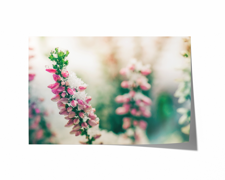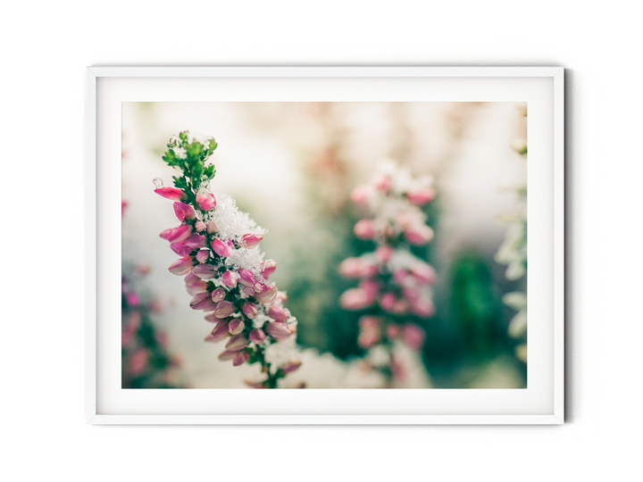 Capture the serene beauty of snow-covered pink heather with this stunning fine art photography print. The delicate pink blooms, blanketed in a soft layer of snow, create a captivating and tranquil scene. Add a touch of winter's charm to your decor and embrace the delicate elegance of nature with this stunning artwork, perfect for those who appreciate the serene beauty of winter.
